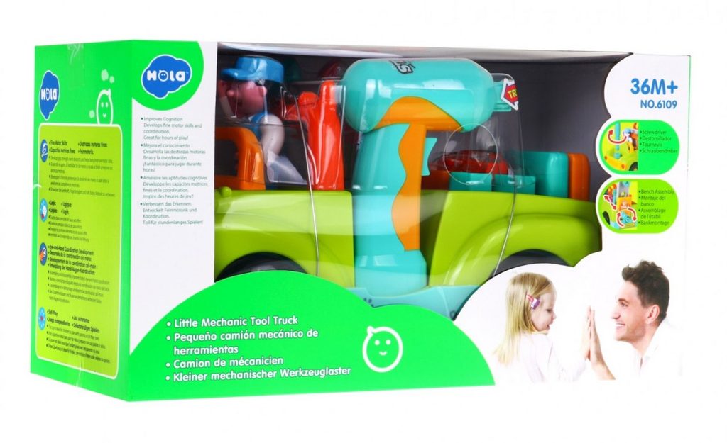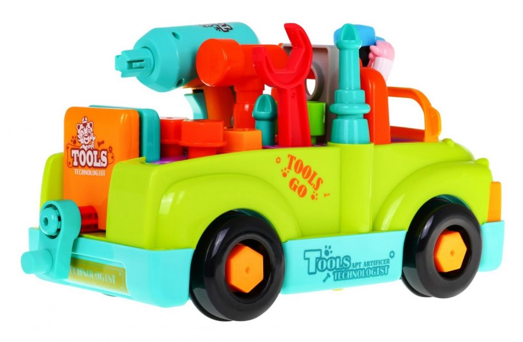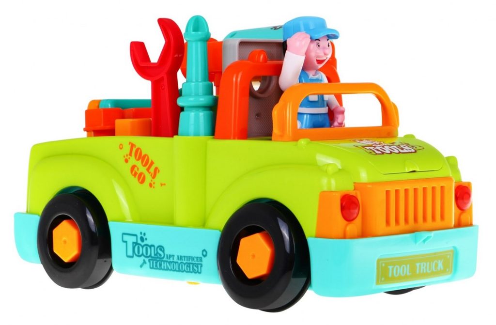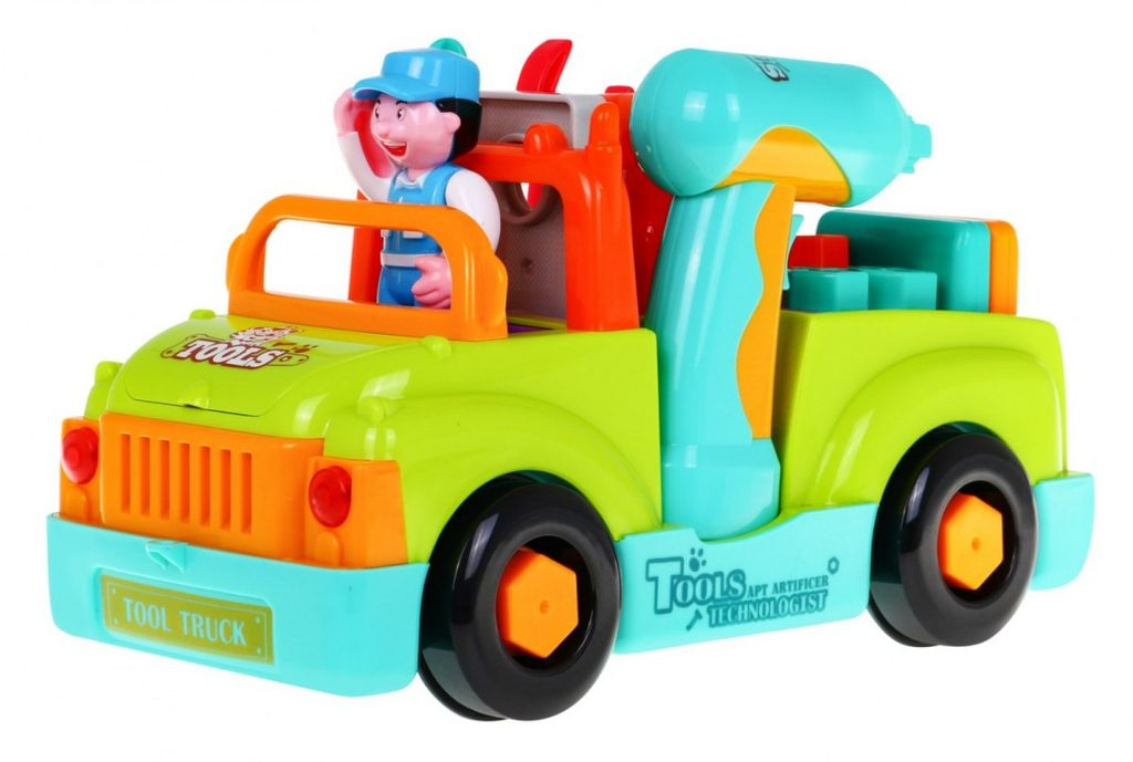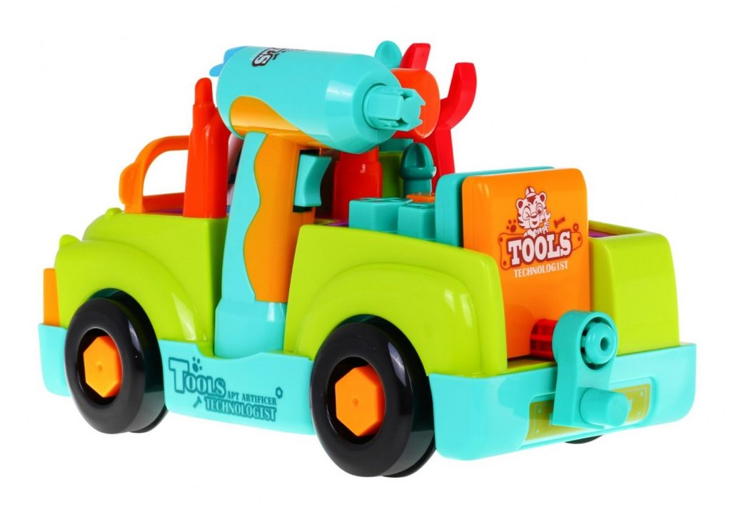 Multifunkční autíčko se zvuky a světly Huile Toys Tool Truck je ideální hračkou pro ty nejmenší děti. Jezdí buď samostatně na baterie kdy směr mění nárazem na překážku nebo ho lze tahat šnůrkou. Při jízdě svítí přední světla a hrají melodie. Ty se dají vypnout. Autíčko má odnímatelné kola a vyjímatelný motor. Součástí je vrtačka na baterie se dvěmi nástavci, klíč, šrouby, kladívko, šroubovák a postavička řidiče. Autíčko umožní dítěti rozvíjet hmat, zrak, motoriku a sluch. Hračka je určena pro děti od 36 měsíců věku.