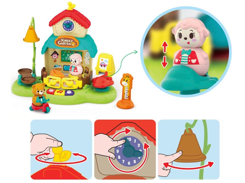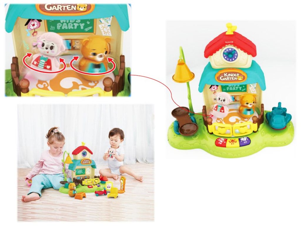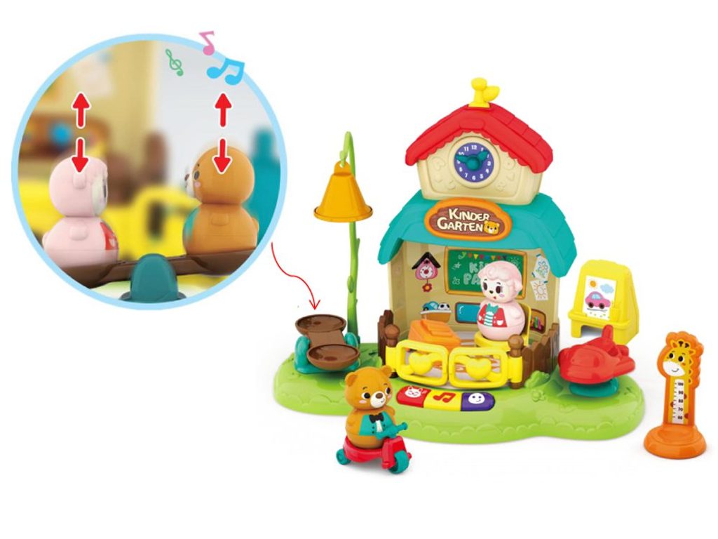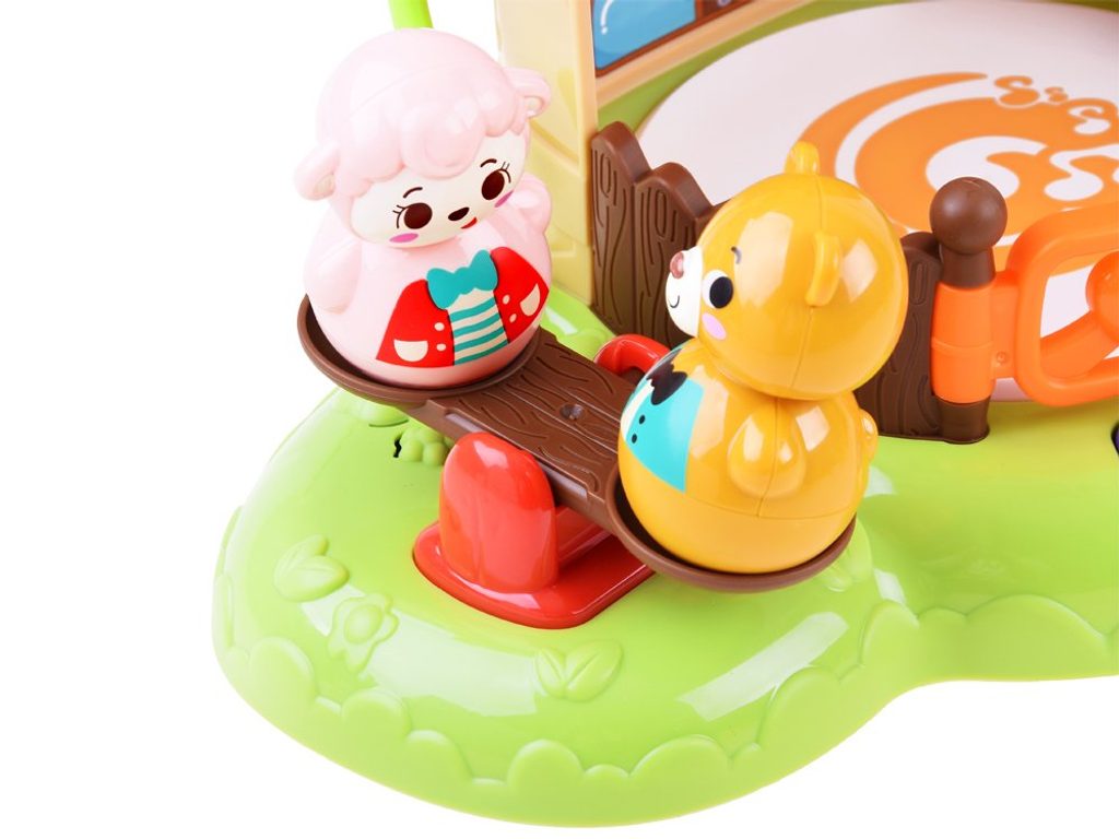 Interaktivní multifunkční domeček se zvuky a světly Huile Toys Jesličky je ideální hračkou pro ty nejmenší děti. Umožní dítěti rozvíjet hmat, zrak, sluch, matematiku a logické myšlení. Domeček má podsvícený parket na kterém tančí medvídek a ovečka. Ty se mohou také otáčet kolem vlastní osy. Tři tlačítka vydávají melodie a zvuky zvířat. Pro ještě větší zábavu je domeček vybavený dalším příslušenstvím : tříkolkou, houpačkou, letadýlkem, tabulí, psacím stolem. Hračka je určena pro děti od 24 měsíců věku.