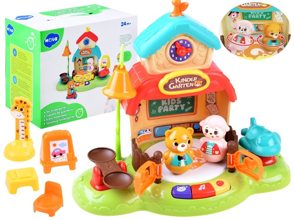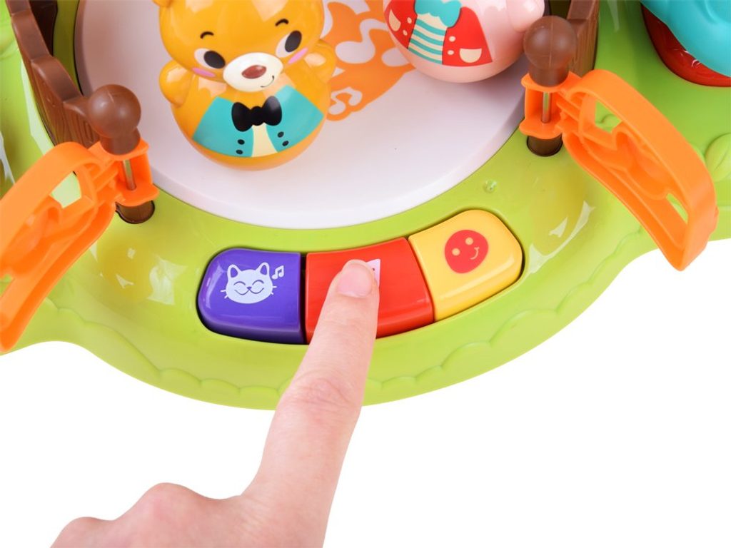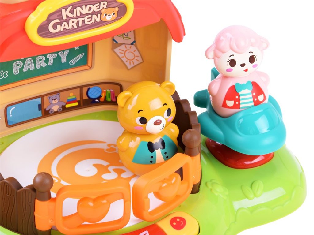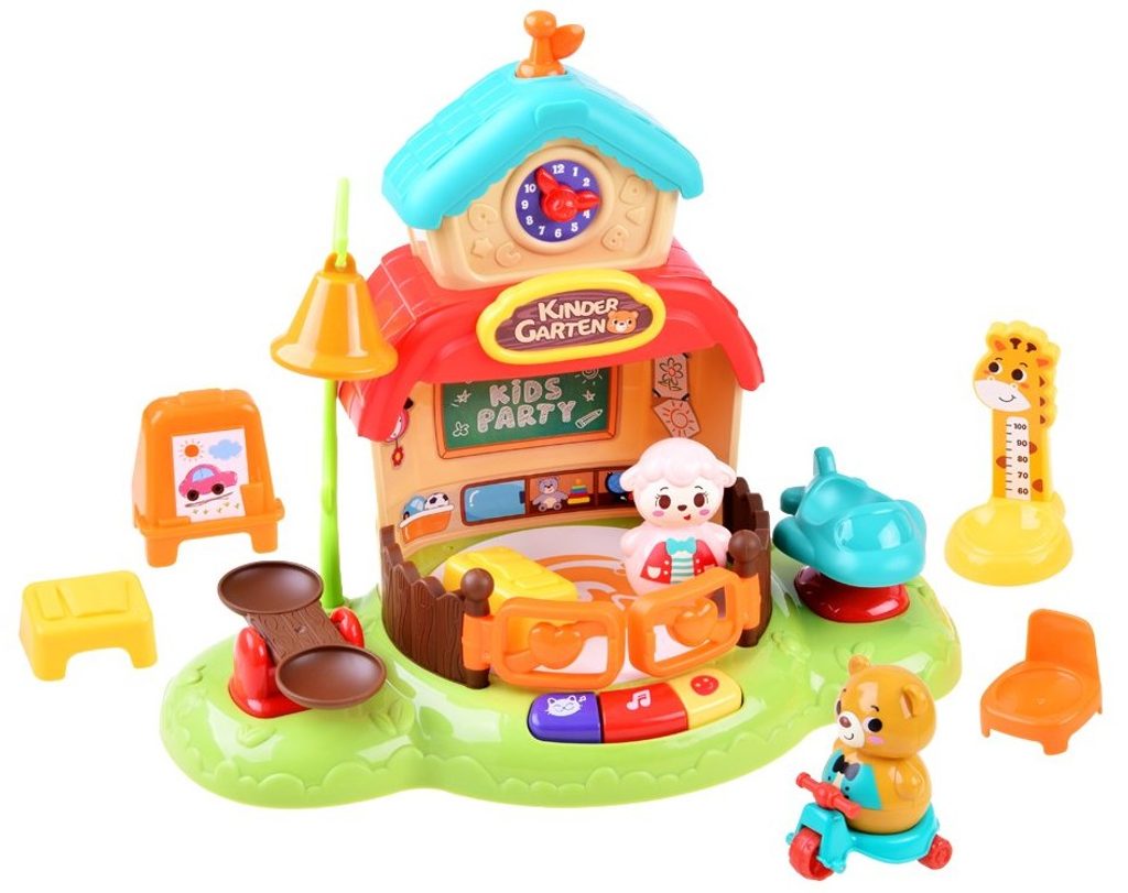 Interaktivní multifunkční domeček se zvuky a světly Huile Toys Jesličky je ideální hračkou pro ty nejmenší děti. Umožní dítěti rozvíjet hmat, zrak, sluch, matematiku a logické myšlení. Domeček má podsvícený parket na kterém tančí medvídek a ovečka. Ty se mohou také otáčet kolem vlastní osy. Tři tlačítka vydávají melodie a zvuky zvířat. Pro ještě větší zábavu je domeček vybavený dalším příslušenstvím : tříkolkou, houpačkou, letadýlkem, tabulí, psacím stolem. Hračka je určena pro děti od 24 měsíců věku.