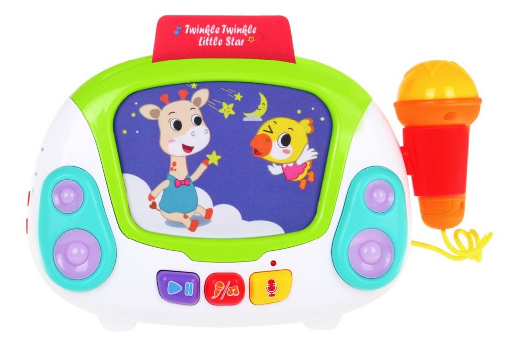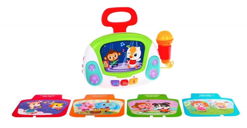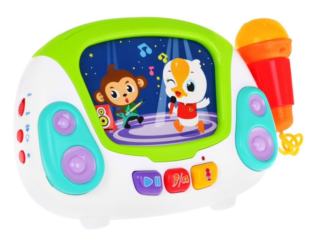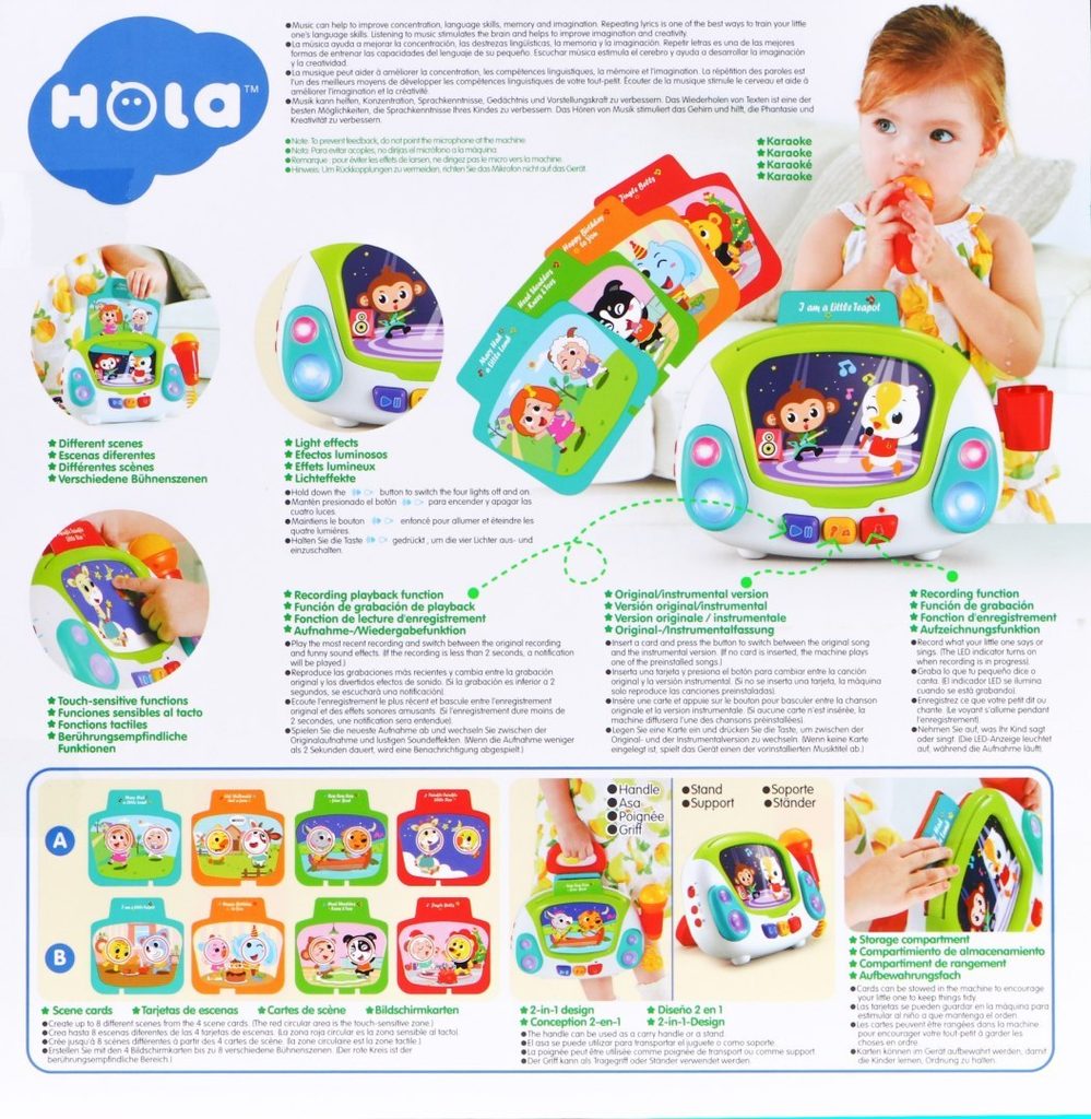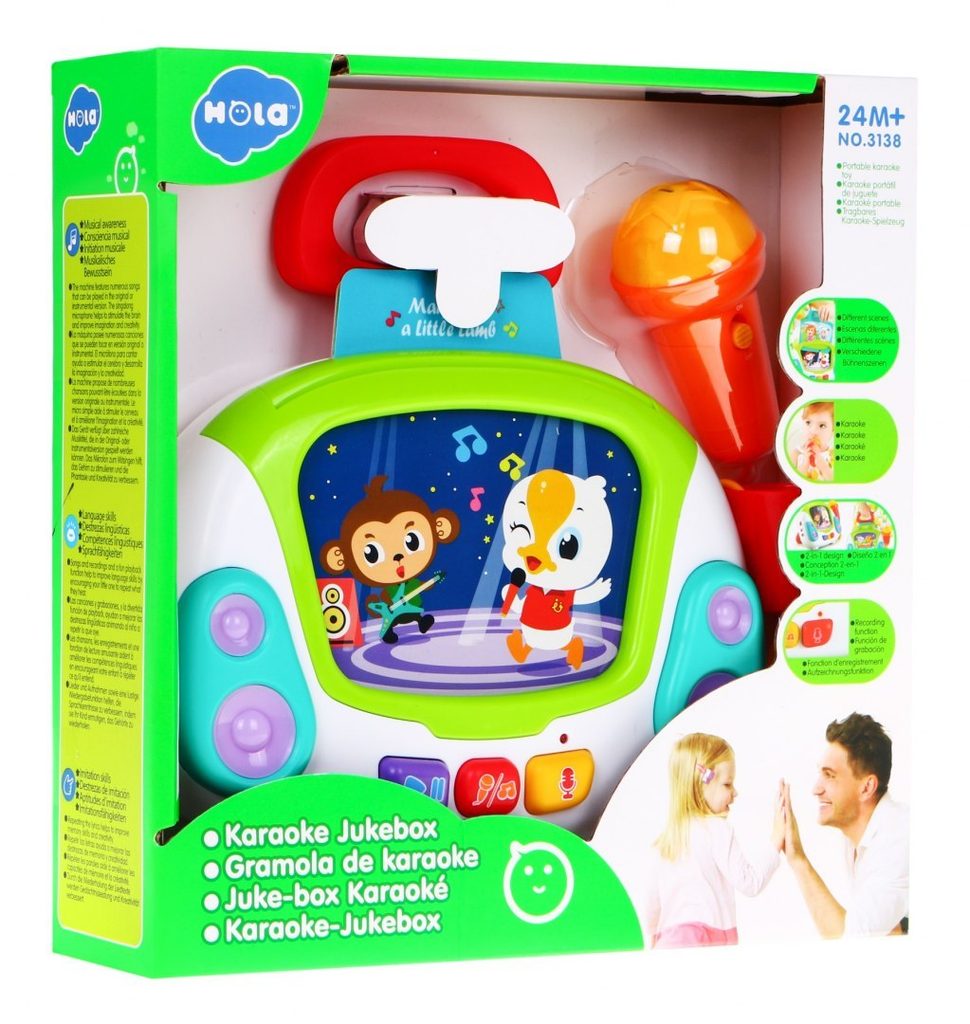 Interaktivní multifunkční Karaoke se zvuky a světly Huile Toys je ideální hračkou pro ty nejmenší děti. Umožní dítěti rozvíjet hmat, zrak, sluch, angličtinu a logické myšlení. Přední panel má v zadní části praktickou opěrku a v horní části úchyt. Hračku lze tedy snadno přenášet nebo u hry opřít pomocí opěrky. Karaoke je vybaveno funkčním mikrofonem, tlačítkem nahrávaní a přehrávaní a světýlky blikajícími v rytmu melodií. Nahoře je umístěn prostor ve kterém jsou uloženy barevné karty s obrázky a po vložení se vždy spustí jiná melodie. Hračka je vybavena regulací hlasitosti a tlačítkem zapnuto/vypnuto. Je určena pro děti od 24 měsíců věku.