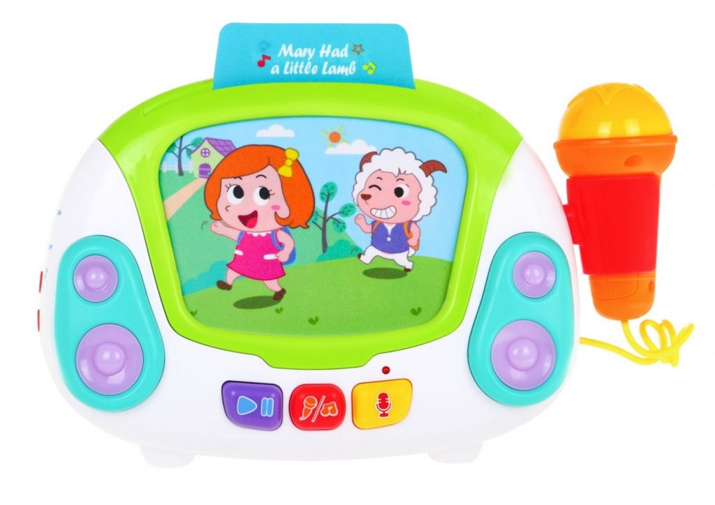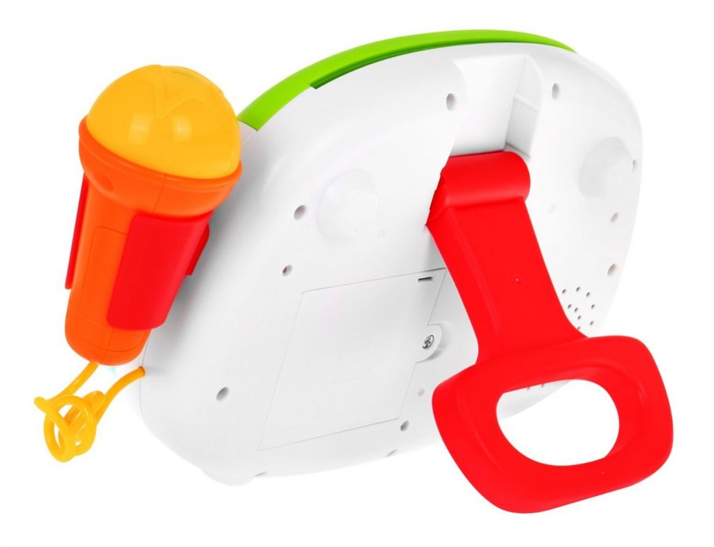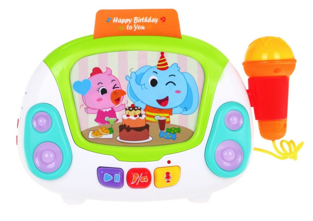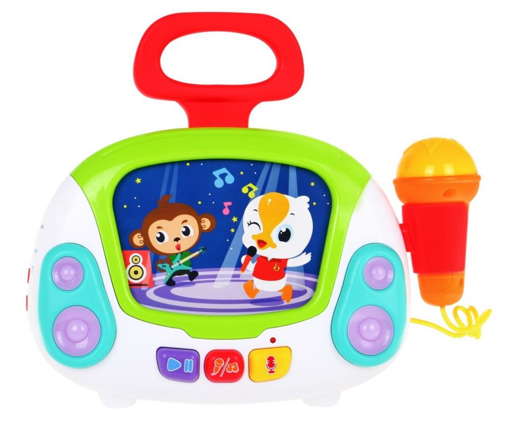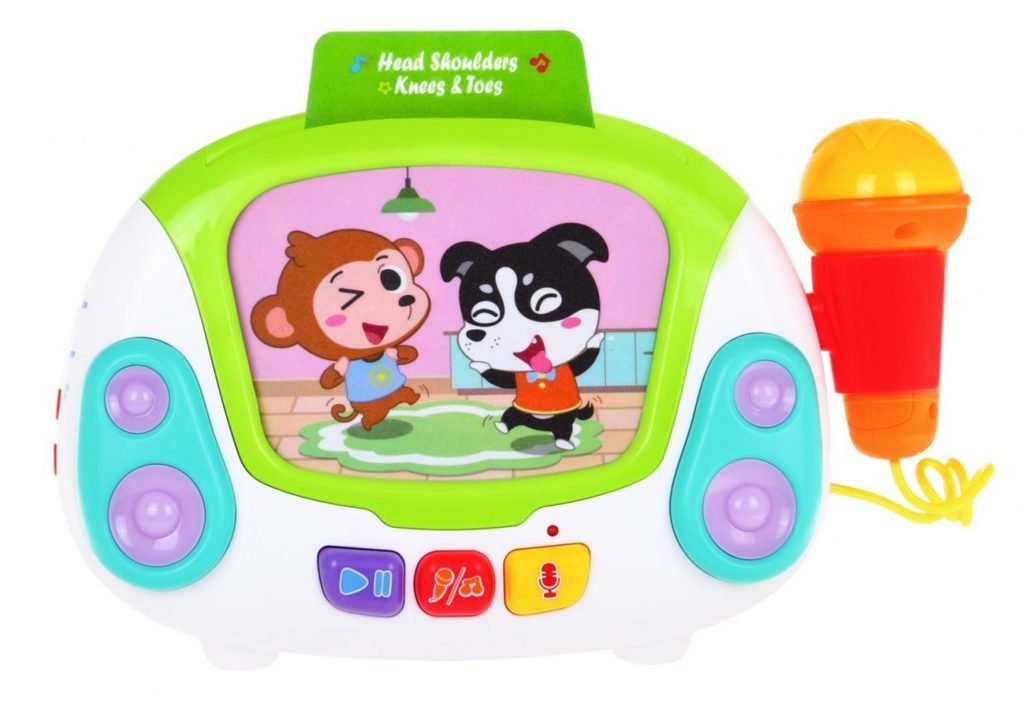 Interaktivní multifunkční Karaoke se zvuky a světly Huile Toys je ideální hračkou pro ty nejmenší děti. Umožní dítěti rozvíjet hmat, zrak, sluch, angličtinu a logické myšlení. Přední panel má v zadní části praktickou opěrku a v horní části úchyt. Hračku lze tedy snadno přenášet nebo u hry opřít pomocí opěrky. Karaoke je vybaveno funkčním mikrofonem, tlačítkem nahrávaní a přehrávaní a světýlky blikajícími v rytmu melodií. Nahoře je umístěn prostor ve kterém jsou uloženy barevné karty s obrázky a po vložení se vždy spustí jiná melodie. Hračka je vybavena regulací hlasitosti a tlačítkem zapnuto/vypnuto. Je určena pro děti od 24 měsíců věku.