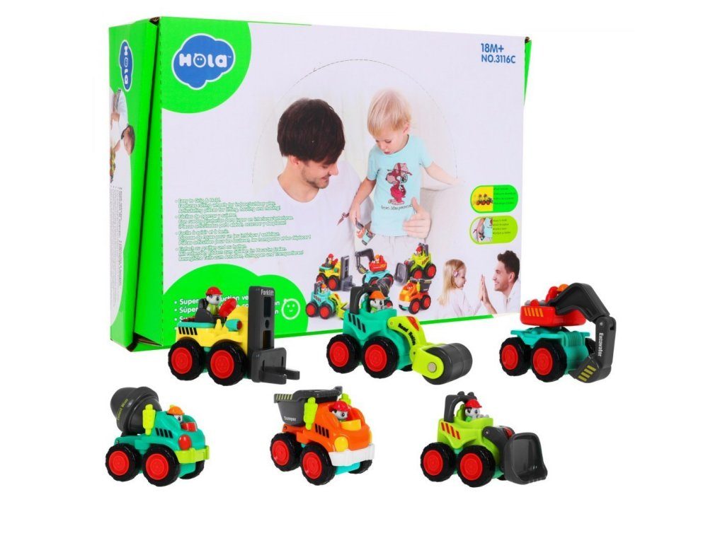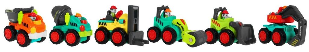 Huile Toys sestava 6 pohyblivých stavebních autíček podporuje u nejmenších dětí představivost a zlepšuje motoriku. Všechny autíčka mají pohyblivé části a díky svým rozměrům se vejdou do každé dětské kapsy. V sestavě naleznete válec, rypadlo, vysokozdvižný vozík, míchačku, buldozer a nákladní auto. Autíčka jsou vyrobena z kvalitního dřeva bez ostrých hran. Hračka je určena pro děti od 18 měsíců věku.