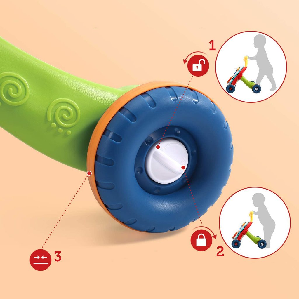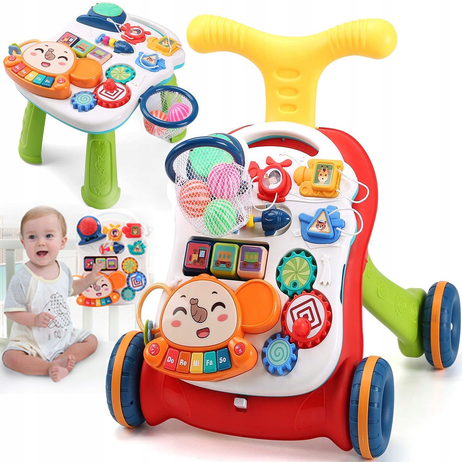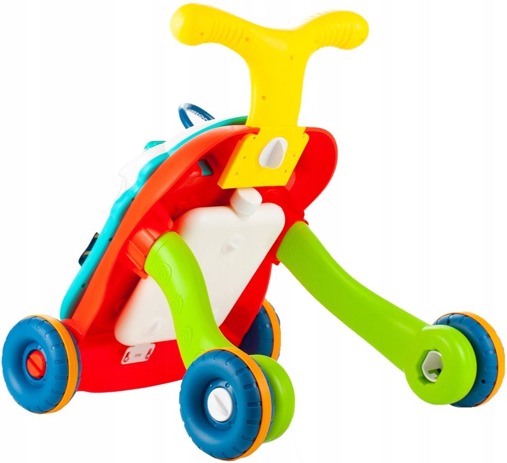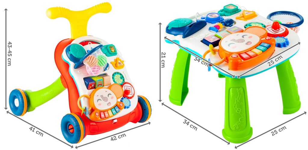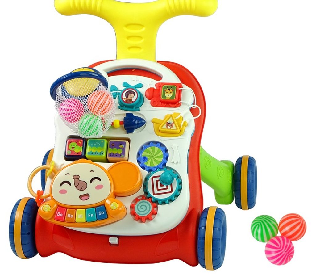 Dětské multifunkční chodítko Music Stroller 2v1 pro ty nejmenší děti, edukační centrum. Lze ho využít jako samostatné chodítko nebo hudební stoleček pro sedící děti. Panel je vybaven odnímatelným piánem ve tvaru sloníka, otočnými kostičkami, košíkovou se 3 míčky, otáčivými ozubenými kolečky a spoustou dalších zábavných prvků. V horní části chodítka je umístěn držák pomocí kterého dítě snadno udrží rovnováhu a nespadne na zem. Kolečka mají protiskluzovou úpravu a brzdu. Určeno pro děti od 12 měsíců věku a je ideální hračkou pro nauku prvních krůčků.