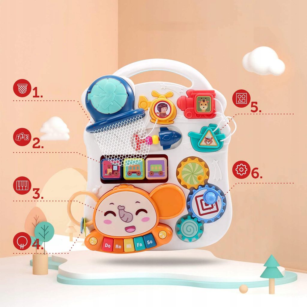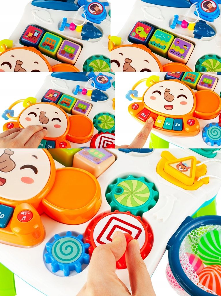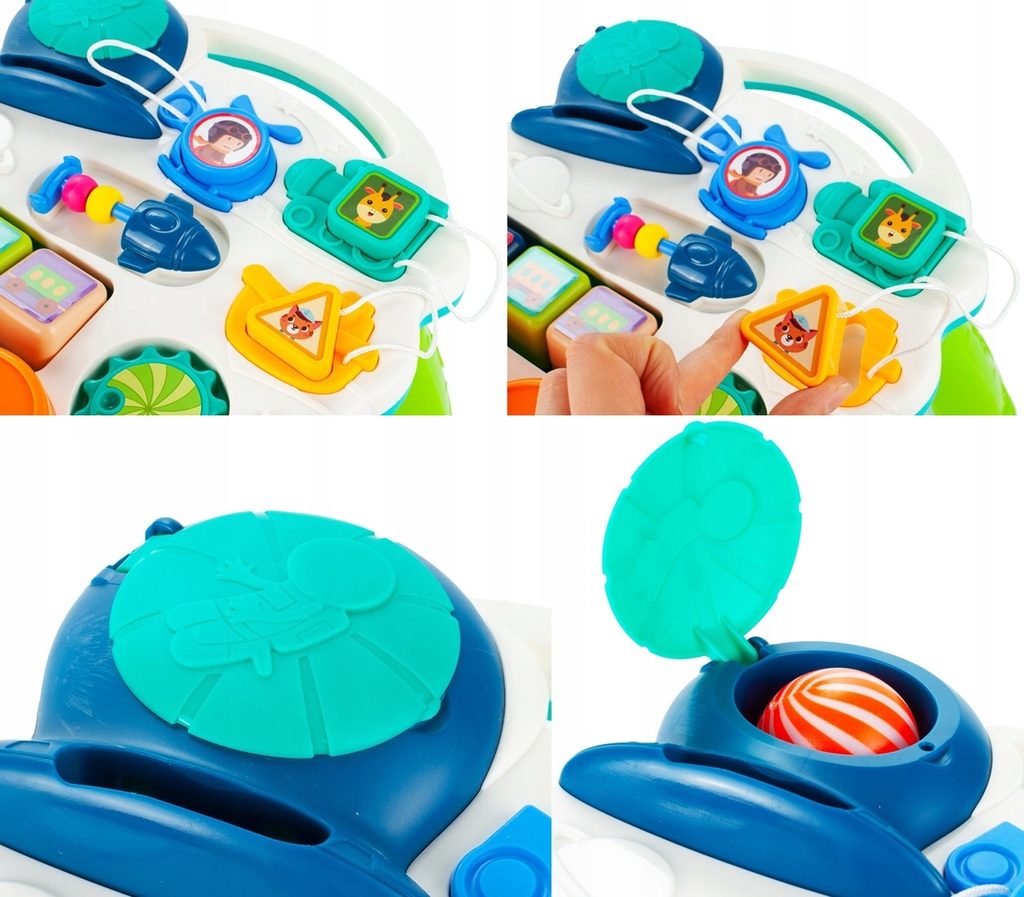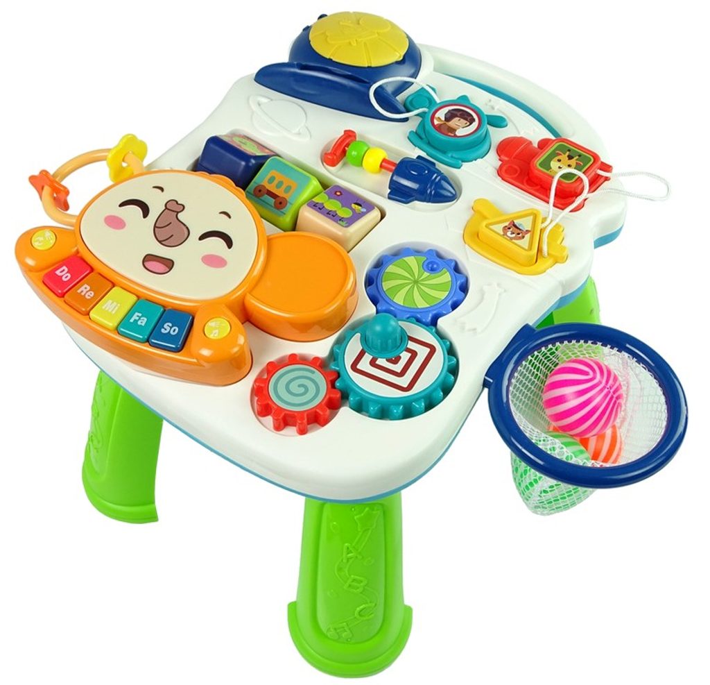 Dětské multifunkční chodítko Music Stroller 2v1 pro ty nejmenší děti, edukační centrum. Lze ho využít jako samostatné chodítko nebo hudební stoleček pro sedící děti. Panel je vybaven odnímatelným piánem ve tvaru sloníka, otočnými kostičkami, košíkovou se 3 míčky, otáčivými ozubenými kolečky a spoustou dalších zábavných prvků. V horní části chodítka je umístěn držák pomocí kterého dítě snadno udrží rovnováhu a nespadne na zem. Kolečka mají protiskluzovou úpravu a brzdu. Určeno pro děti od 12 měsíců věku a je ideální hračkou pro nauku prvních krůčků.