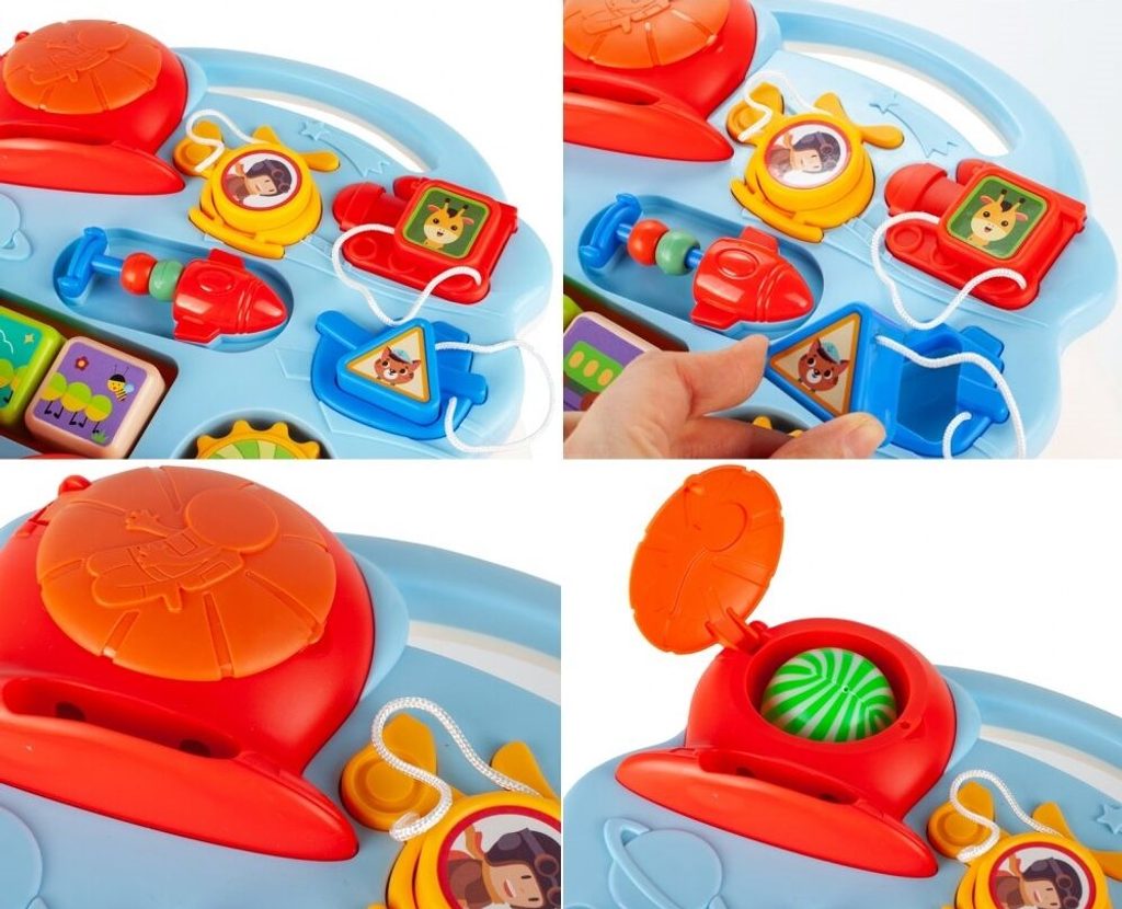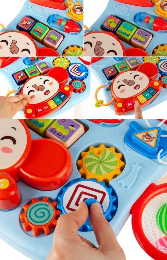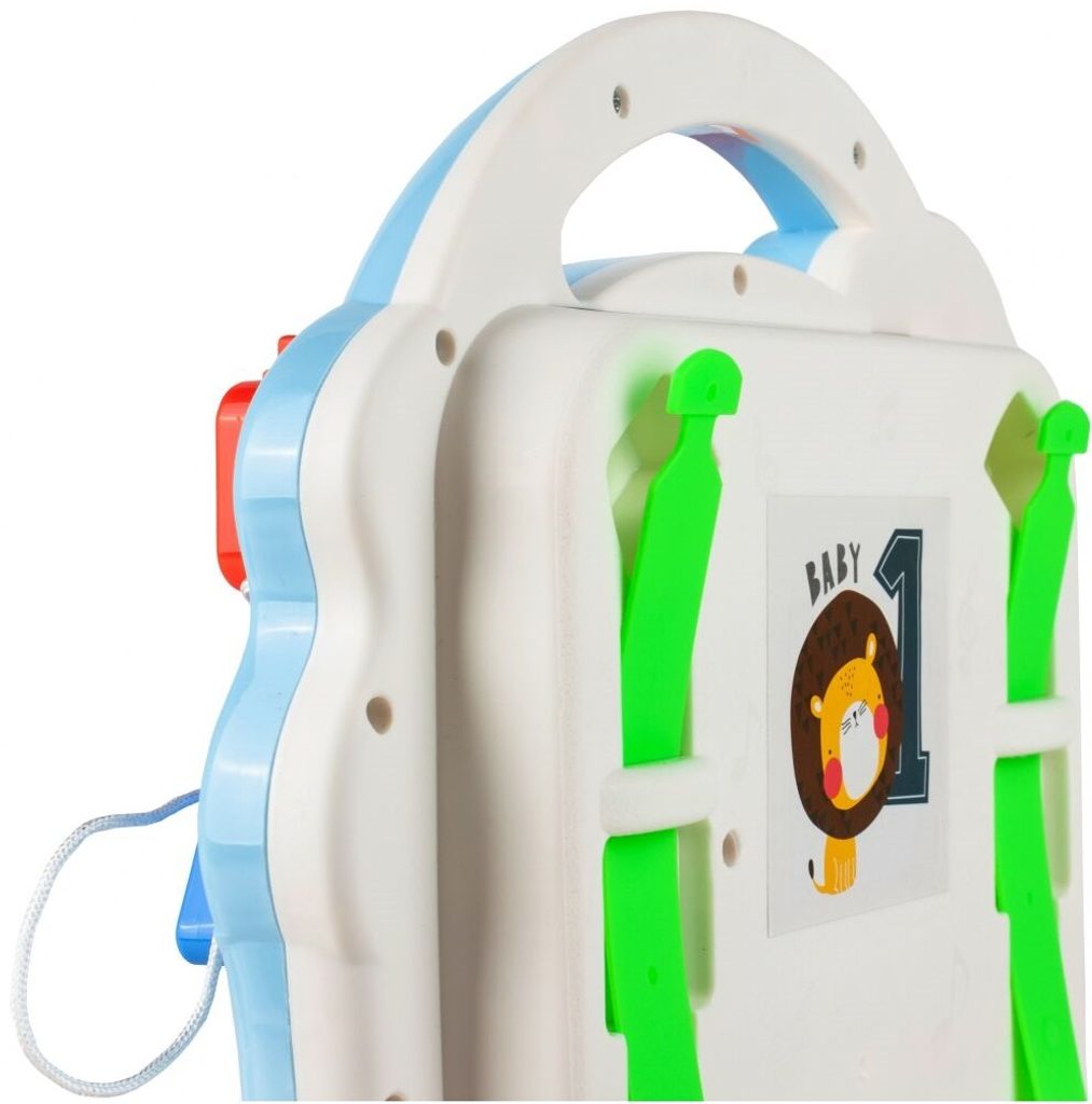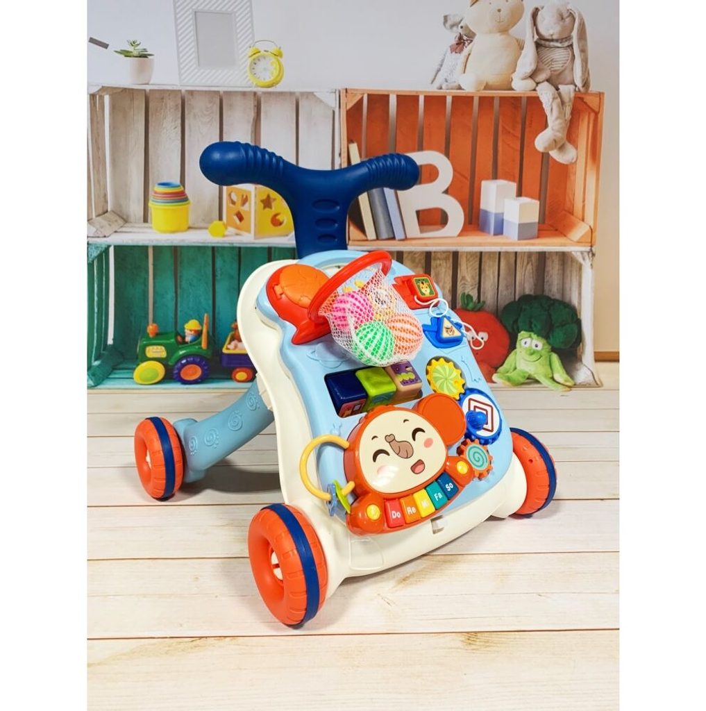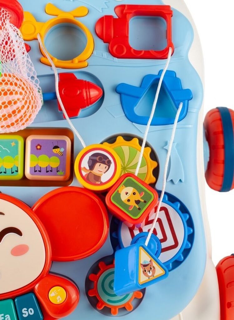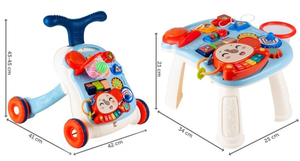 Dětské multifunkční chodítko Music Stroller 2v1 pro ty nejmenší děti, edukační centrum. Lze ho využít jako samostatné chodítko nebo hudební stoleček pro sedící děti. Panel je vybaven odnímatelným piánem ve tvaru sloníka, otočnými kostičkami, košíkovou se 3 míčky, otáčivými ozubenými kolečky a spoustou dalších zábavných prvků. V horní části chodítka je umístěn držák pomocí kterého dítě snadno udrží rovnováhu a nespadne na zem. Kolečka mají protiskluzovou úpravu a brzdu. Určeno pro děti od 12 měsíců věku a je ideální hračkou pro nauku prvních krůčků.