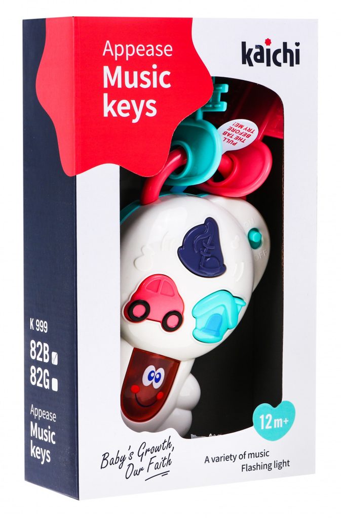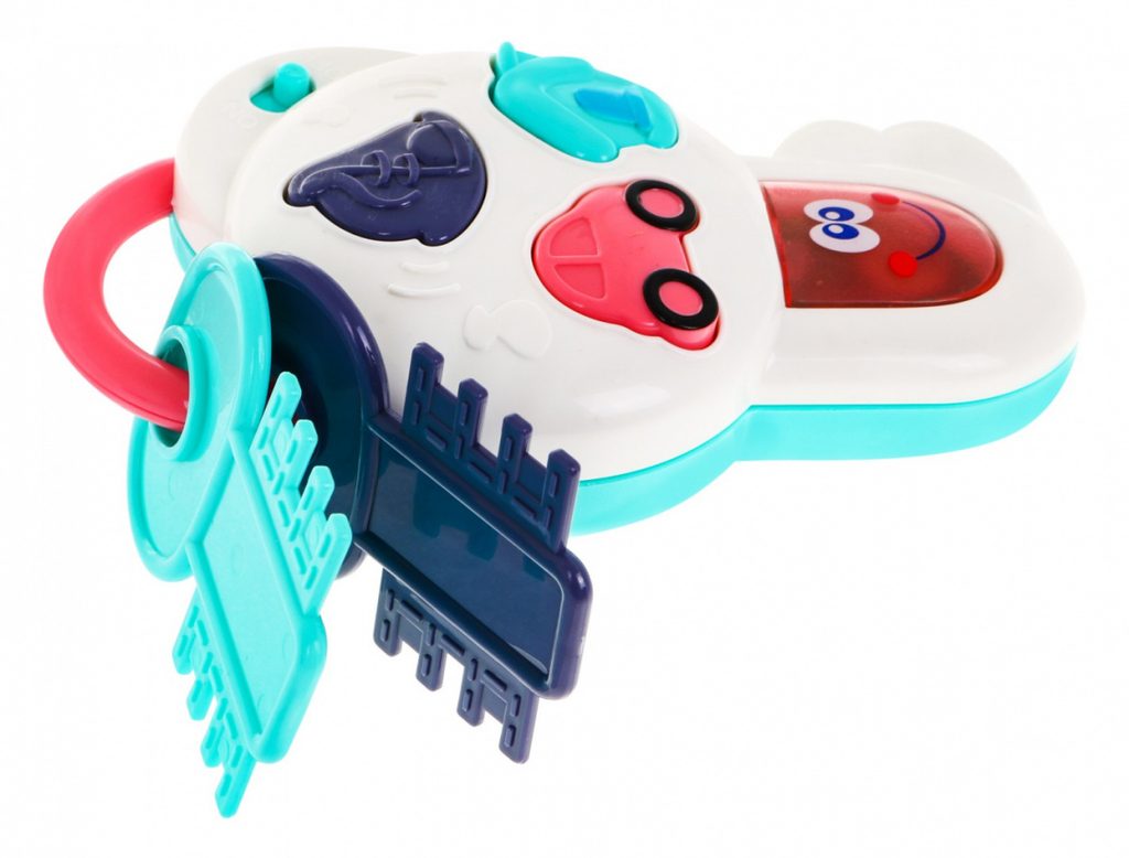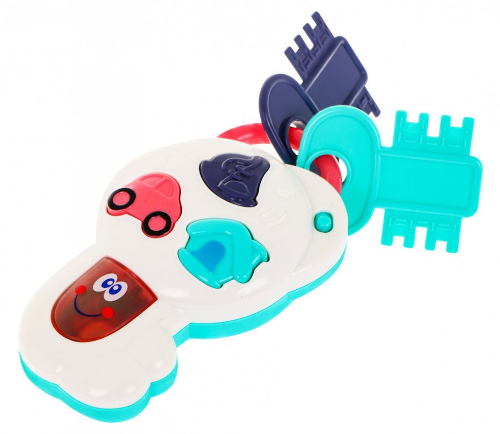 Interaktivní dětské klíče Music Keys jsou určeny pro děti od 12 měsíců věku. Tato hračka má pozitivní vliv na rozvoj sluchového a zrakového vnímání dítěte. Na klíči jsou tři hudební tlačítka: domeček, autíčko a nota. Po stisknutí tlačítka s domečkem uslyšíte hlas zvonku, štěkot pejska, zvuk interkomu a klidnou melodii. Tlačítko autíčka aktivuje zvuk otevírání a zavírání auta, zvuk motoru a veselou melodii .Tlačítko s notou spouští melodie. Každé zmáčknutí navíc doprovází blikající světýlka. Ke klíči jsou také připevněny 2 menší plastové klíče.