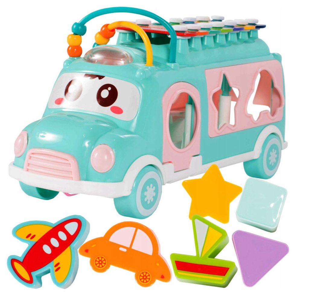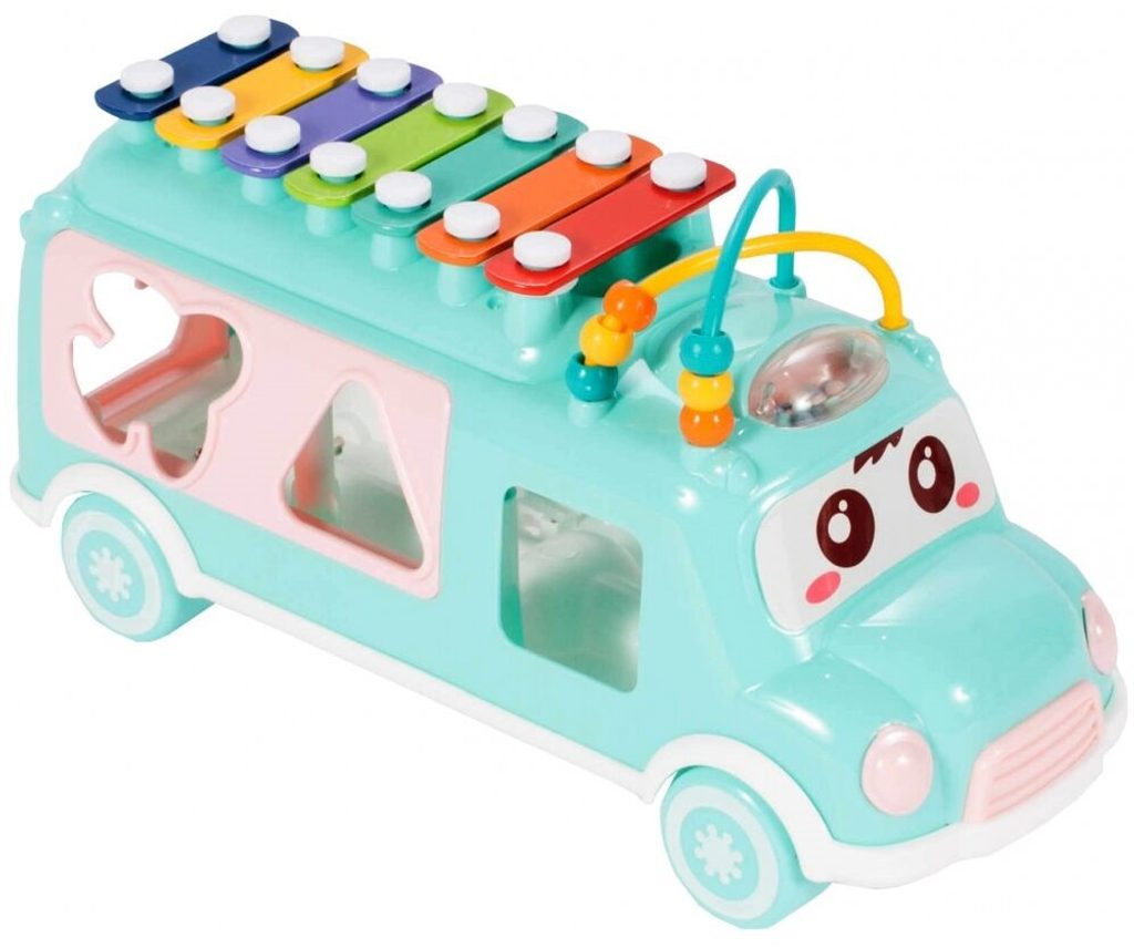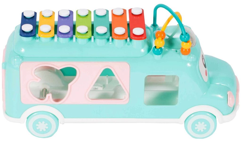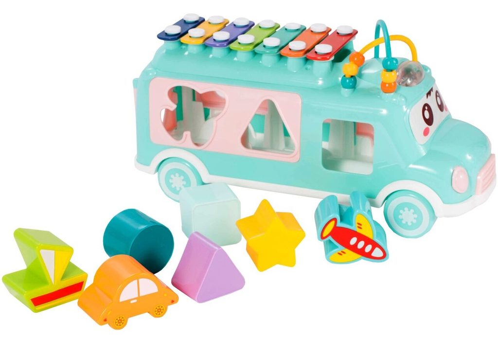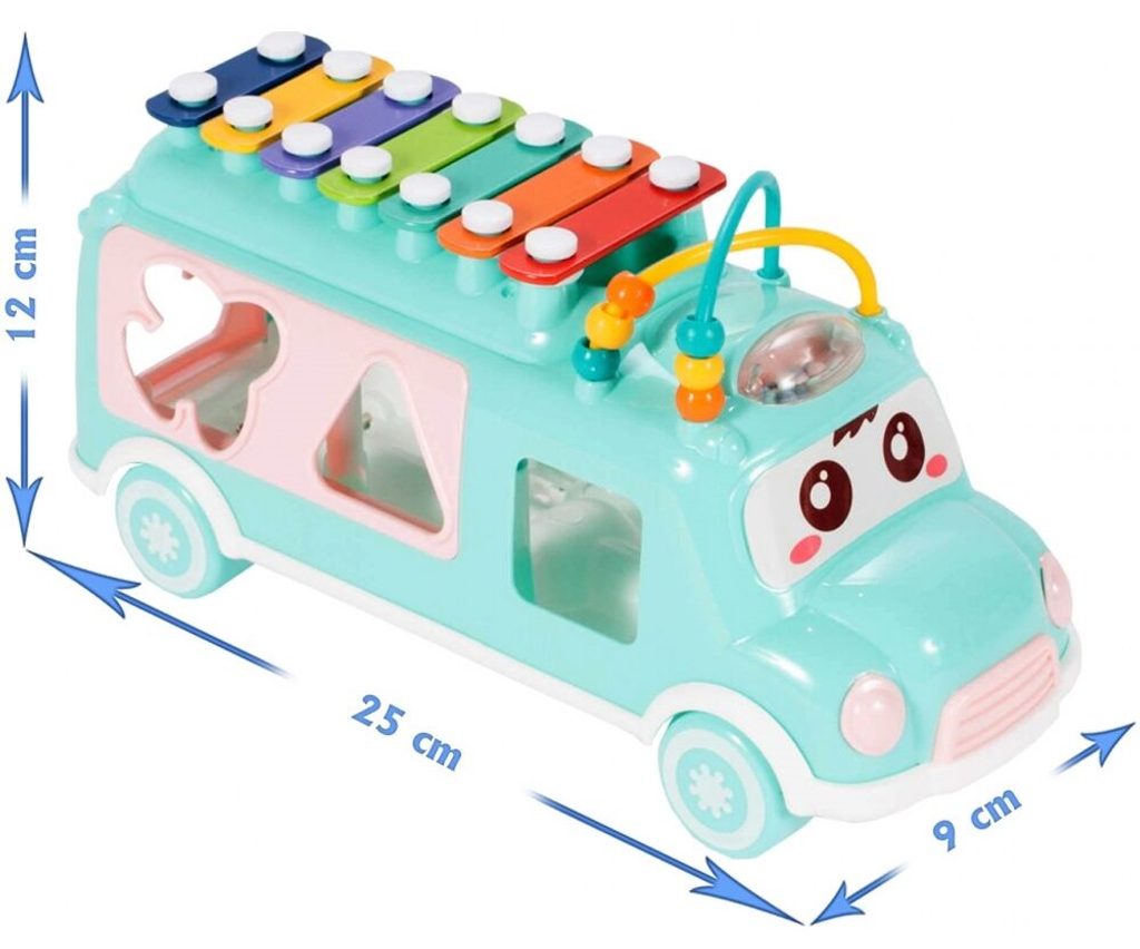 Interaktivní hrající autíčko 3v1 Happy Bus je určeno pro ty nejmenší děti. Boční stěny jsou vybaveny vhazovacími otvory pro hračky, které jsou součástí balení. Na střeše autíčka jsou umístěny malé cimbálky a také labyrint s korálky. Hrací palička je proti ztracení zabezpečena šňůrkou. Na předním skle jsou očička autíčko tak vypadá, že se směje. Auto je ideální hračkou pro rozvoj dětské motoriky, hmatu, zraku, logického myšlení, rozpoznávání barev a tvarů. Hračka je určena pro děti od 36 měsíců věku.