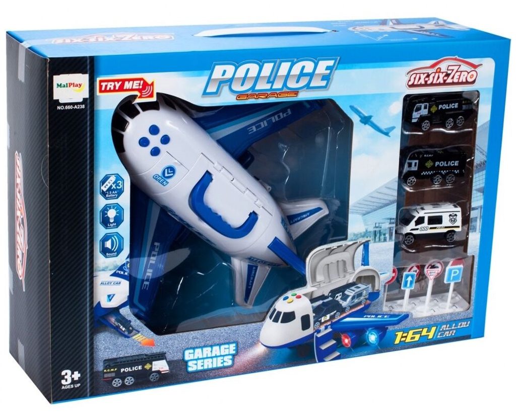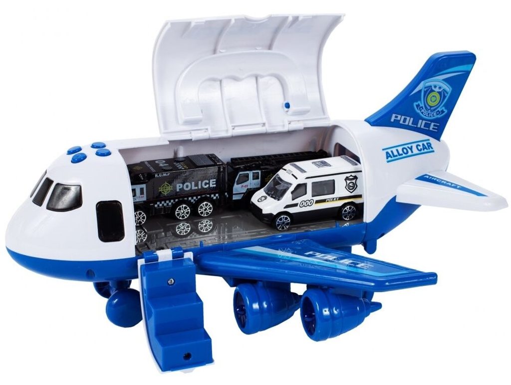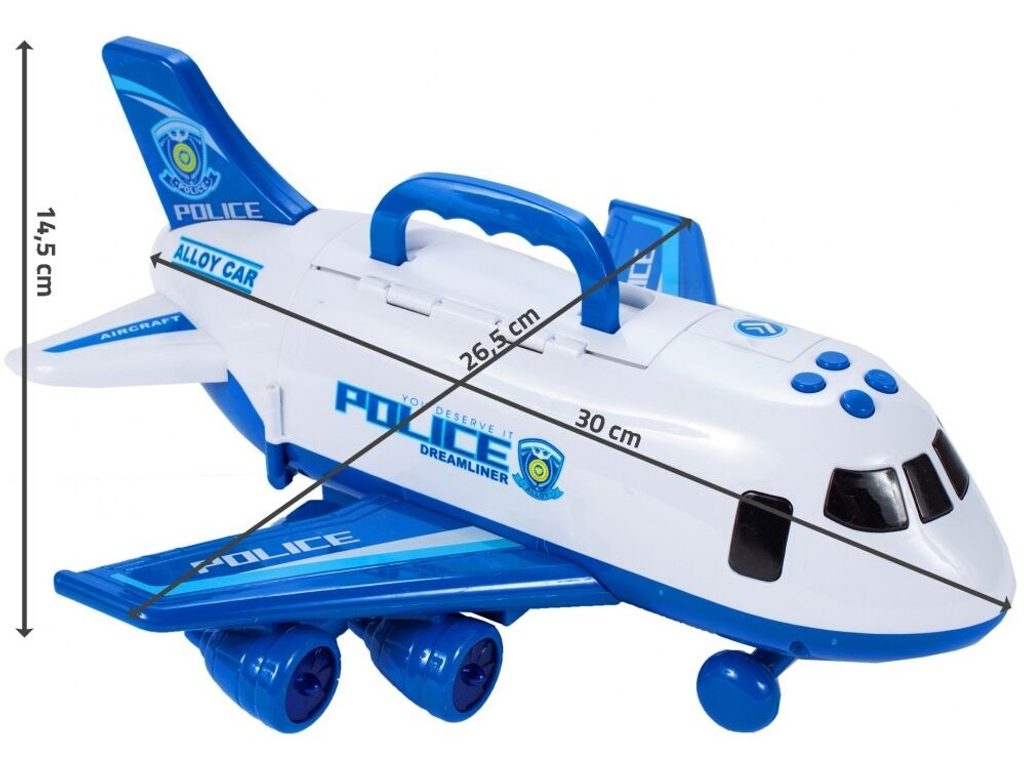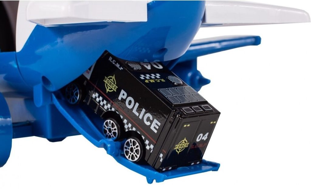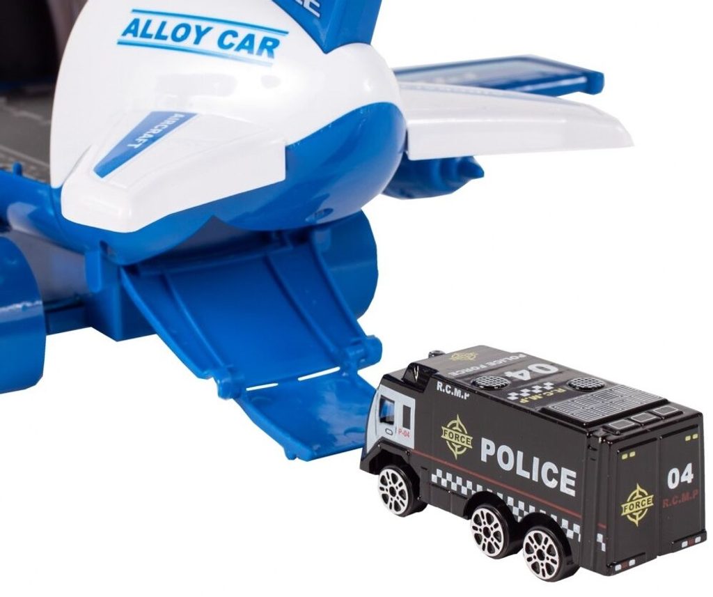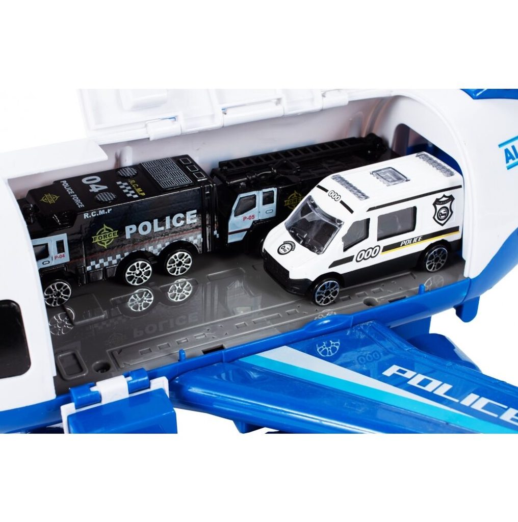 Interaktivní dopravní letadlo na setrvačník Police Airplane je ideální hračkou pro rozvoj manuální zručnosti a logického myšlení. Je vybaveno tlačítky, které spouští různé zvuky. Letadlo je rozkládací, má otevírací boční a zadní část a také výklopné schůdky. Součástí sada jsou také 3 kovová autíčka a dopravní značky. Motory letadla jsou osvětlené. Pohon zajišťuje setrvačník na zadních kolech. Hračka je určena pro děti od 36 měsíců věku.