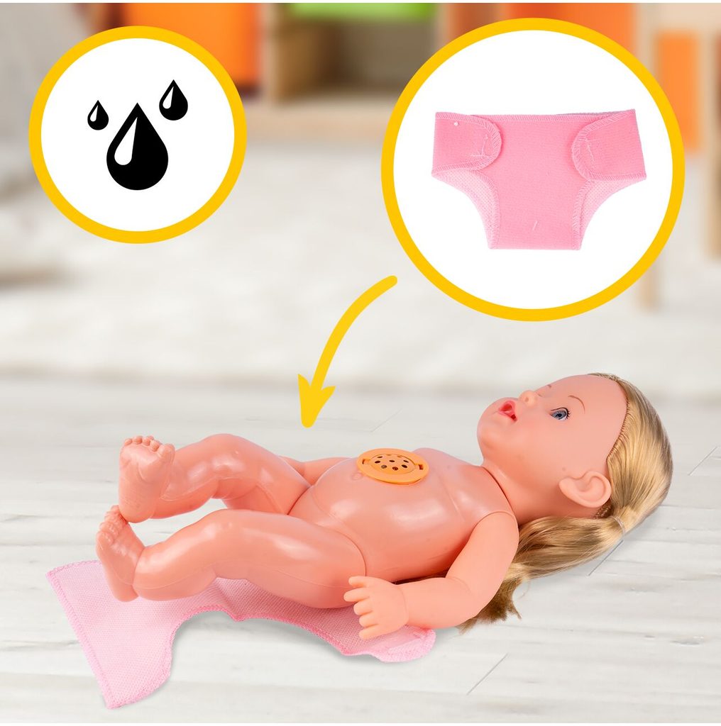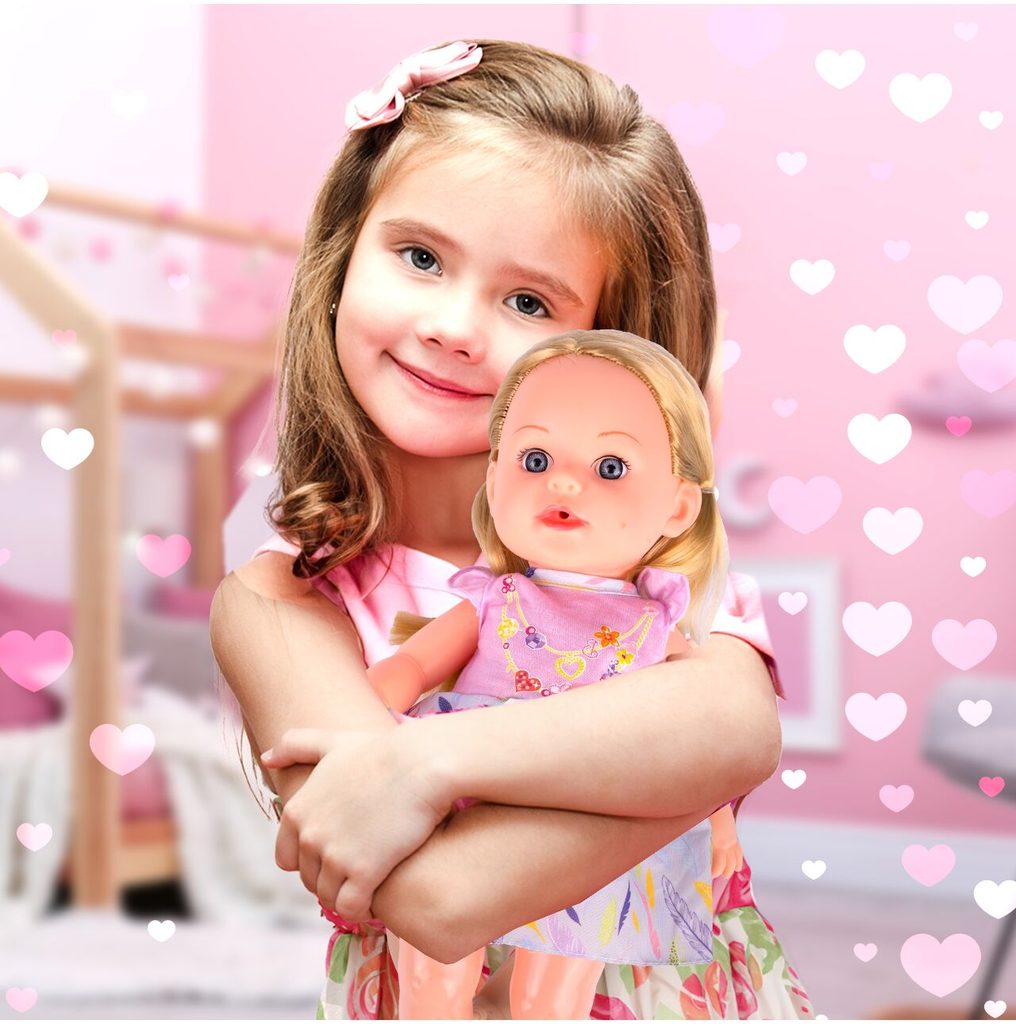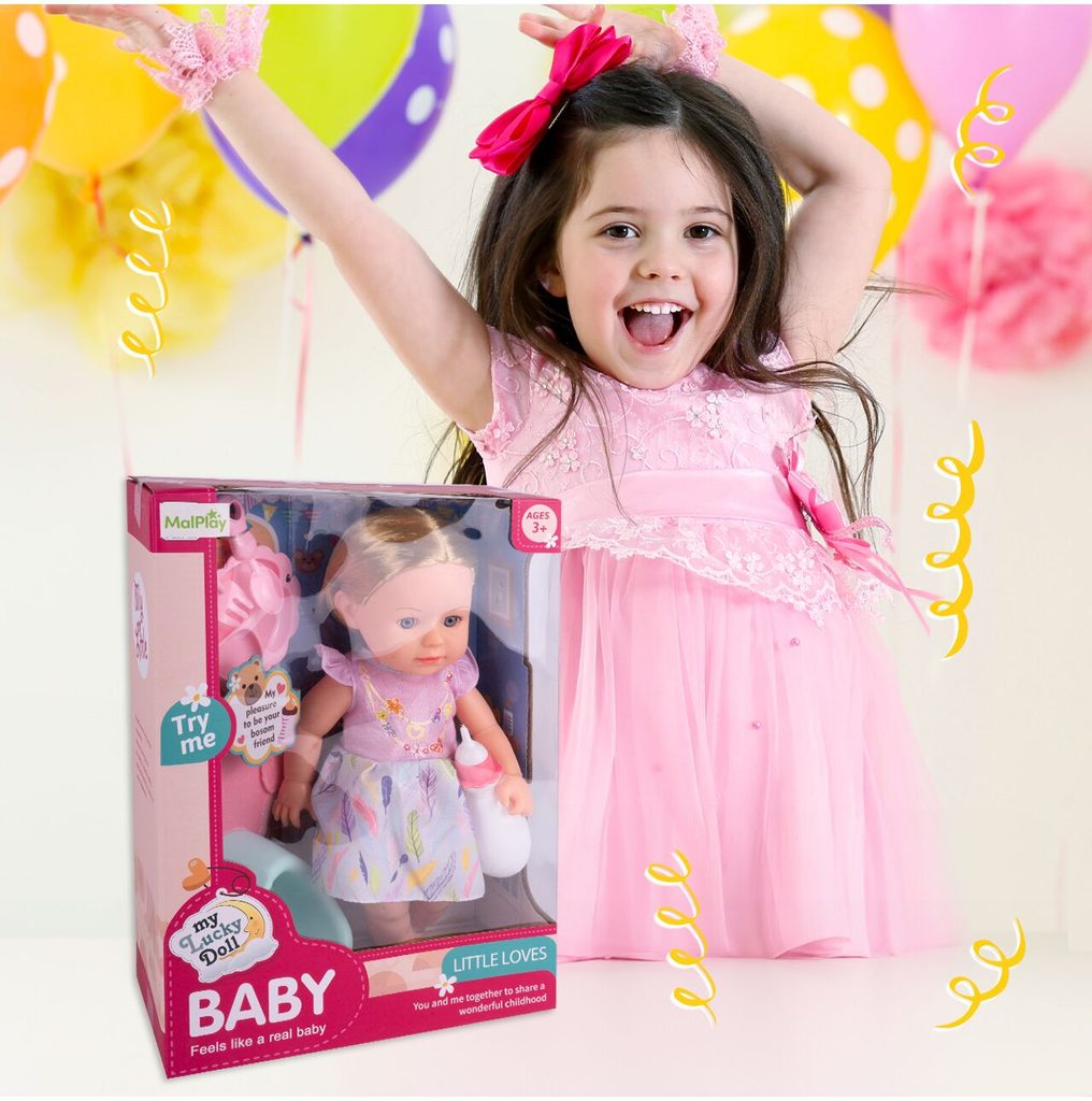 Panenka My Baby v realistickém provedení udělá ohromnou radost každé holčičce. Je vyrobena z materiálu velmi příjemného na dotek a má také oblečení na suchý zip. Součástí sady je také krmící lahvička, nočníček, kalhotky a talířek s příbory. Po zmáčknutí bříška se směje, pláče, vydává zvuky a mluví. Hračka je určena pro děti od 36 měsíců věku.