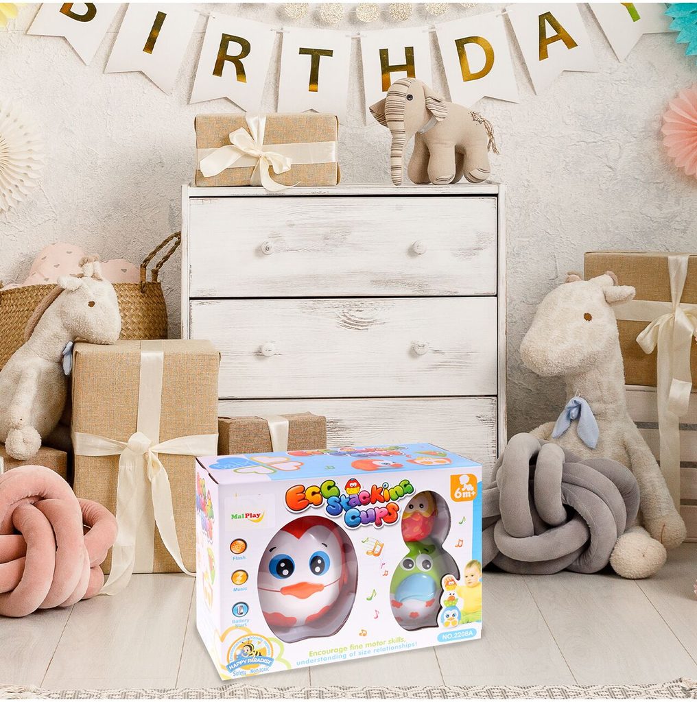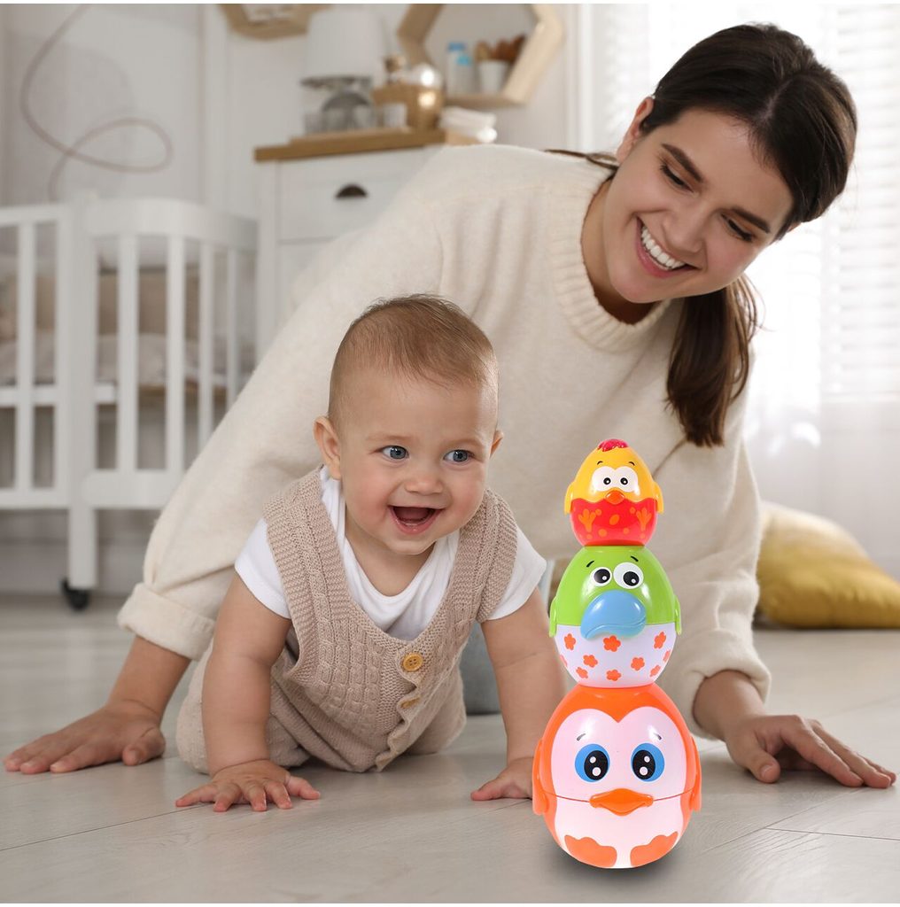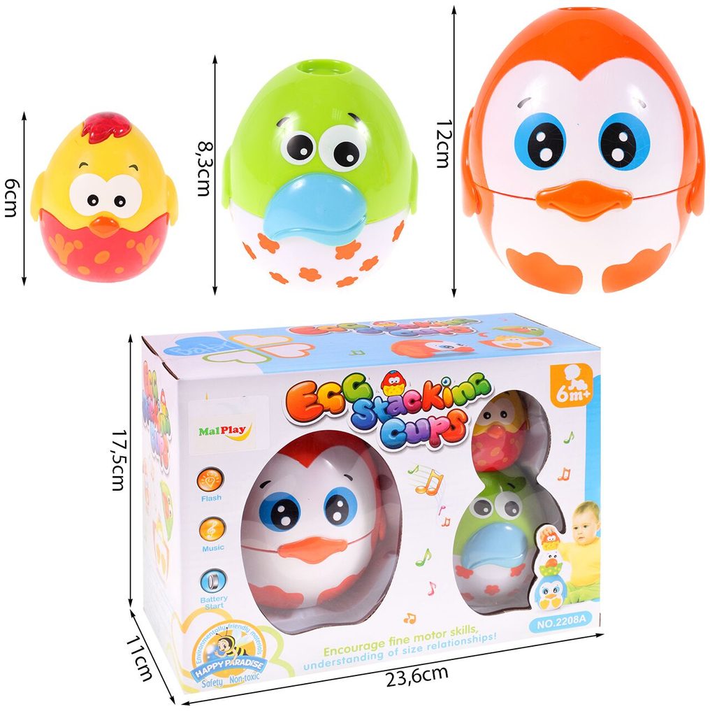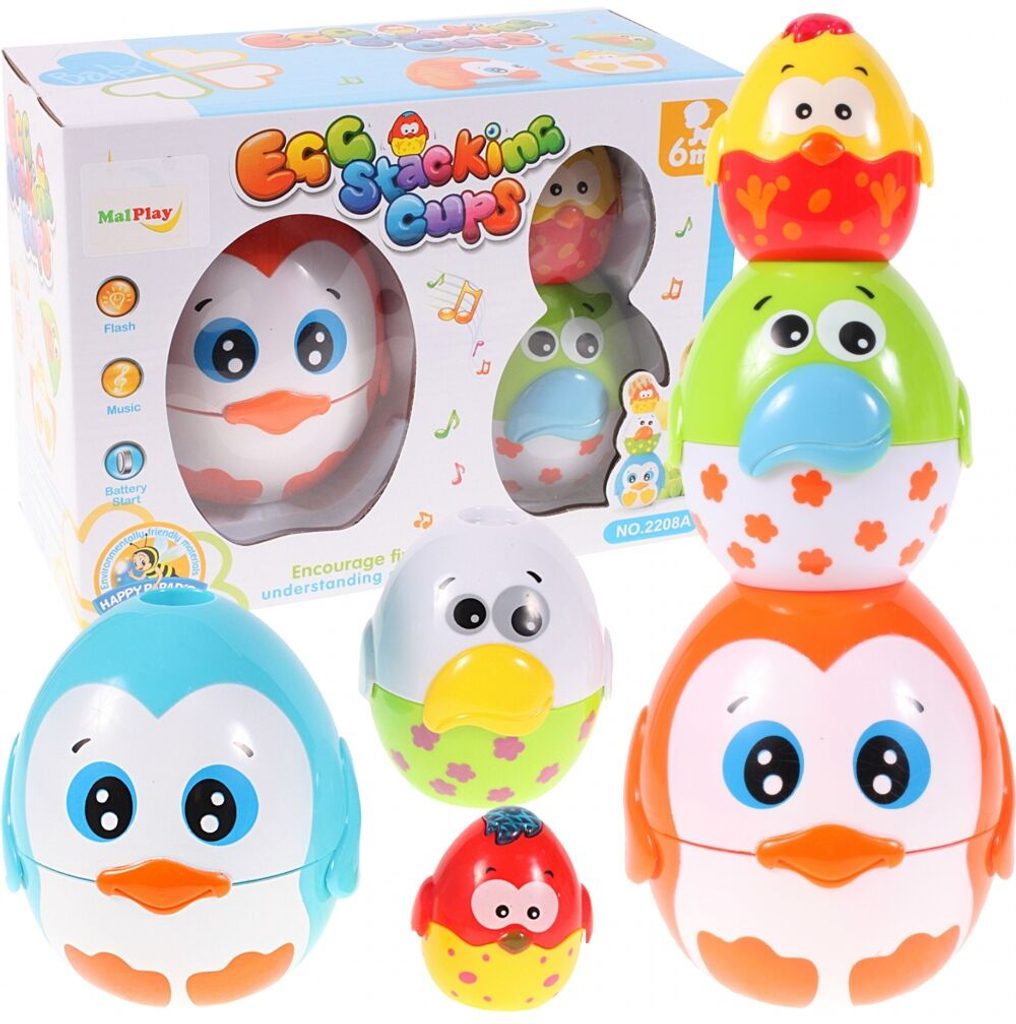Interaktivní naučná pyramida Egg Stacking se zvuky je určena pro děti od 6 měsíců. Procvičování koordinace oko - ruka je podnětnou aktivitou, která podporuje propojení mezi očima a rukama, ať už se jedná o jemné pohyby nebo o sledování pohybu. Melodie pro výuku zvuků dodává do této činnosti hudební dimenzi a zábavný prvek, který podněcuje smyslové vnímání. Sada obsahuje tři prvky ve formě vajíček, které lze skládat do pyramidálního tvaru, přičemž každé vajíčko je samostatně otevíratelné. Nejmenší vajíčko pak v sobě ukrývá další speciální funkce – aktivuje melodii a světélko, což přidává další rozměr zábavy a interakce. Tato sada nabízí nejen zábavu, ale také podporuje motorický rozvoj a smyslové vnímání dětí.