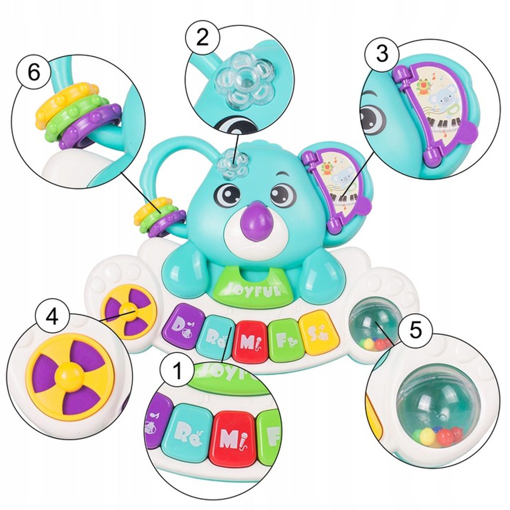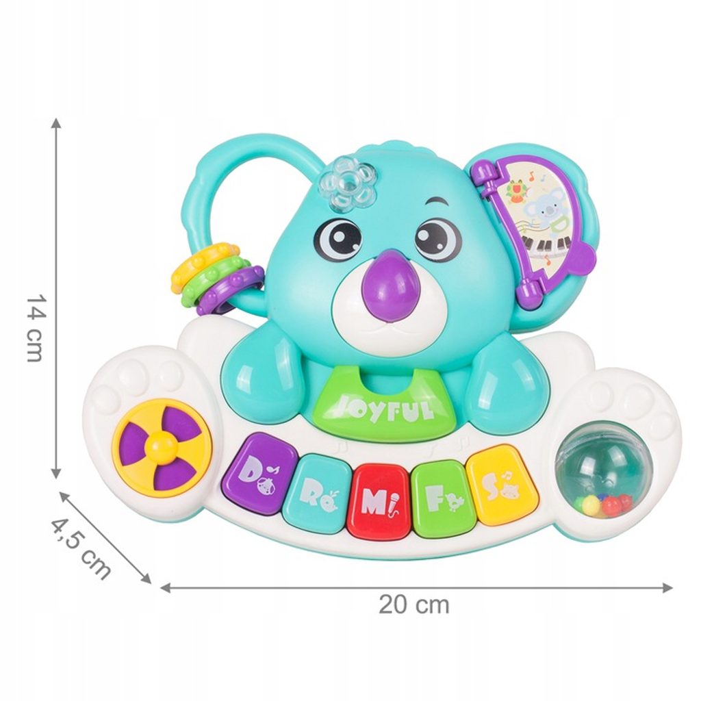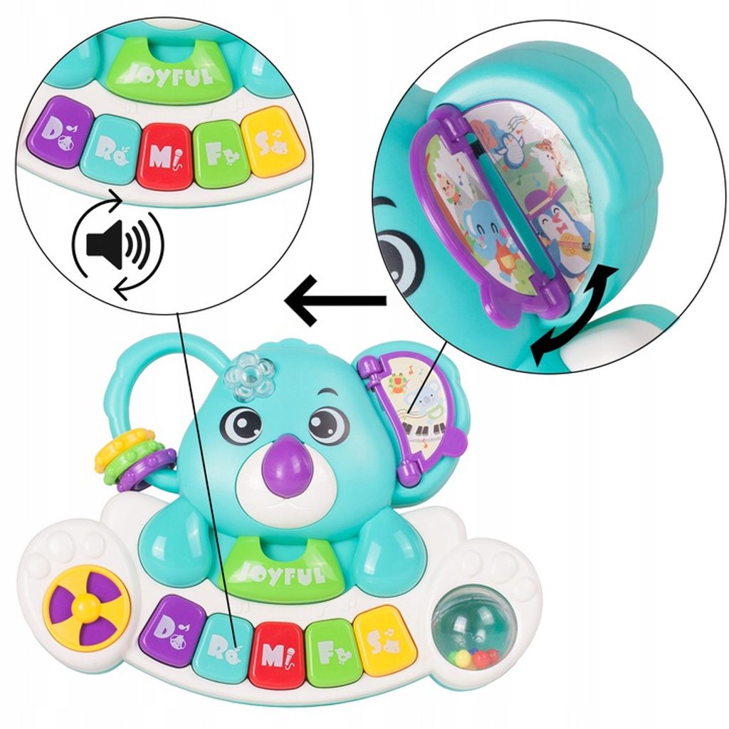 Interaktivní klávesnice ve tvaru medvídka koaly se zvuky a světýlkem je ideální hračkou pro ty nejmenší děti. Umožní dítěti rozvíjet hmat, zrak, sluch. Klávesnice má několik režimů hry, které se přepínají na oušku medvídka. Vedle klasického Doremi klavíru jsou zde melodie, zvuky dětského smíchu, pláče a zvířátek. Každé zmáčknutí klávesnice doprovází blikající světýlko. Hračka má také malinké chrastítko a pohyblivé kroužky. Hračka je určena pro děti od 18 měsíců věku.