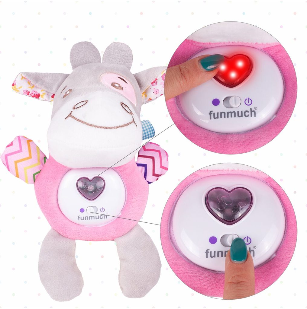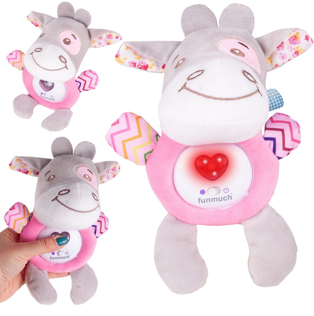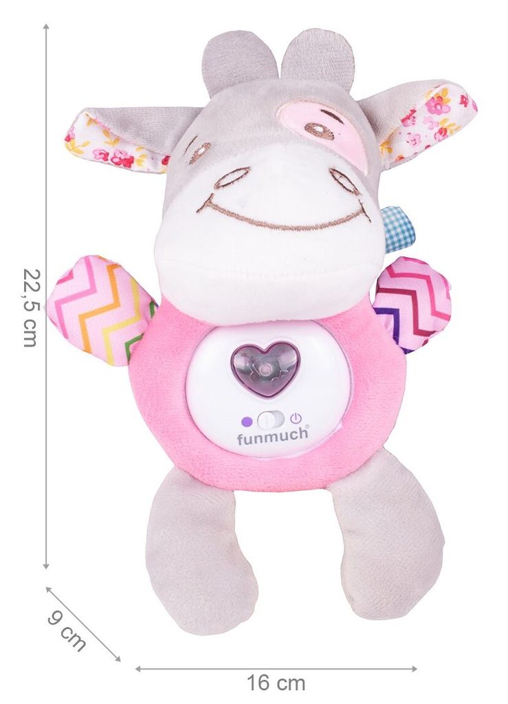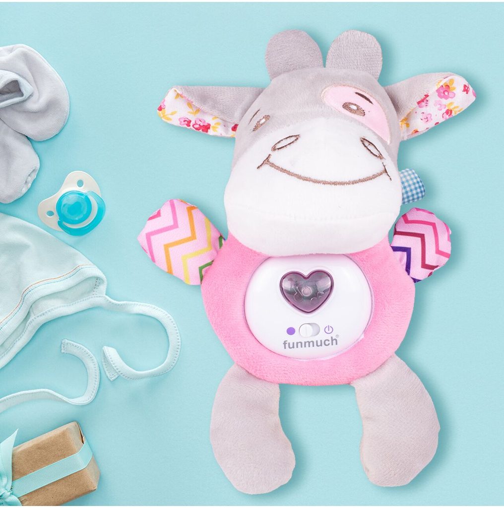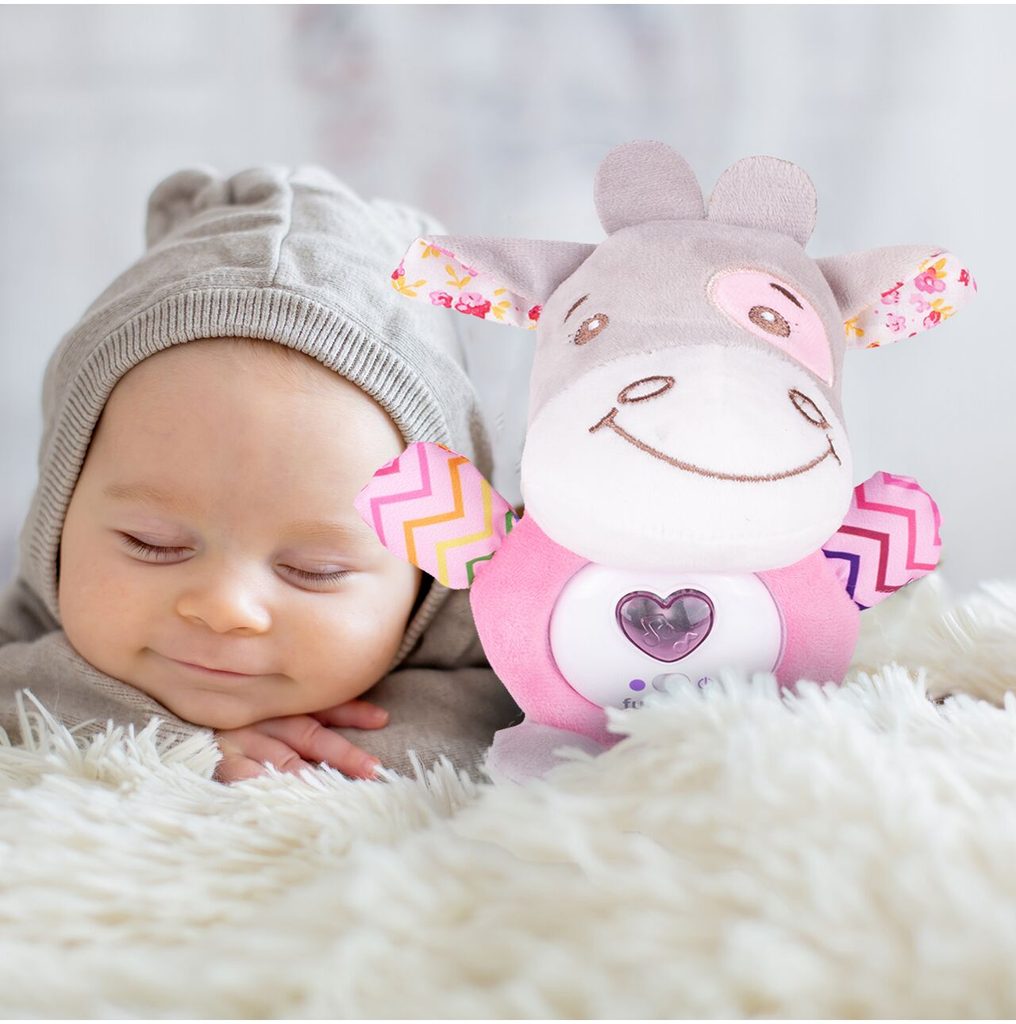 Interaktivní plyšová kravička Baby Calm je ideální hračkou pro ty nejmenší děti kdy jim pomůže snadno usnout. Je vyrobena z jemného na dotyk příjemného materiálu. Je vybavena různými písničkami, melodiemi a zvuky. Ty se přepínají zmáčknutím tlačítka ve tvaru srdíčka. To také během hry svítí. Hračka je určena pro děti od narození.