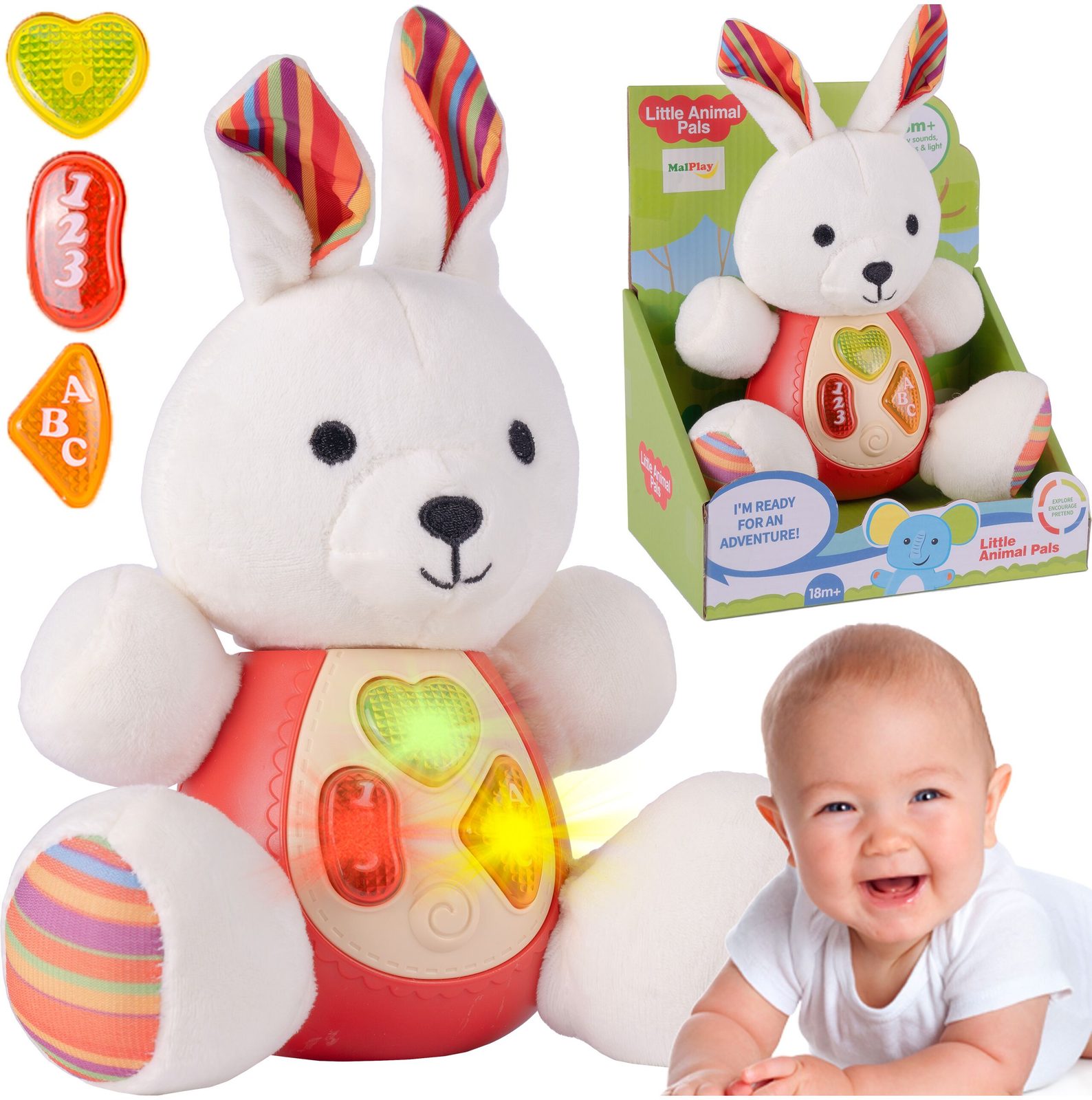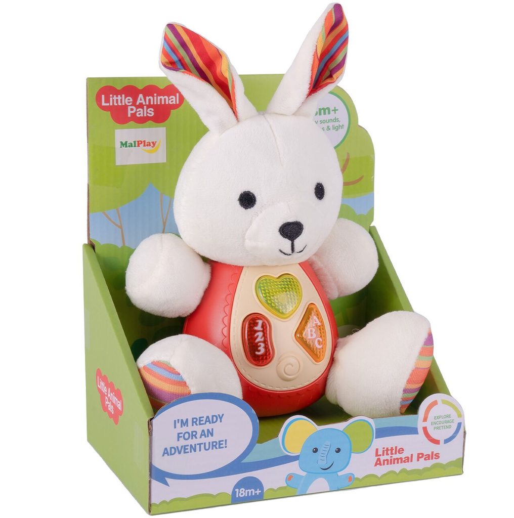 Interaktivní plyšový králíček Little Animal je ideální hračkou nejmenší děti. Je vyroben z jemného na dotyk příjemného materiálu. Po zmáčkutí tlačítek se spustí, osvětlení, zvuky a melodie.  Hračka je určena pro děti od 18 měsíců věku.