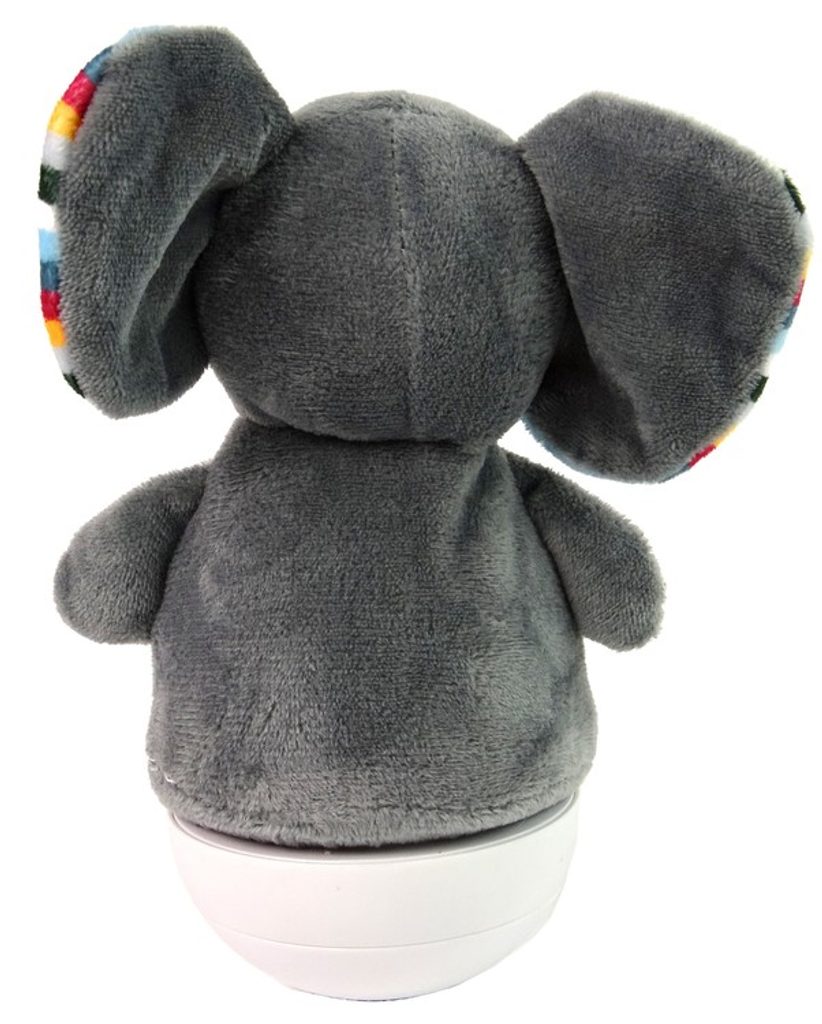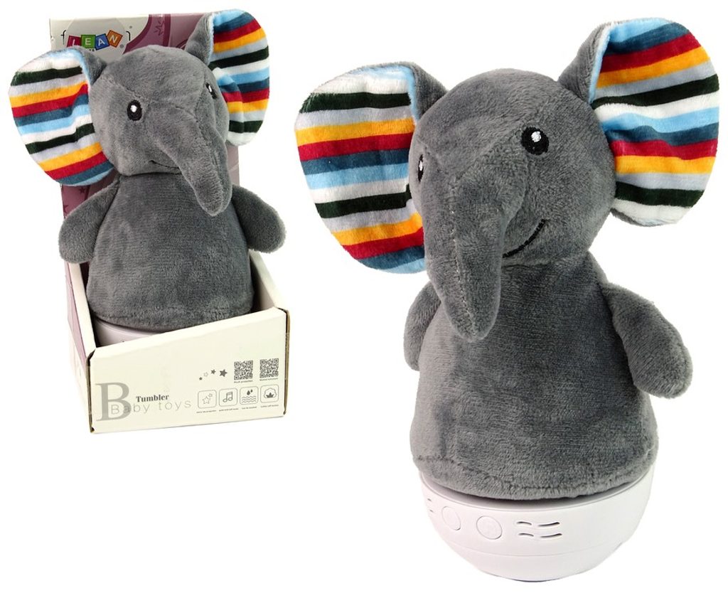 Interaktivní plyšový slon Baby Tumbler je ideální hračkou pro ty nejmenší děti kdy jim pomůže snadno usnout. Je vyroben z jemného na dotyk příjemného materiálu. Pokud dítě hračku převrhne, díky správně zabudovanému těžišti se stále vrací do vertikály, pro malé průzkumníky je to fascinující věc. Nahradí i funkci lampy, střídání barev a klidná melodie budou perfektním pomocníkem při usínání Vašeho dítěte.Slon má úplně dole dvě tlačítka, jedno má na starosti spouštění hračky, druhé změnu melodie. Každá píseň je uklidňující a uklidňující. Během písní svítí tlumeným světlem, cyklicky mění barvy, funguje tedy jako noční lampa. Potah ve tvaru slona je snímatelný, jakmile se zašpiní, můžete jej hodit do praní.