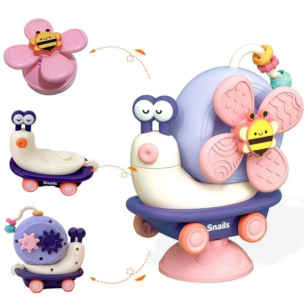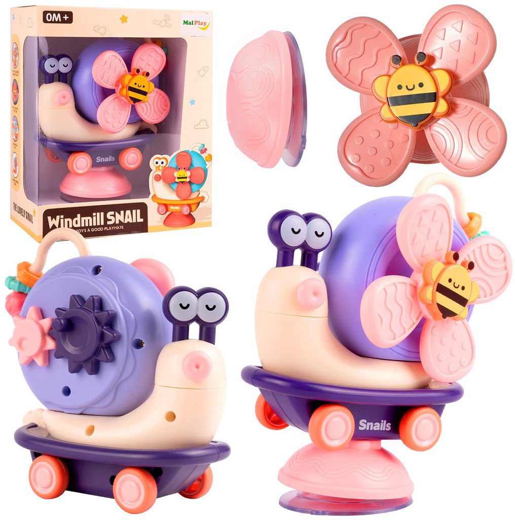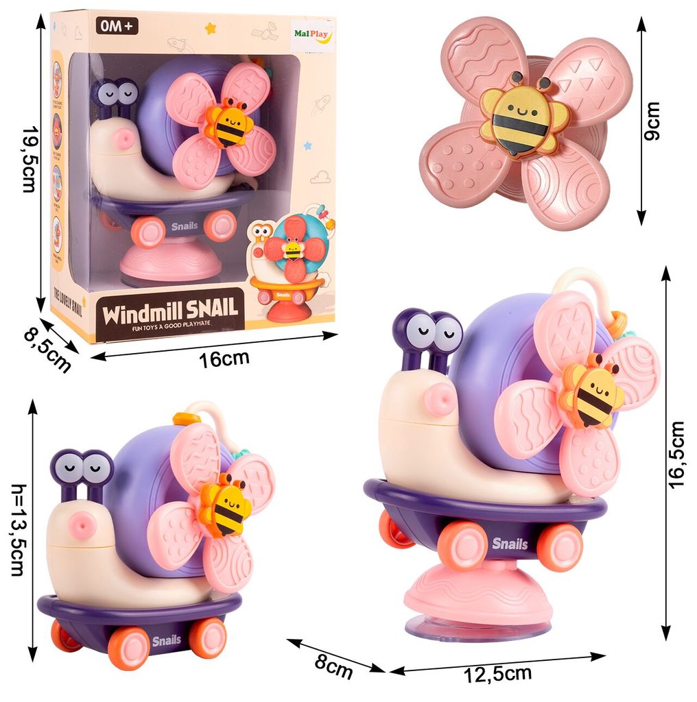 Interaktivní větráček Windmill Snail je určen pro děti od narození.Tato hračka, určená pro děti, je skvělým nástrojem pro procvičování koordinace mezi okem a rukou. Složena je z několika prvků, včetně připevnitelného slimáčka s přísavkou, která umožňuje jeho pohyb. Po odpojení přísavky se hračka stává pohyblivou, což posiluje zábavu a rozvoj dovedností. Na ulitě slimáčka jsou další otočné prvky, a díky možnosti demontáže ulity je hračka flexibilní a variabilní. Navíc, s větráčkem ve formě větrného mlýnu, je tato hračka vhodná i pro hravé chvíle ve vaně.