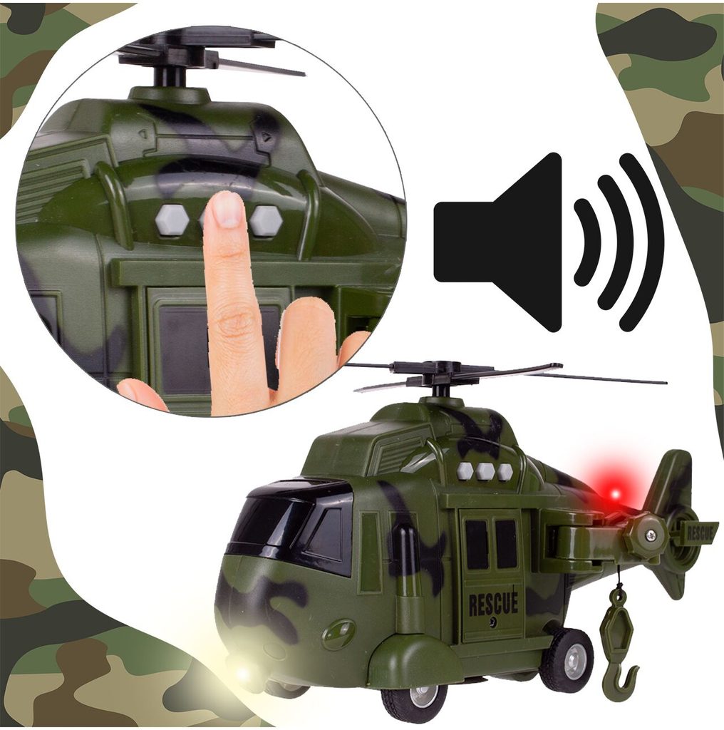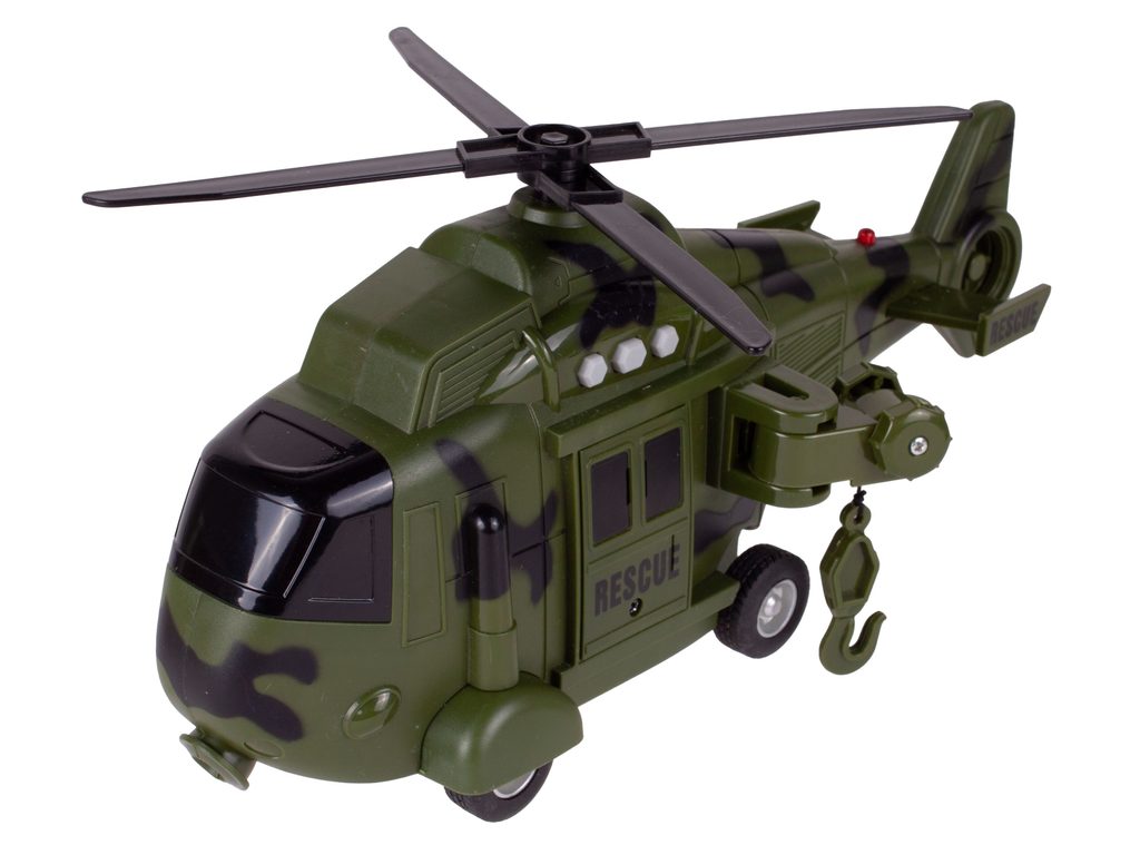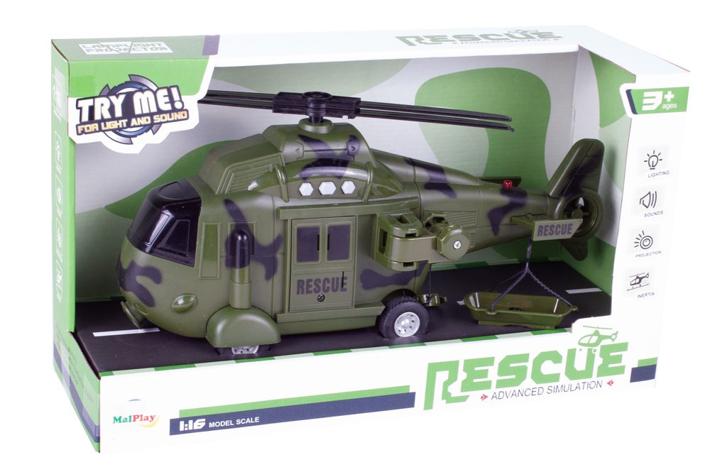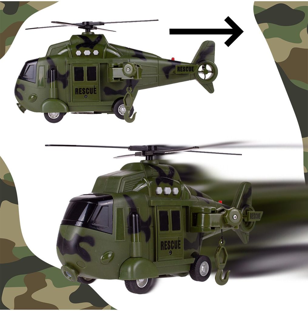 Interaktivní vojenský vrtulník s pohonem kol Army Rescue je ideální hračkou pro rozvoj manuální zručnosti a logického myšlení. Je vybaven zvukovými efekty a také předním a zadním světýlkem. Součástí helikoptéry je také lano s háčkem a záchranné lehátko. Pohon zajišťuje systém Friction Power kdy se helikoptéra rozpohybuje tlačením po hladkém povrchu. Hračka je určena pro děti od 36 měsíců věku.