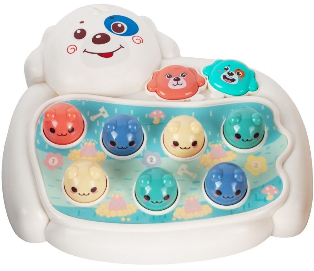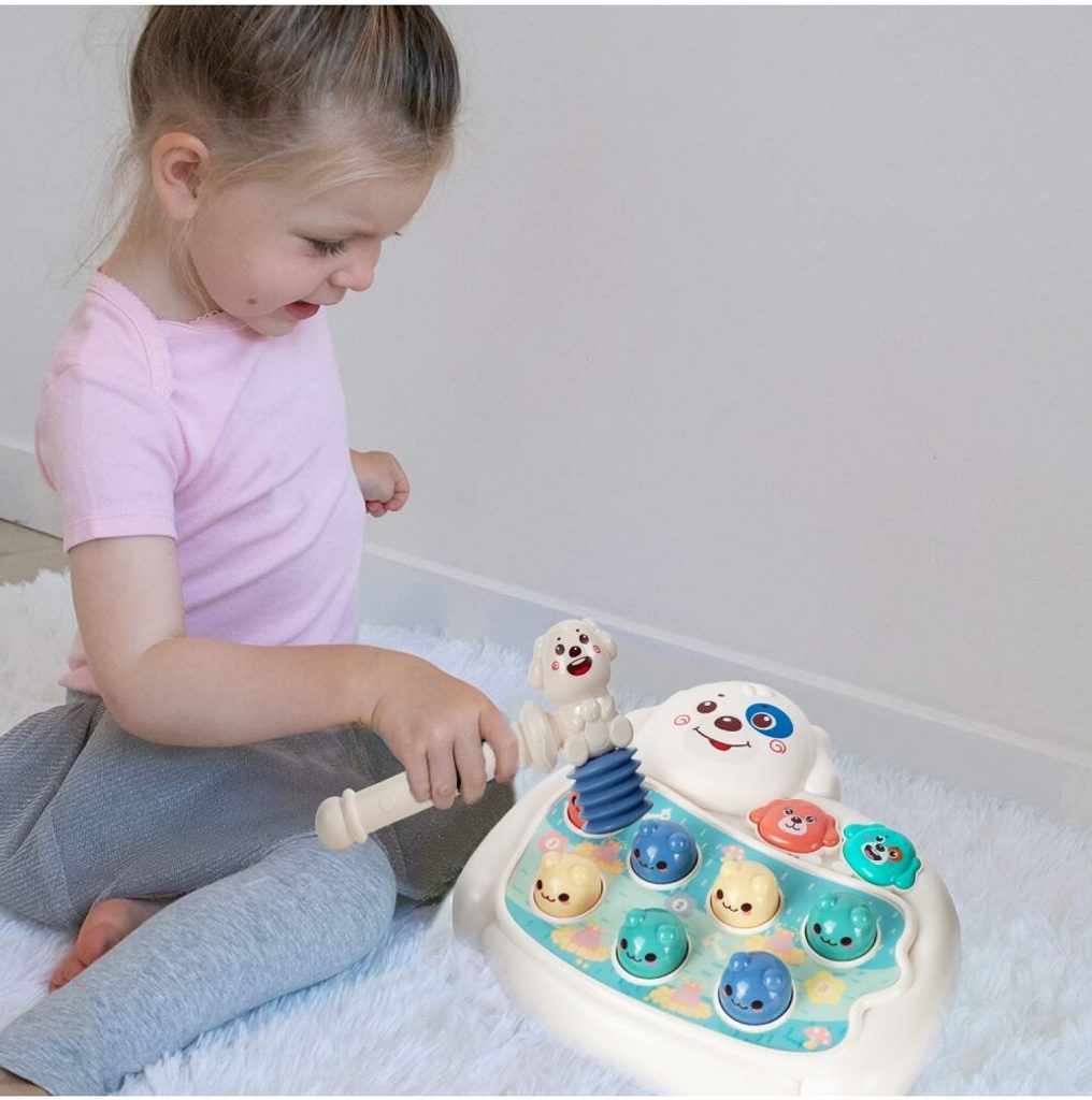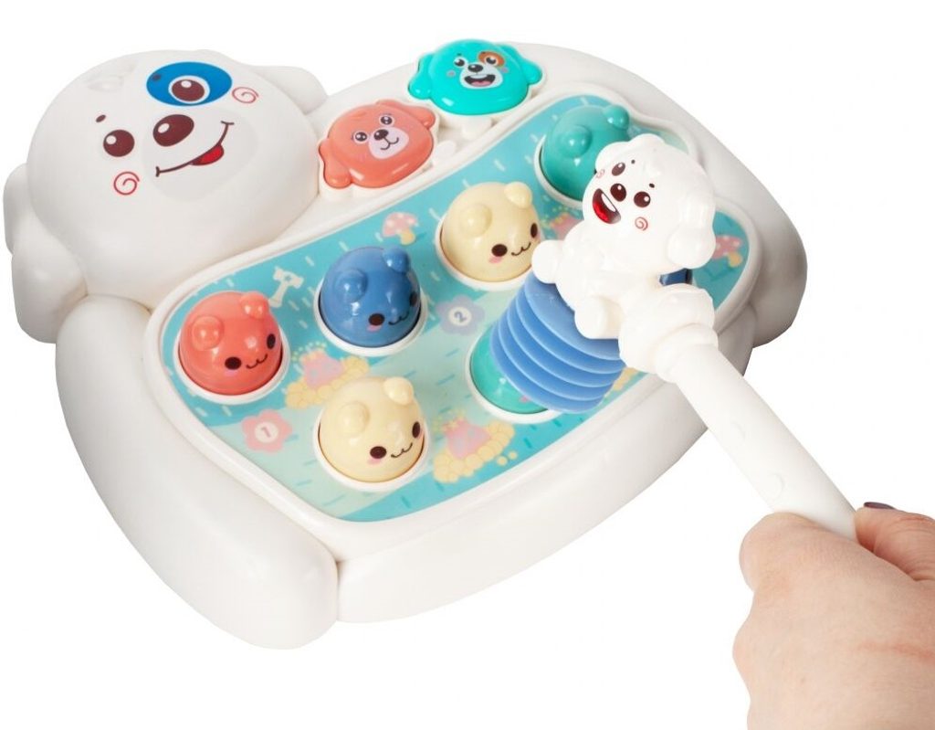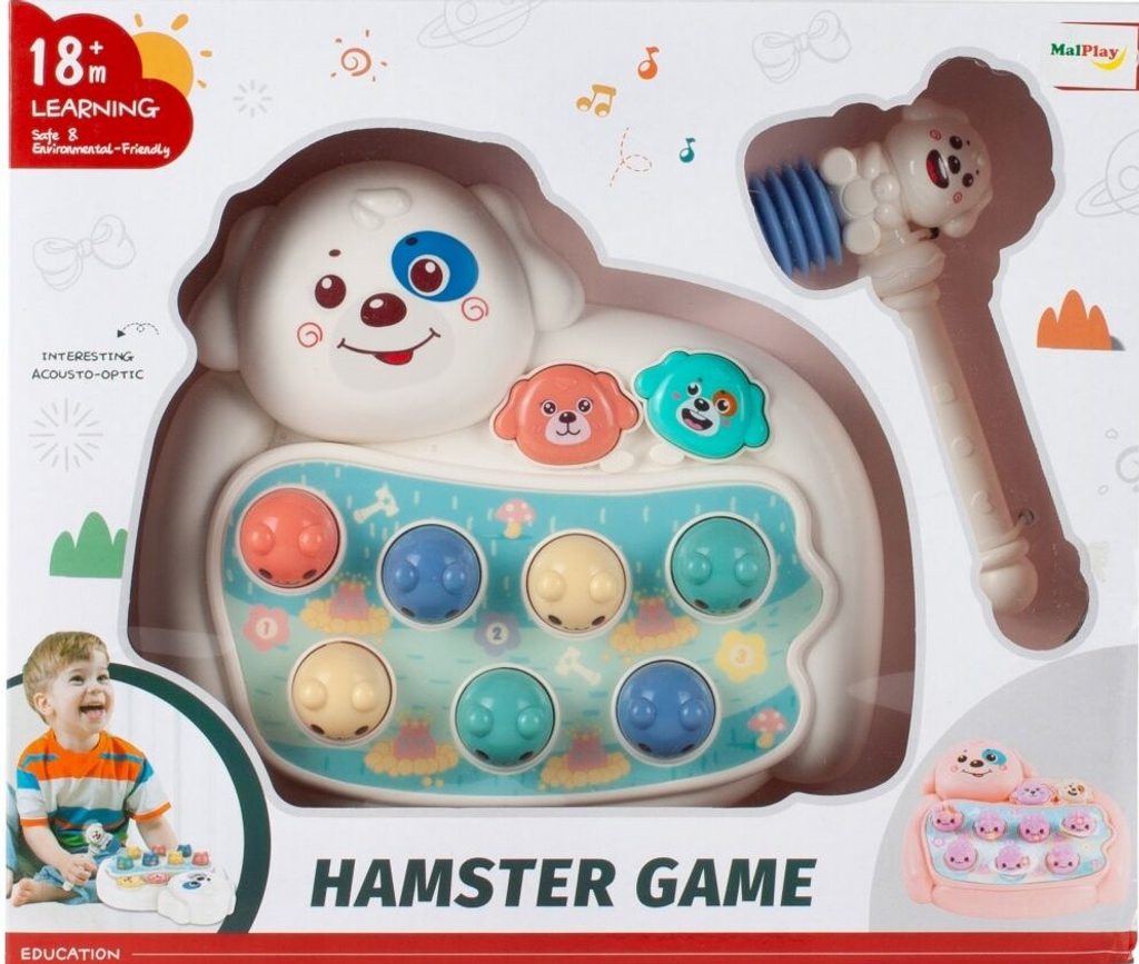 Interaktivní zatloukání míčků Hamster Game je určeno pro ty nejmenší děti. Stimuluje u nich hmat, koordinaci, představivost a učí je rozpoznávat barvy. Pomocí přiloženého kladívko se svítící míčky ve tvaru pejsků vtloukají dovnitř. Hračka je vybavena celkem 4 režimy hry kdy se dá nastavit rychlost světýlek a také různé melodie. Ve spodní části jsou umístěny přísavky. Hračka je určena pro děti od 12 měsíců věku.