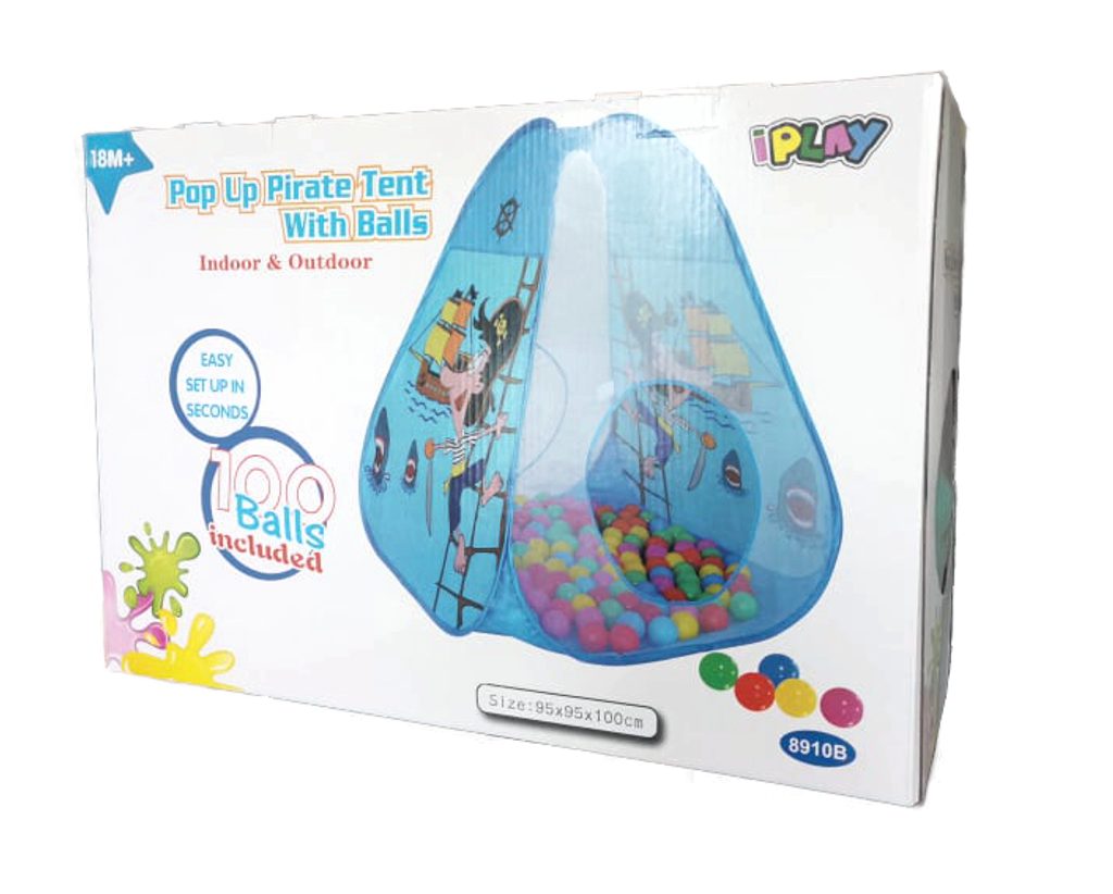 IPlay dětský stan Piráti + 100 barevných plastových míčků o průměru 6 cm. Díky nepromokavé podlaze je vhodný jak do vnitřních prostor tak i pro venkovní použití. Stan má kulaté vchody a 2 stěny ze síťoviny. Rodiče tak mají snadnou kontrolu nad dětmi. Svrchní materiál je polyester v pestrobarevném barevném provedení s obrázky. Montáž stanu je velmi snadná a rychlá, což oceníte zejména při jeho přemísťování.