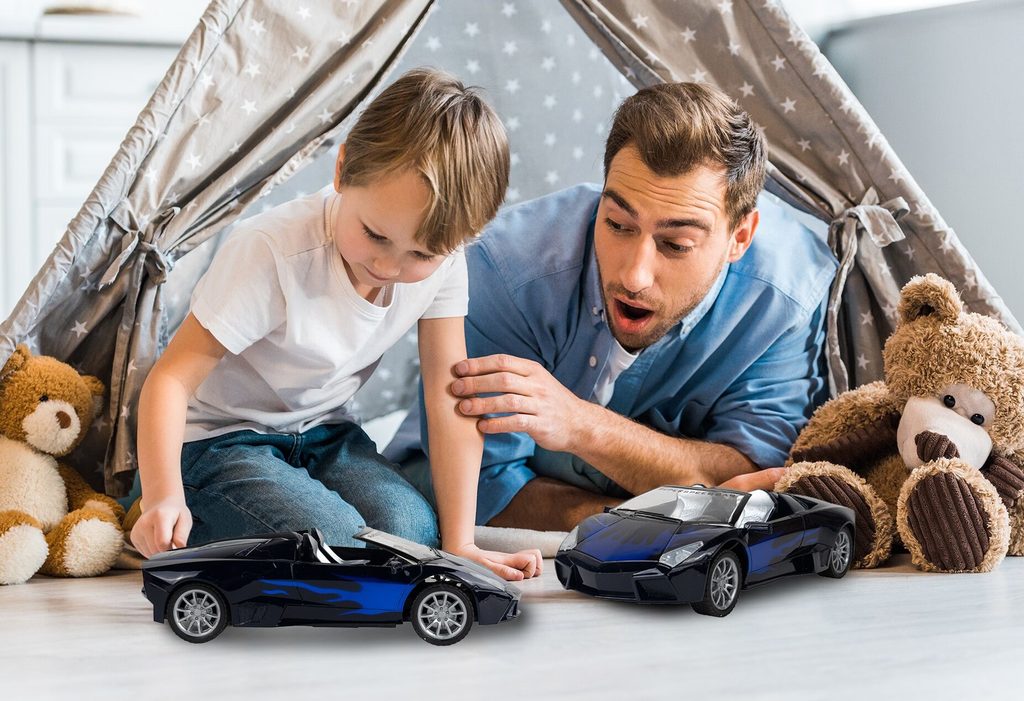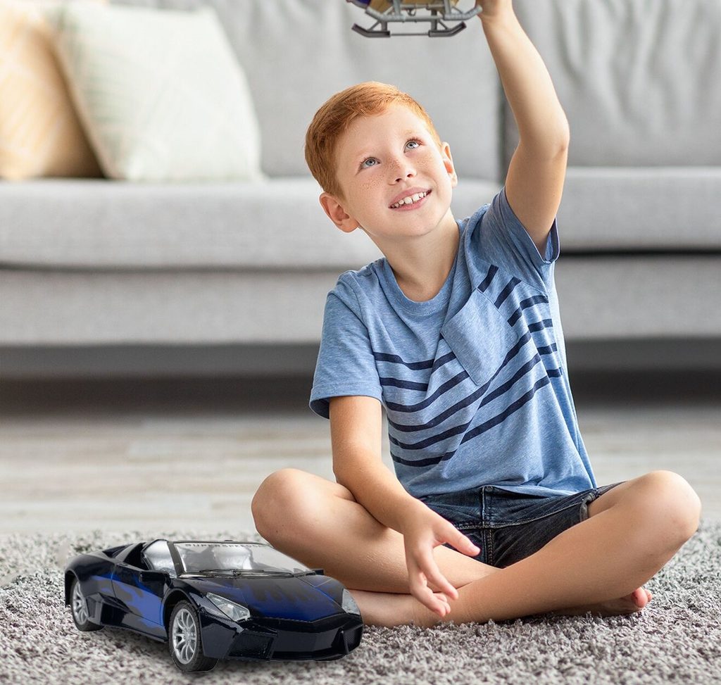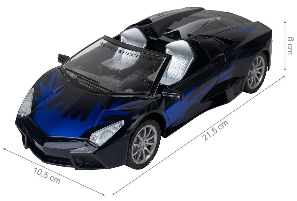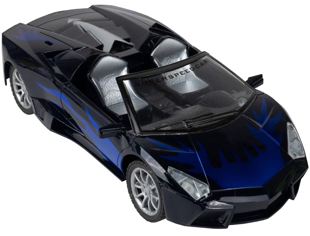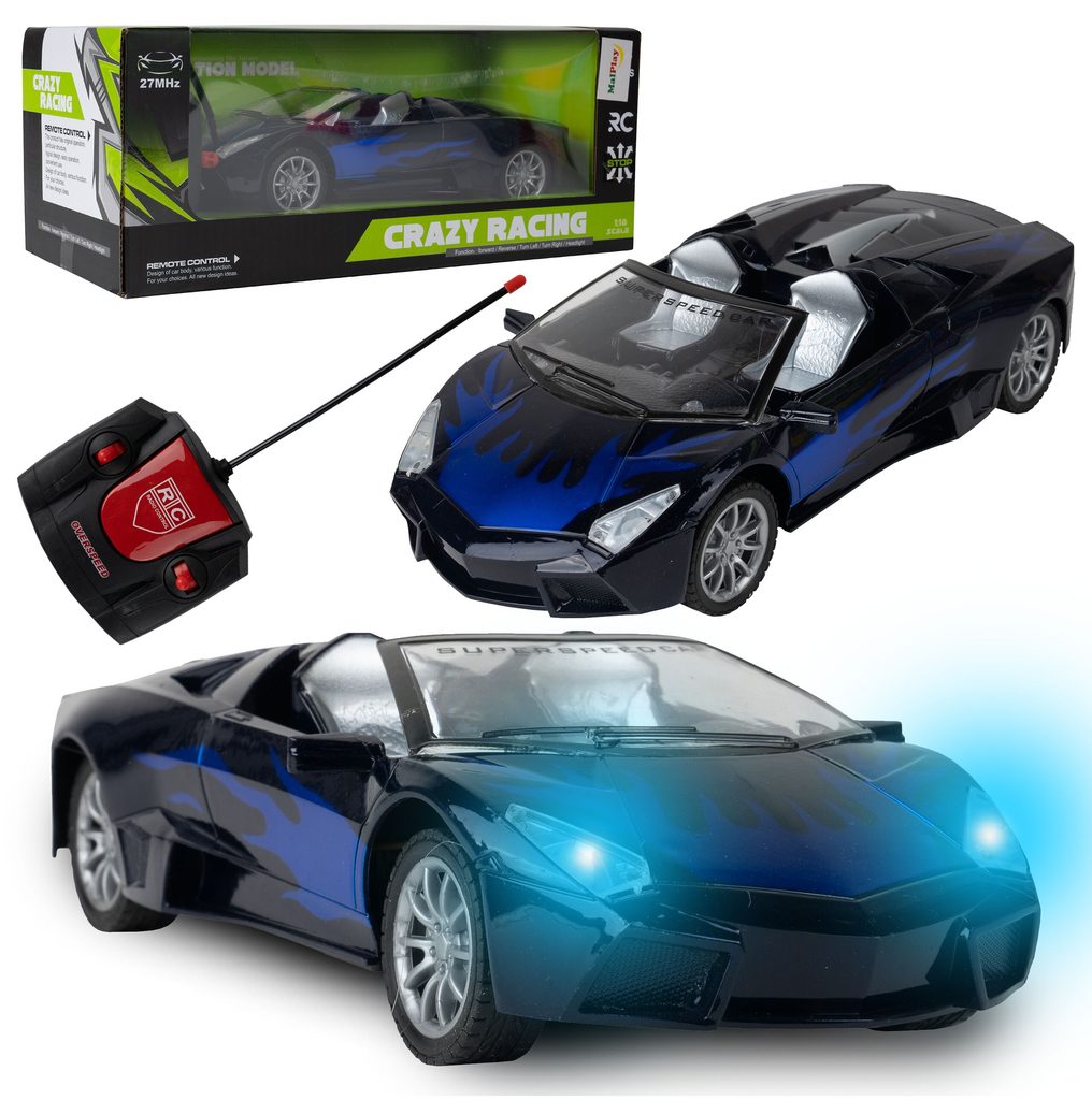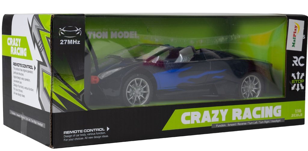 Sportovní autíčko - kabriolet Crazy Racing na dálkové ovládání s dálkovým ovládáním 27 MHz se vzhledem sportovního vozu umožnuje jízdu dopředu a dozadu, zatáčí doprava a doleva. Během jízdy svítí přední světla. Dálkové ovládání i autíčko jsou napájeny bateriemi, které nejsou součástí balení. Autíčko je vyrobeno z plastu a má certifikaci CE.