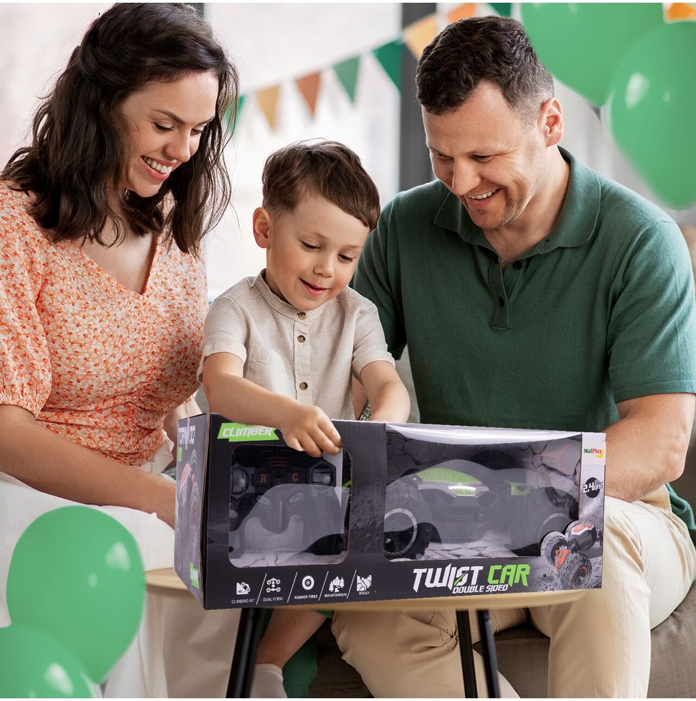 Auto s dálkovým ovládáním Twist Car je určeno pro děti od 3 let věku. Vozidlo na velkých gumových kolech pneumatikách si perfektně poradí jak s hladkým povrchem tak i s jinými členitými terény. Je schopno zdolat sklon až o 45°. Auto je ovládané dálkovým 2,4GHz ovladačem s páčkami a tlačítky. Autíčko je vyrobeno z odolného plastu a má certifikaci CE.