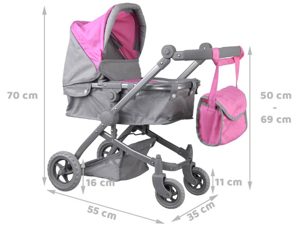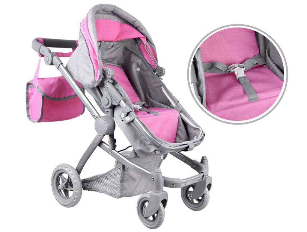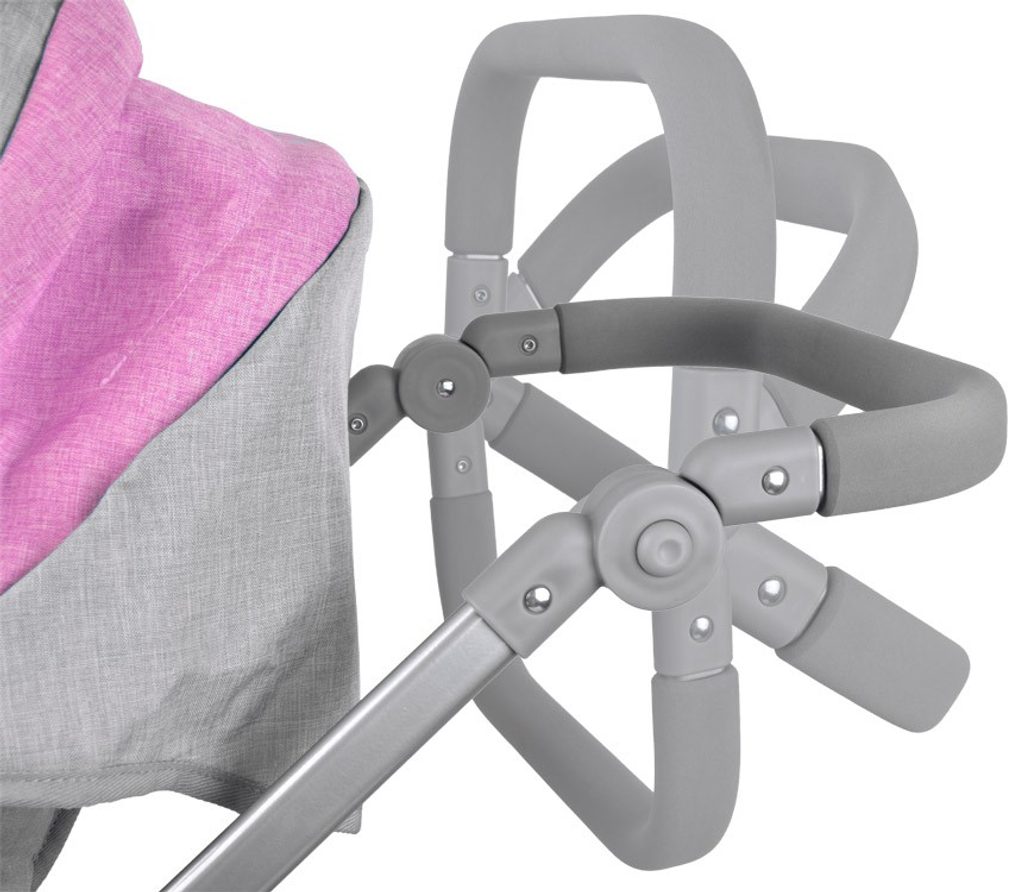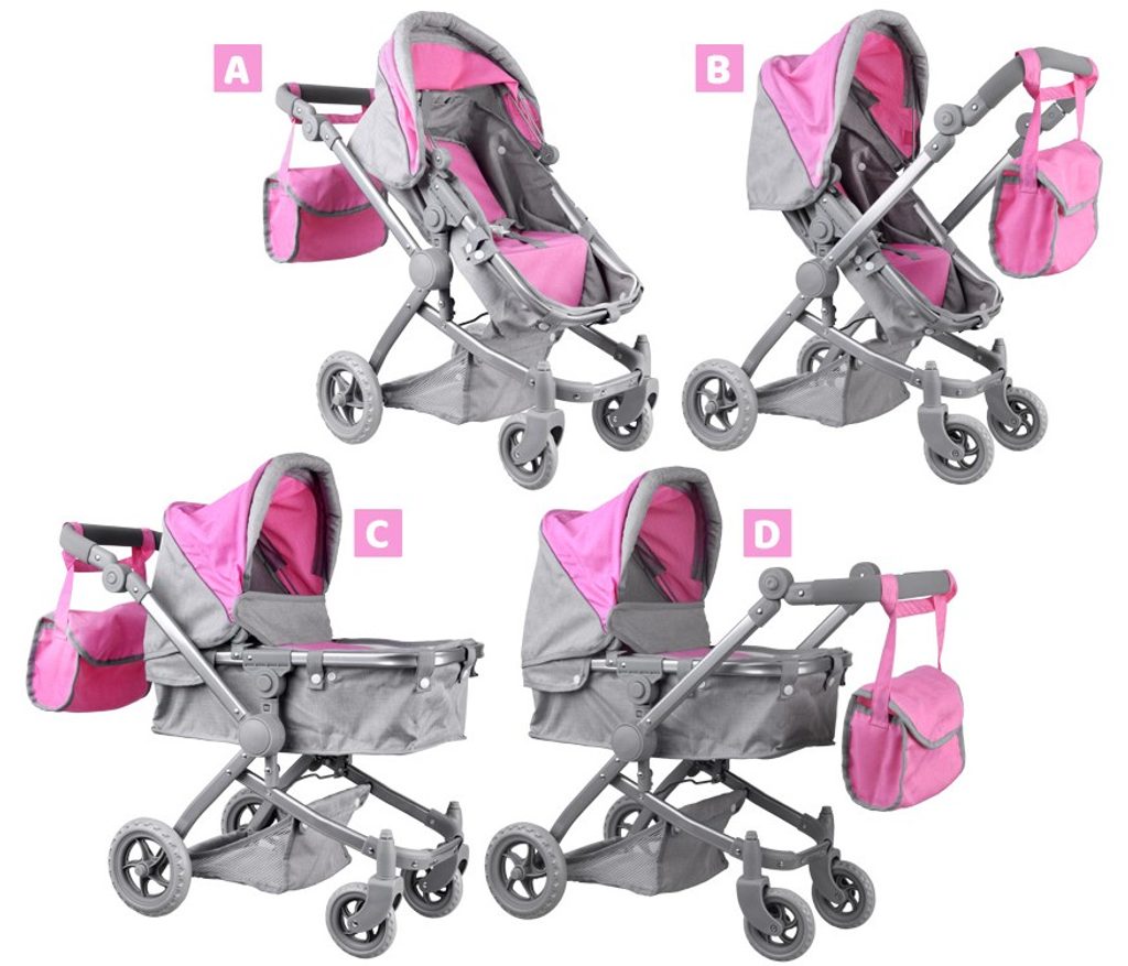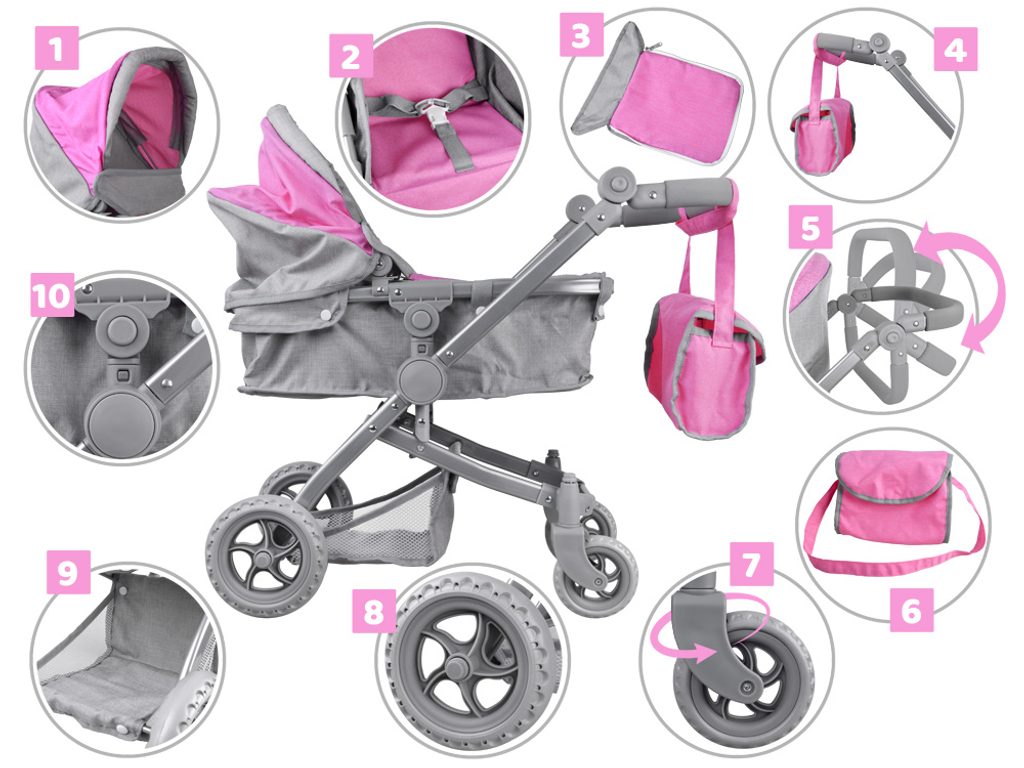 Kombinovaný kočárek pro panenky Alice 4543 má velmi lehkou stabilní konstrukci vyrobenou z hliníkových trubek, svrchní část je z impregnované bavlny. Lze ji jednoduše sejmout a kdykoliv vyprat. Regulovatelná rukojeť kočárku je obalená pěnou. Před automatickým složením chrání dítě blokace. Panenka je proti vypadnutí zabezpečena bezpečnostním pásem. Pěnová kola s disky nezanechávají šmouhy na podlaze.