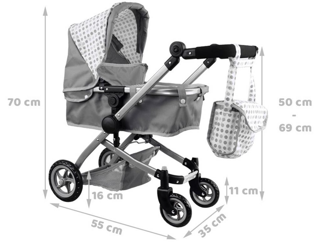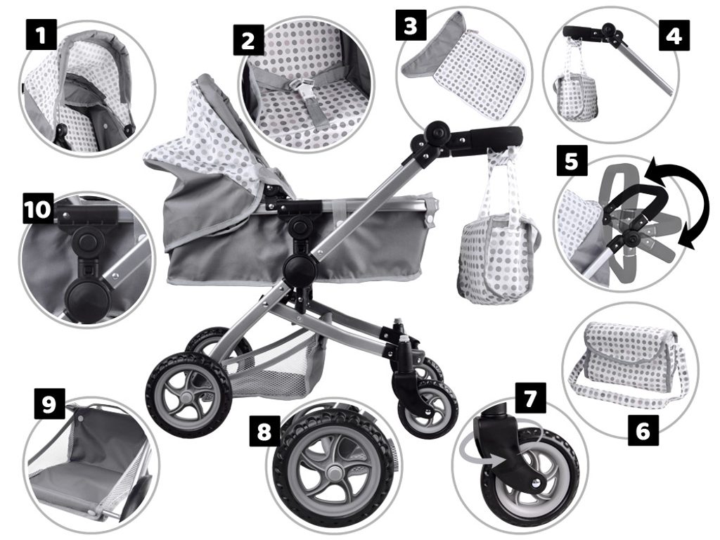 Kombinovaný kočárek pro panenky Alice 4543 má velmi lehkou stabilní konstrukci vyrobenou z hliníkových trubek, svrchní část je z impregnované bavlny. Lze ji jednoduše sejmout a kdykoliv vyprat. Regulovatelná rukojeť kočárku je obalená pěnou. Před automatickým složením chrání dítě blokace. Panenka je proti vypadnutí zabezpečena bezpečnostním pásem. Pěnová kola s disky nezanechávají šmouhy na podlaze.