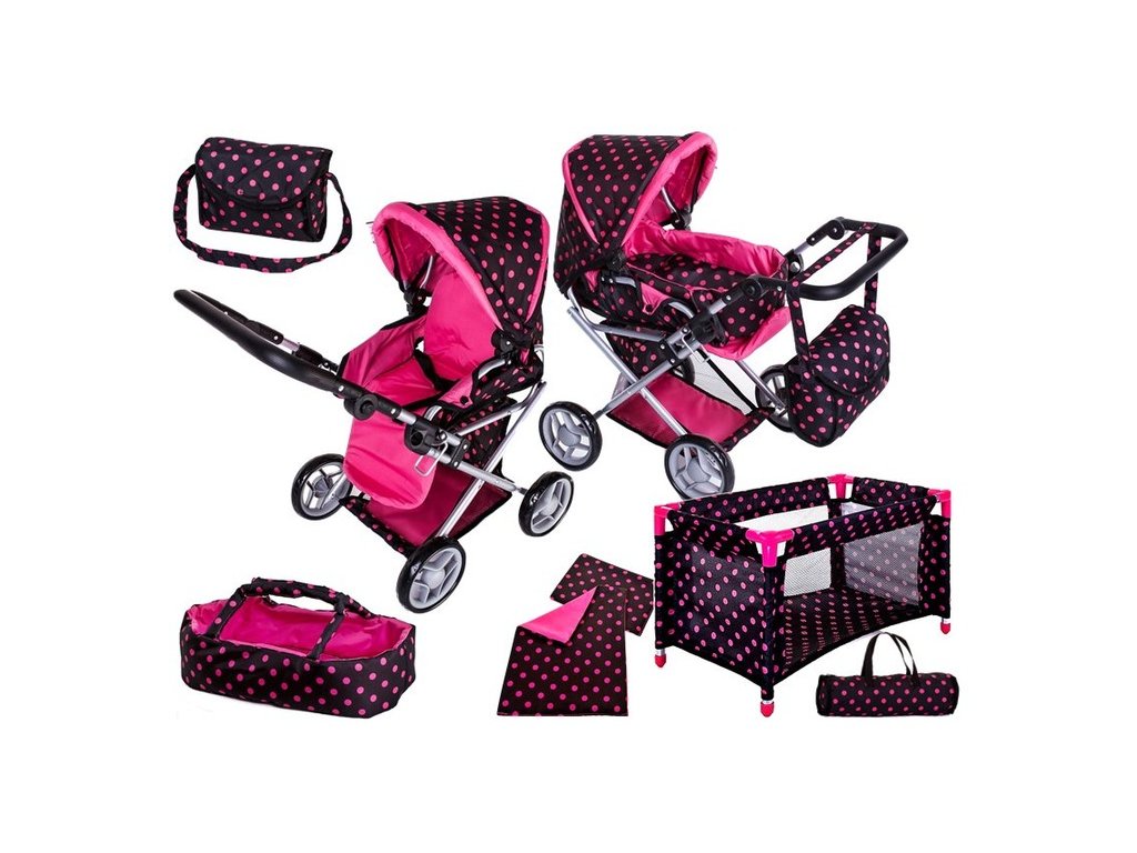 Velký set Doris pro ty nejmenší holčičky. Kombinovaný kočárek pro panenky má velmi lehkou stabilní konstrukci vyrobenou z hliníkových trubek, svrchní část je z impregnované bavlny. Lze ji jednoduše sejmout a kdykoliv vyprat. Rukojeť kočárku je nastavitelná a obalená pěnou. Uvnitř kočárku je nosítko s úchytkami a povlečením sloužící k přenášení panenky. Před automatickým složením chrání dítě blokace. Panenka je proti vypadnutí zabezpečena bezpečnostním pásem. Pěnová kola s disky nezanechávají šmouhy na podlaze. Set dále obsahuje cestovní postýlku, peřinku s polštářkem a tašku na přenos postýlky.