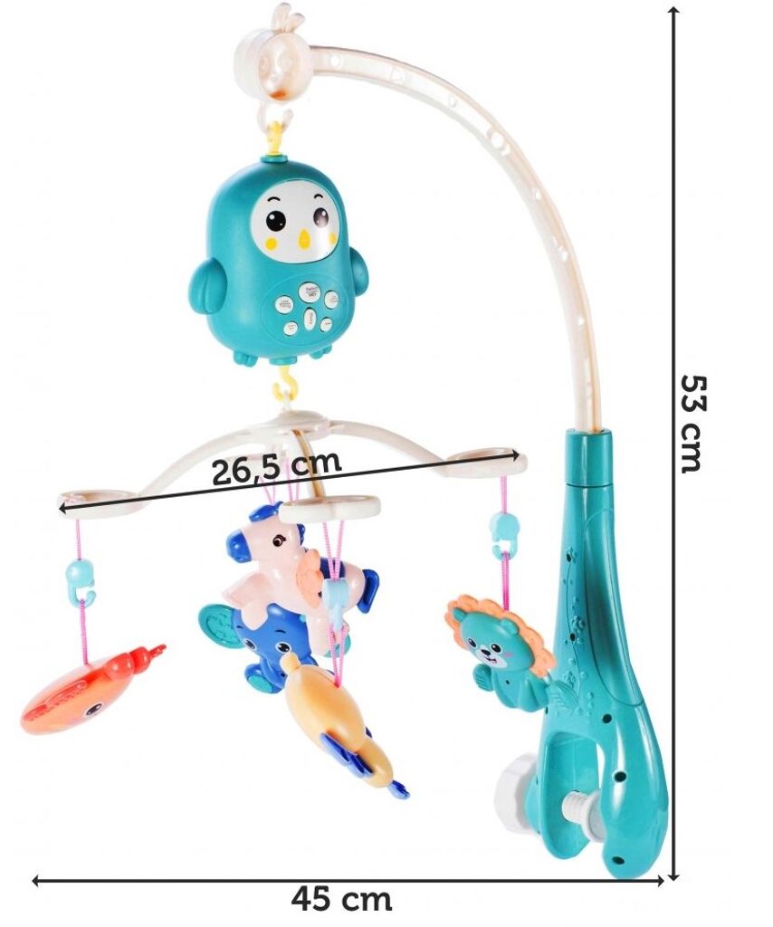 Dětský kolotoč Tučnáček se zavěšenými hračkami a melodiemi pomůže každému dítěti hravě usnout. Hračky ve tvaru zvířátek lze odejmout a použít samostatně. Uvnitř mají kuličky a lze je využít také jako kousátka. Hudební modul ve tvaru tučňáka je vybaven melodiemi, písničkami a také pohádkami (v angličtině). Má svítící křidélka, možnost vypnutí, časovač a regulaci hlasitosti. Kolotoč lze snadno demontovat, můžete to ho tak umístit i nad kočárek. Je určen pro děti od narození.