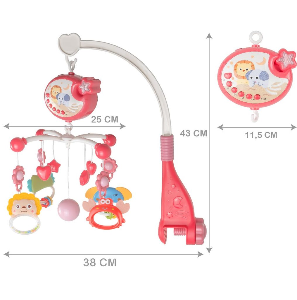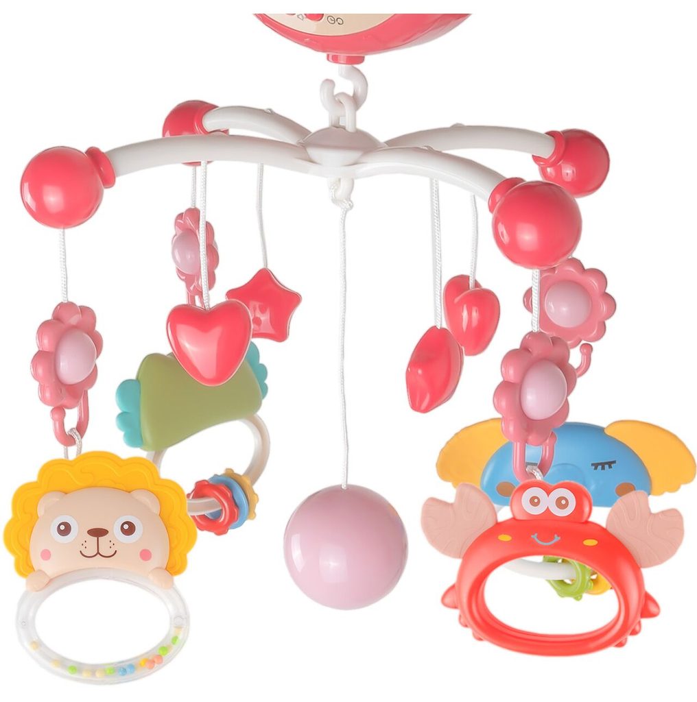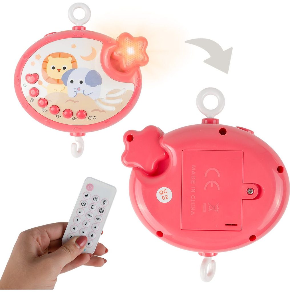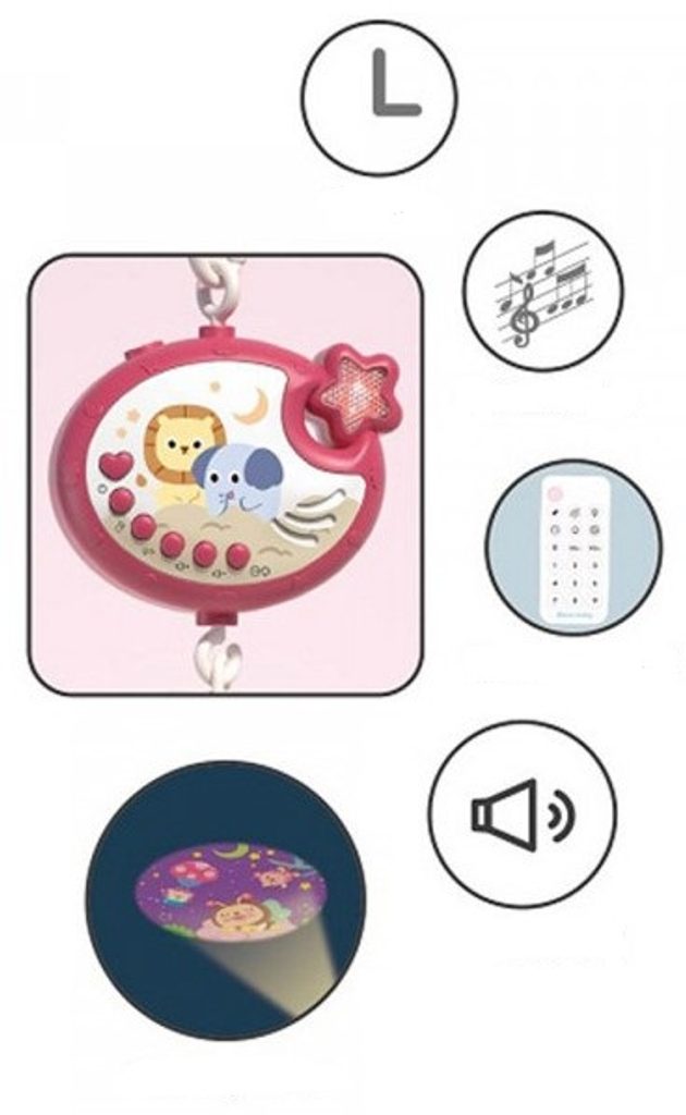Nádherný dětský kolotoč Music Mobile se zavěšenými hračkami a projektorem pomůže každému dítěti hravě usnout. Hračky v provedení chrastítek lze odejmout a použít samostatně. Kolotoč je vybaven uklidňujícími ukolébavkami, vypínačem zvuku a také regulací hlasitosti. Lze ho snadno demontovat, můžete to ho tak umístit i nad kočárek. Je určen pro děti od narození.