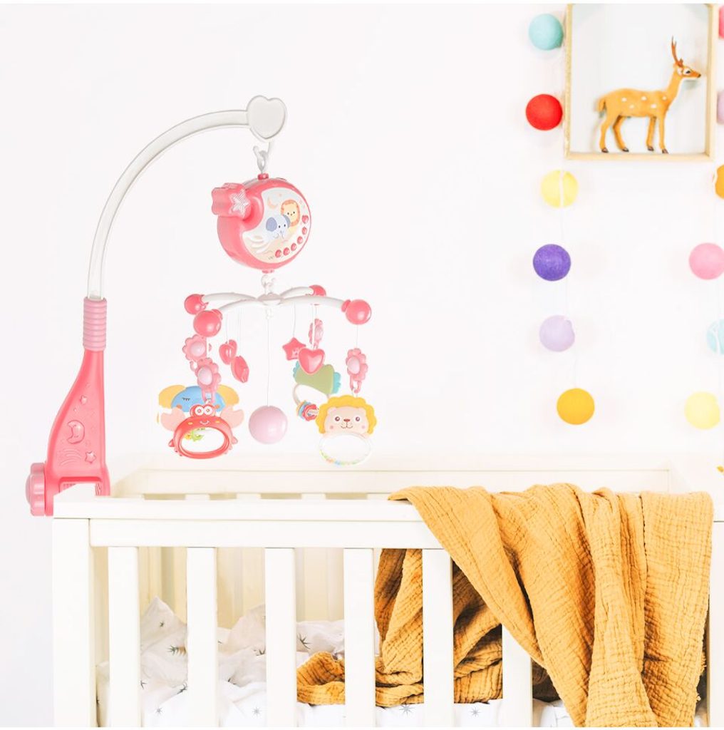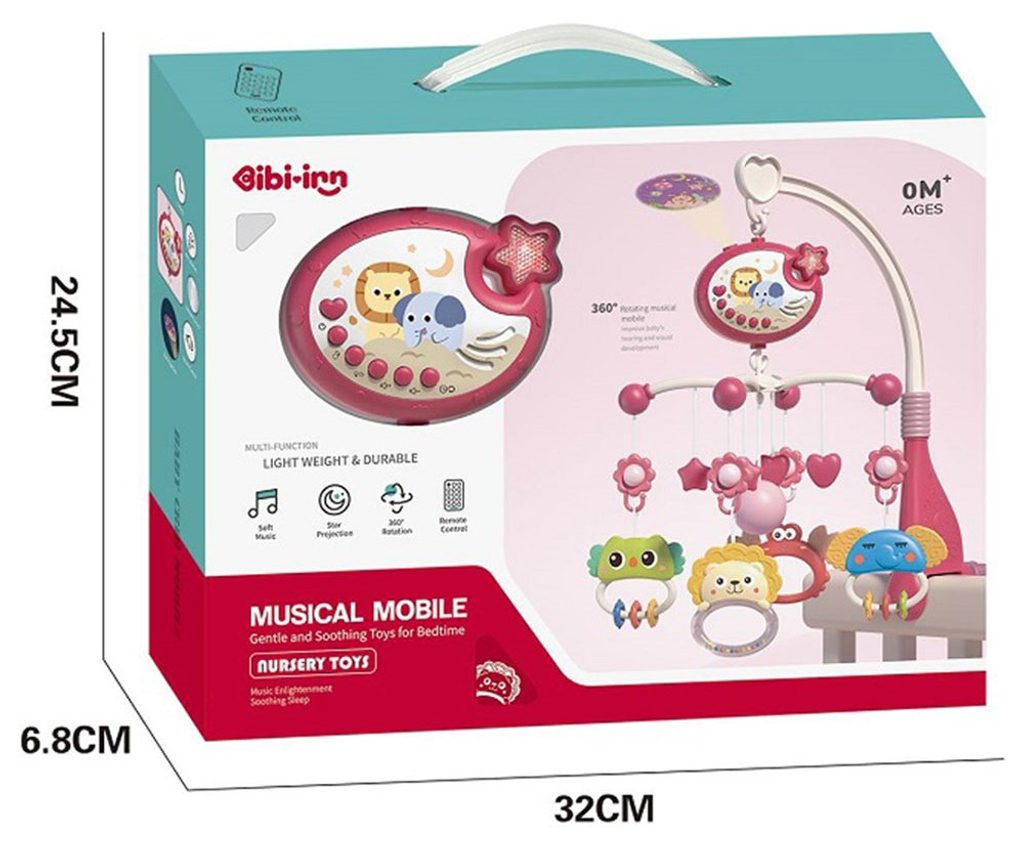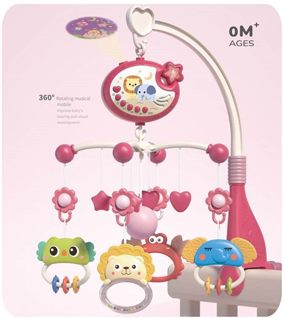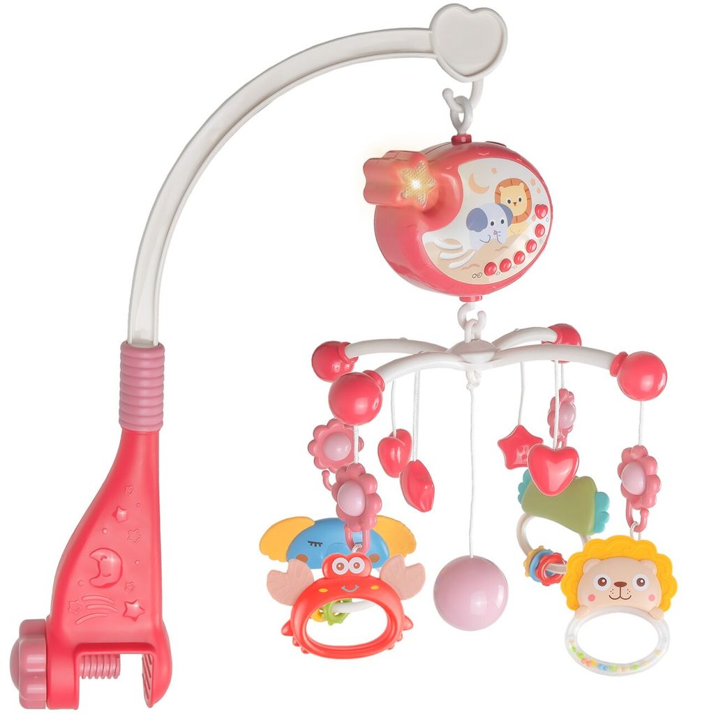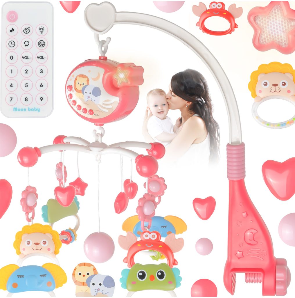 Nádherný dětský kolotoč Music Mobile se zavěšenými hračkami a projektorem pomůže každému dítěti hravě usnout. Hračky v provedení chrastítek lze odejmout a použít samostatně. Kolotoč je vybaven uklidňujícími ukolébavkami, vypínačem zvuku a také regulací hlasitosti. Lze ho snadno demontovat, můžete to ho tak umístit i nad kočárek. Je určen pro děti od narození.