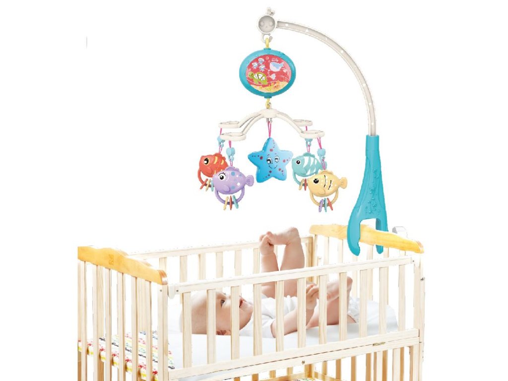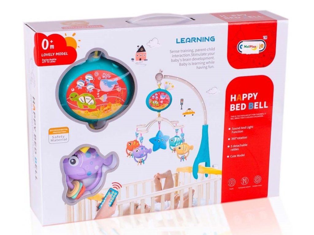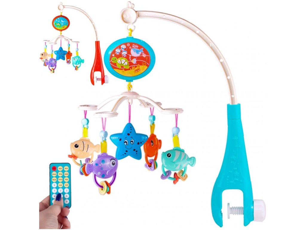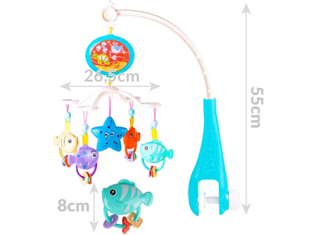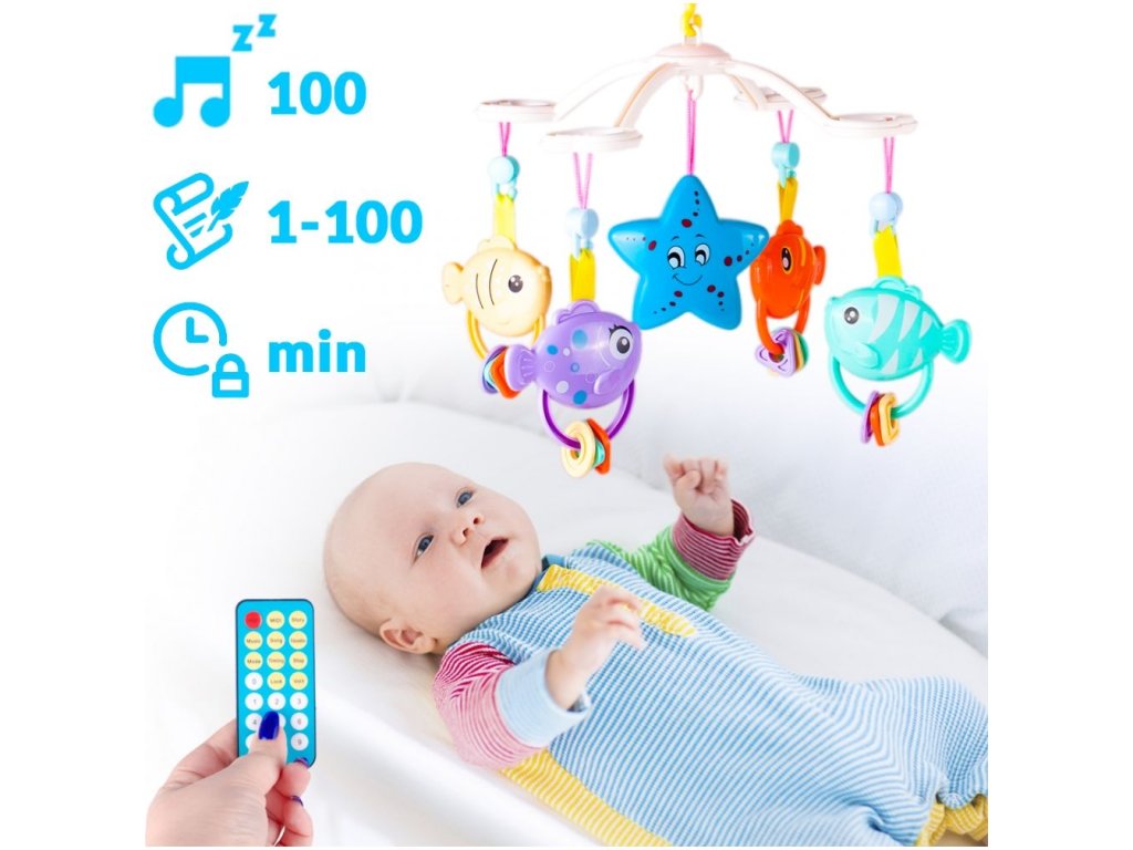 Nádherný dětský kolotoč Vodní Krajina se zavěšenými hračkami a projektorem, který zobrazuje hvězdičky na stropě pomůže každému dítěti hravě usnout. Hračky ve tvaru rybiček a hvězdice lze odejmout a použít samostatně. Kolotoč je vybaven uklidňujícími melodiemi, ukolébavkami, naukou anglických slovíček, vypínačem zvuku o otáčení kolotoče a také regulací hlasitosti. Lze ho snadno demontovat, můžete to ho tak umístit i nad kočárek. Je určen pro děti od narození.