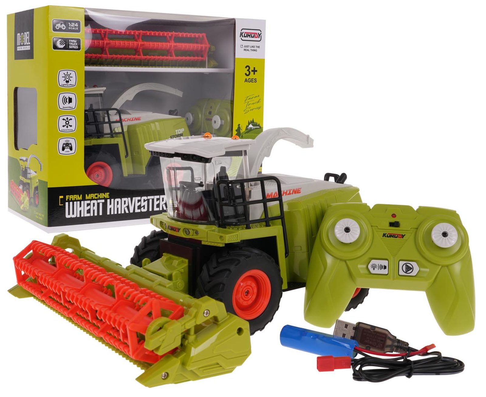 Kombajn Wheat Harvester s dálkovým ovládáním 2,4GHz je dokonalou imitací skutečného kombajnu. Umožnuje jízdu dopředu a dozadu, zatáčí doprava a doleva. Během jízdy blikají světýlka. Součástí balení je dálkový ovladač který je napájen bateriemi, které nejsou součástí balení. Samotný kombajn je napájen akumulátorem, který se nabíjí přiloženou USB nabíječkou. Kombajn je vyroben z plastu a má certifikaci CE.