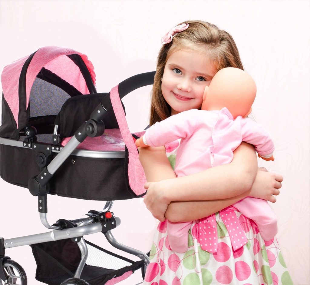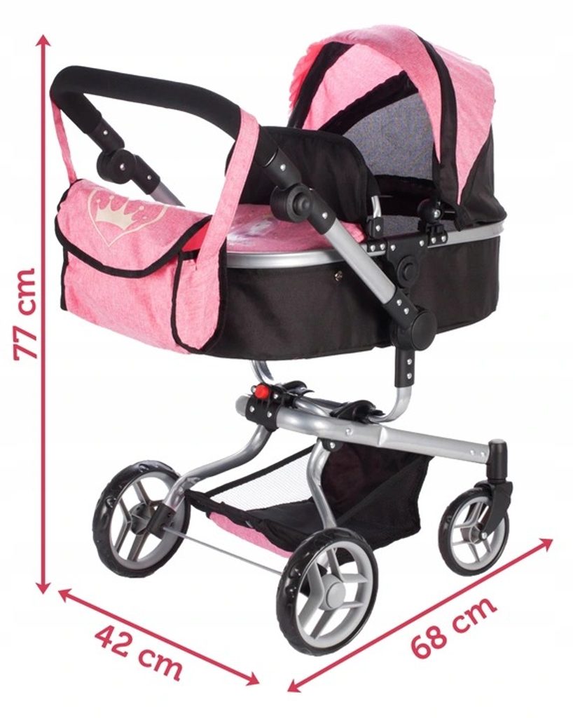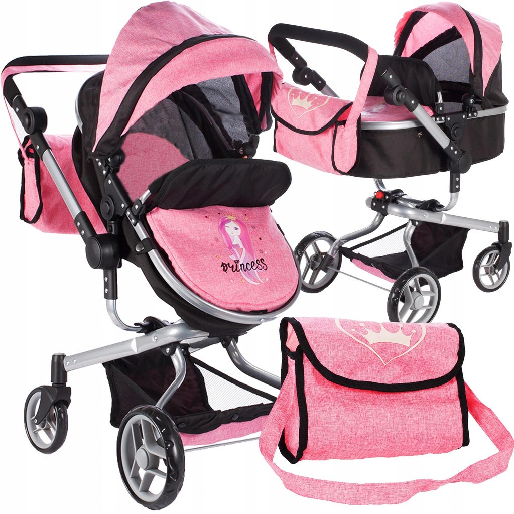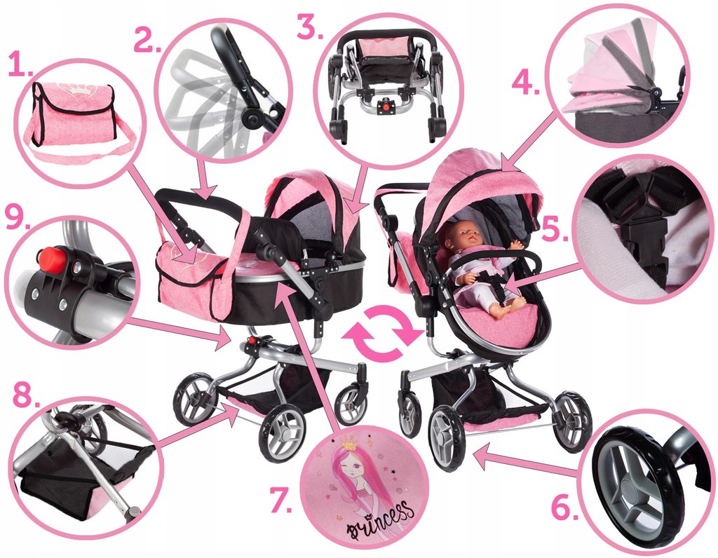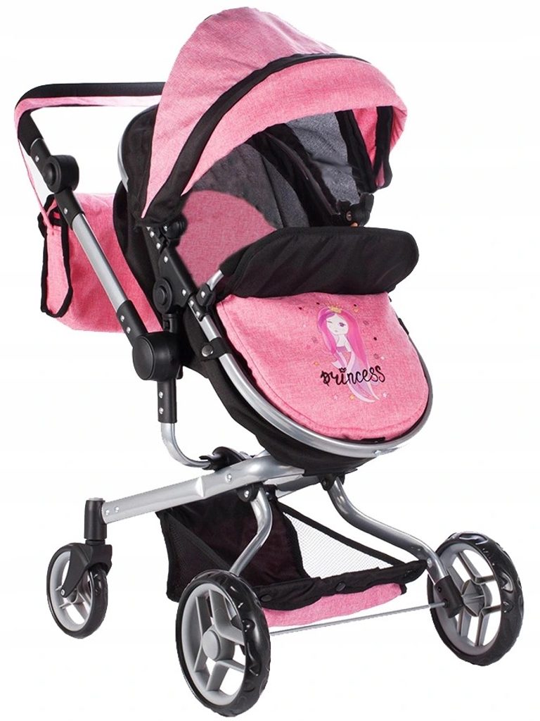 Kombinovaný kočárek pro panenky Princess 2v1. Má velmi lehkou stabilní konstrukci vyrobenou z hliníkových trubek, svrchní část je z impregnované bavlny. Lze ji jednoduše sejmout a kdykoliv vyprat. Před automatickým složením chrání dítě blokace. Panenka je ve sportovní verzi proti vypadnutí zabezpečena bezpečnostním pásem. Jednoduchá změna z hluboké na sportovní verzi. Ve spodní části je umístěn koš a kočárek má praktickou závěsnou tašku.