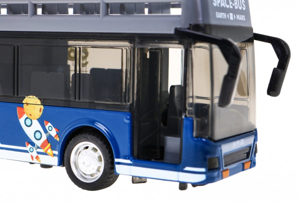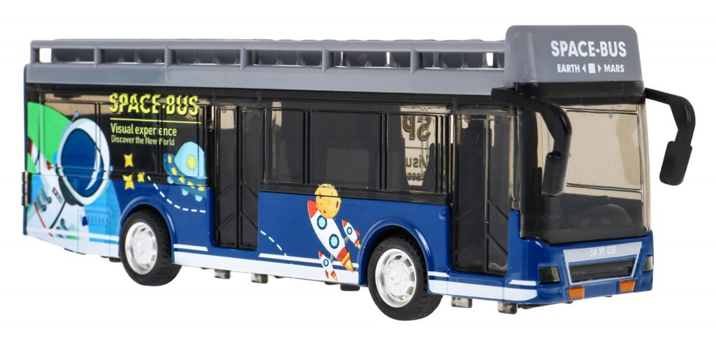Kovový model autobusu Space Bus je ideální hračkou pro rozvoj manuální zručnosti a logického myšlení. Má přední pohon na setrvačník, zvukové efekty a světýlka. Ty se spouštějí při otevření předních dveří. Autobus je vyroben ve zcela realistickém provedení a v nádherném barevném provedení. Hračka je určena pro děti od 36 měsíců věku.