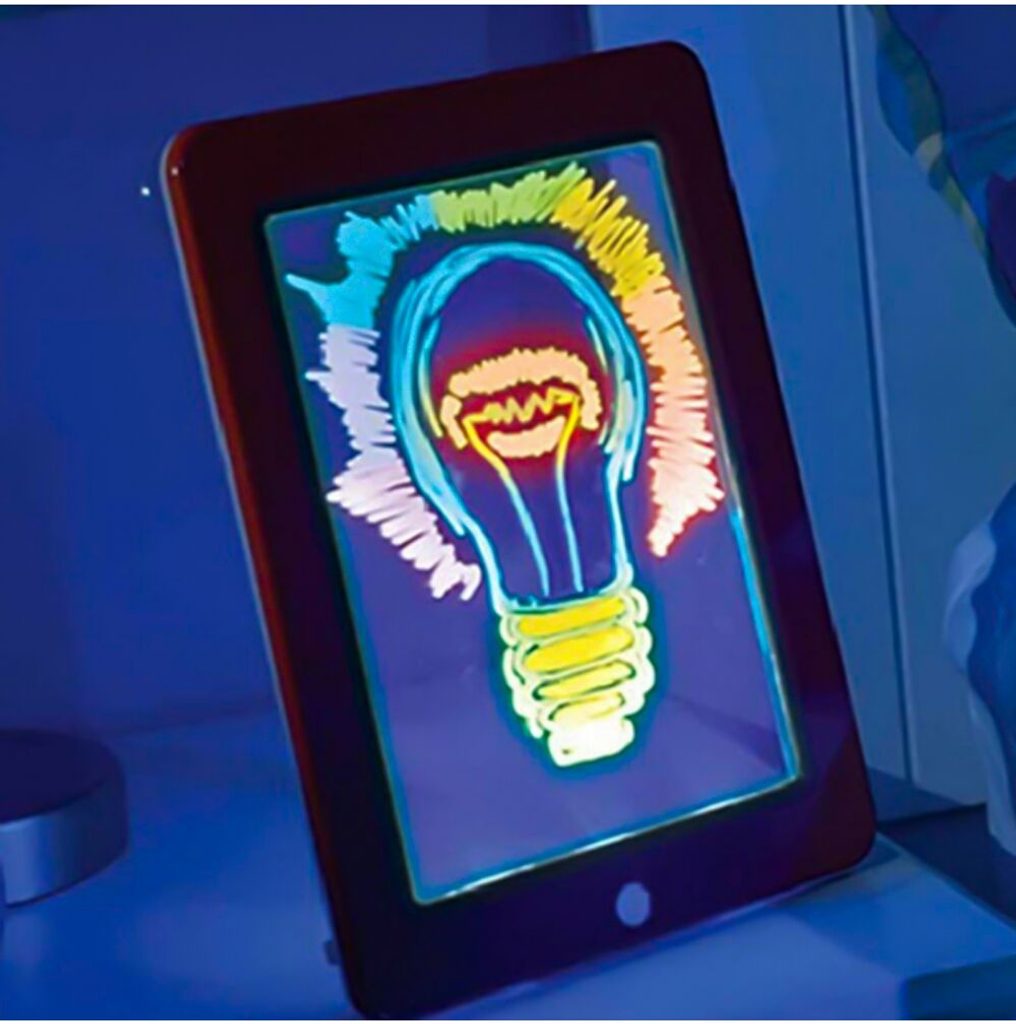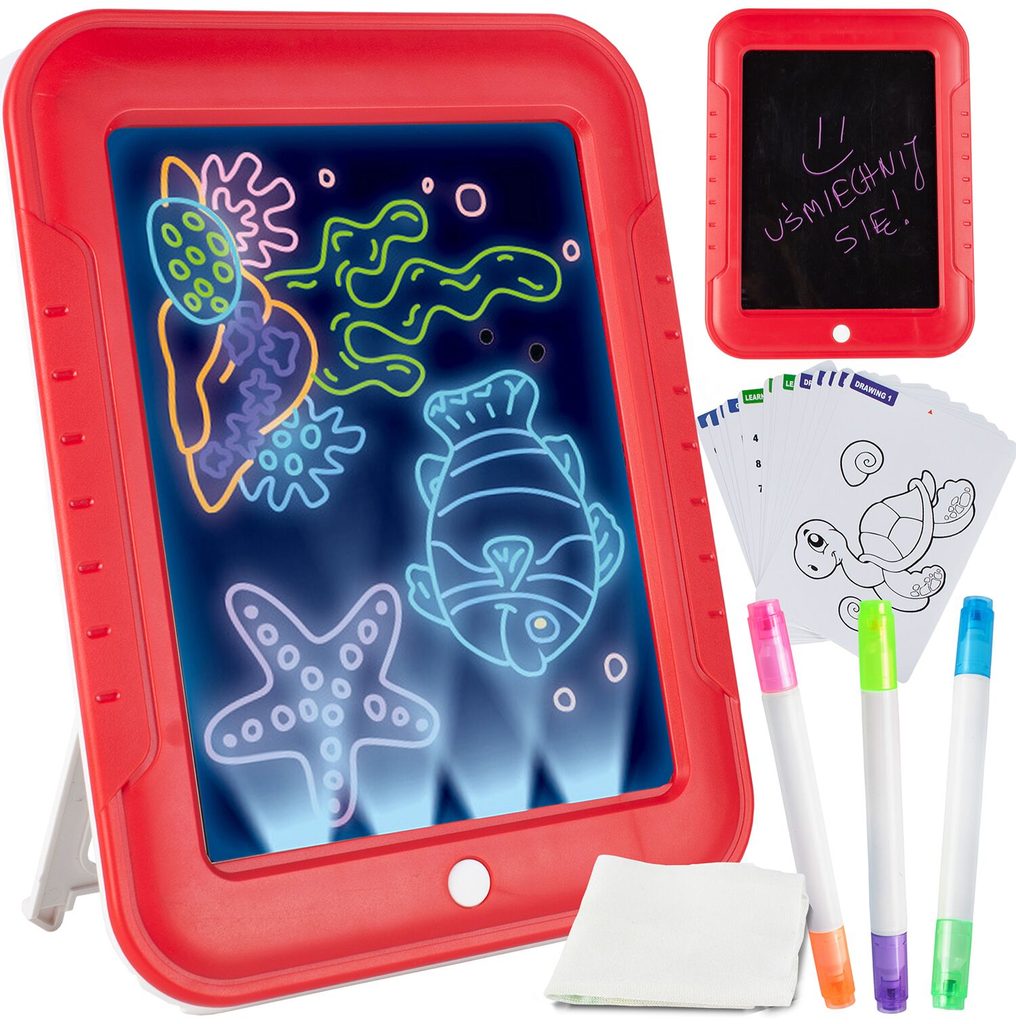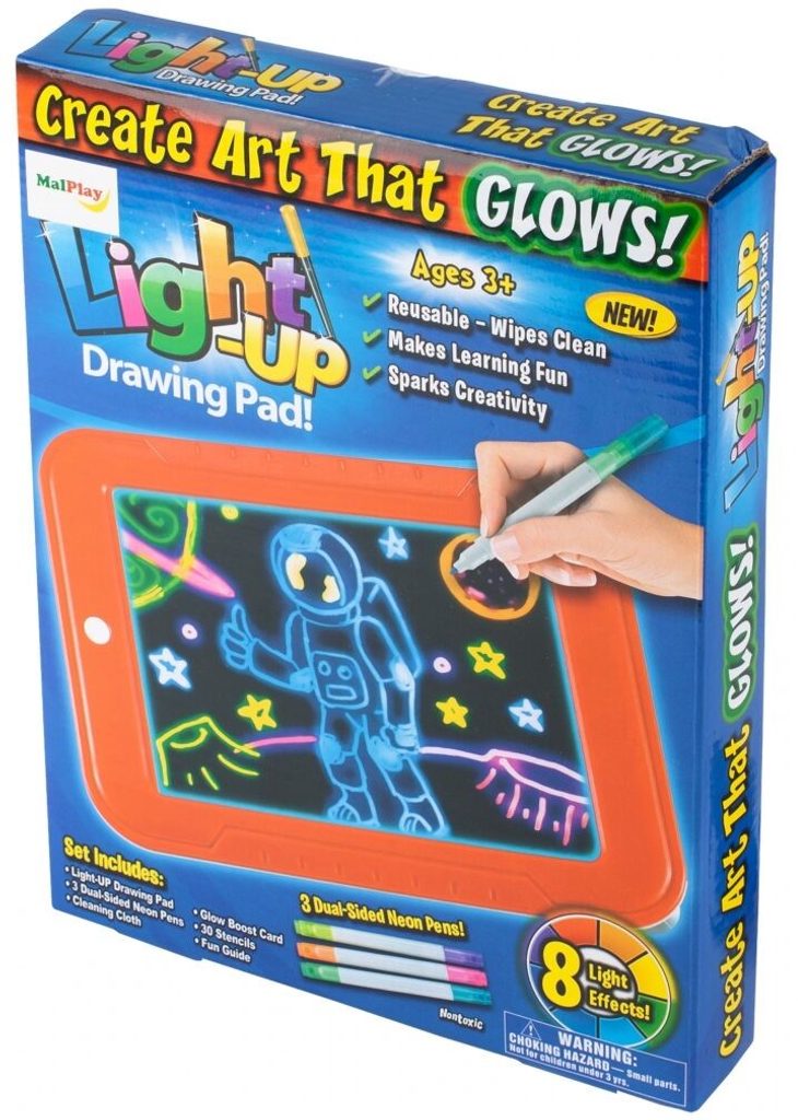Tento tablet s LED podsvícením Drawing Pad pro tvorbu neonových kreseb si oblíbí každý malý umělec. Plocha tabletu má možnost osvětlení v několika barvách. Vše, co musí dítě udělat, je zapojit svou fantazii a použít přiložené neonové barevné fixy k vytvoření vlastních kreseb a obrázků. Sada obsahuje pomocné obrázky a nákresy, díky kterým bude snazší kreslit vlastní umělecká díla. Součástí sady je i hadřík, díky kterému vytvoříme neomezené množství kreseb. Tablet lze využít i jako obraz, který se bude hodit jako dekorace do pokoje nebo. Hračka je určena pro děti od 36 měsíců věku.
