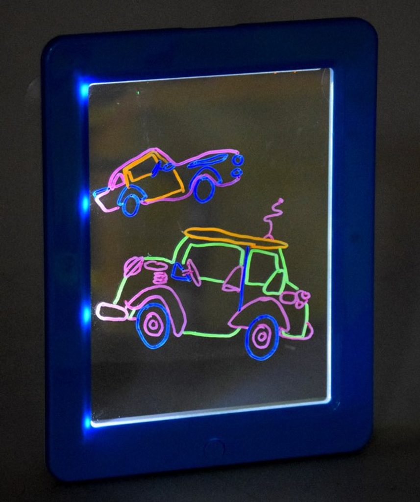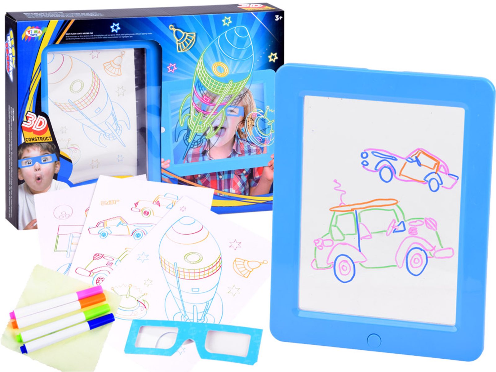 Tuto osvětlenou tabuli Glow Drawing pro tvorbu neonových kreseb si oblíbí každý malý umělec. Kreativní tabulka má možnost osvětlení. Vše, co musí dítě udělat, je zapojit svou fantazii a použít přiložené neonové barevné fixy k vytvoření vlastních kreseb a obrázků. Sada obsahuje pomocné obrázky a nákresy, díky kterým bude snazší kreslit vlastní umělecká díla. Dítě bude moci pomocí přiložených 3D brýlí vidět své obrázky v trojrozměrných rozměrech, což přinese ještě více radosti. Součástí sady je i hadřík, díky kterému vytvoříme neomezené množství kreseb. Tabulku lze využít i jako obraz, který se bude hodit jako dekorace do pokoje nebo i jako lampička. Hračka je určena pro děti od 36 měsíců věku.