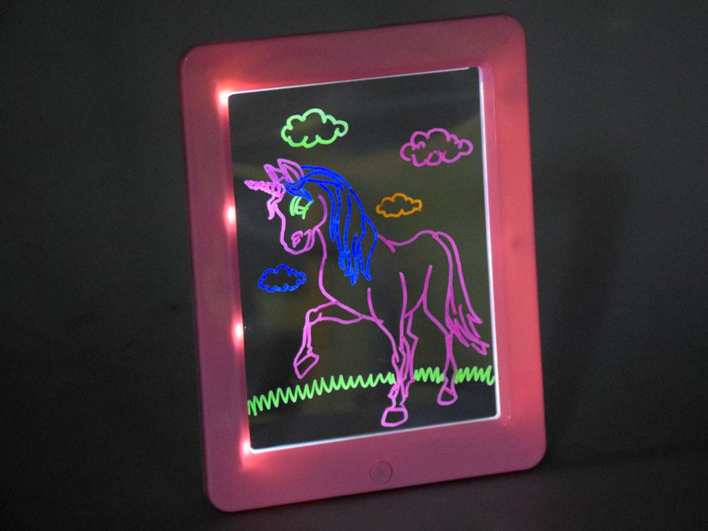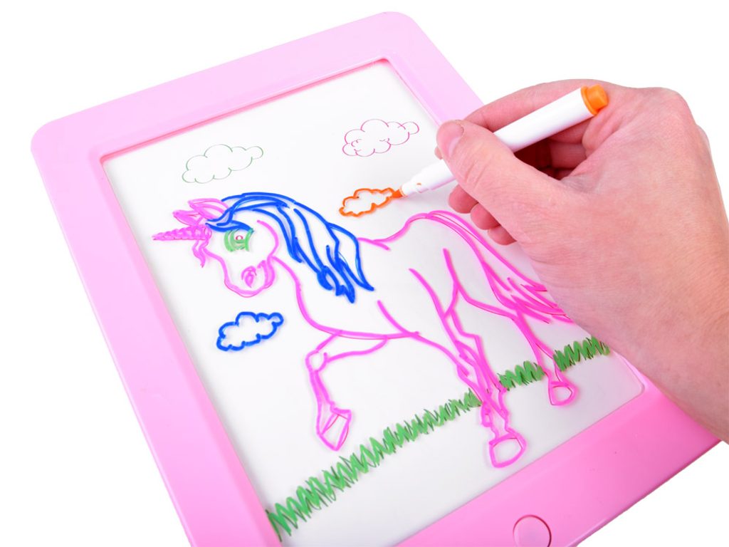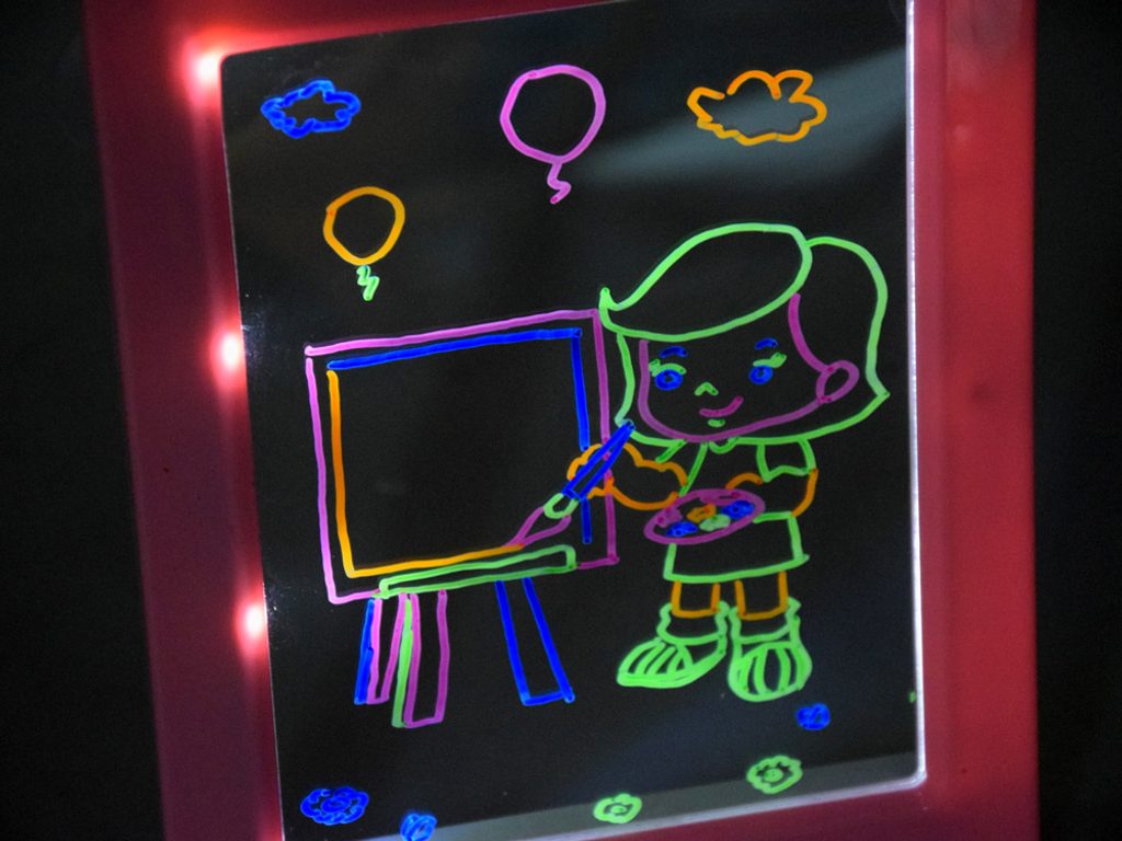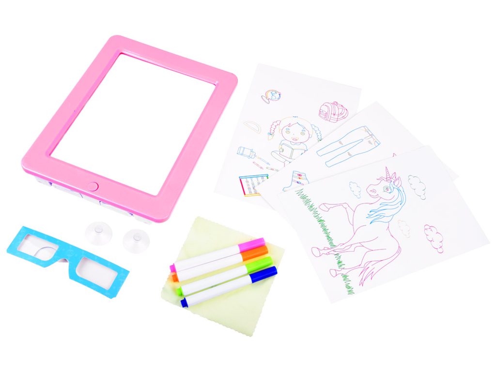 • podsvícená tabulka o velikosti 23 x 18 cm pro psaní a kreslení fixem