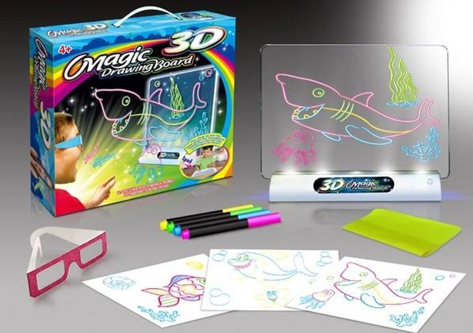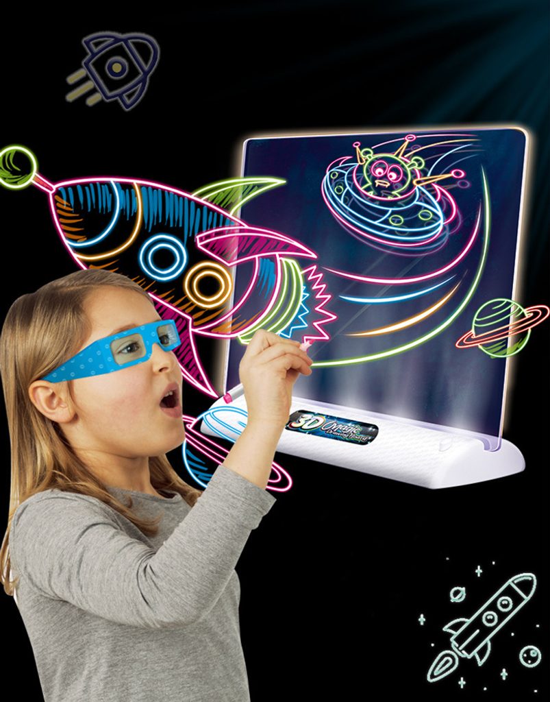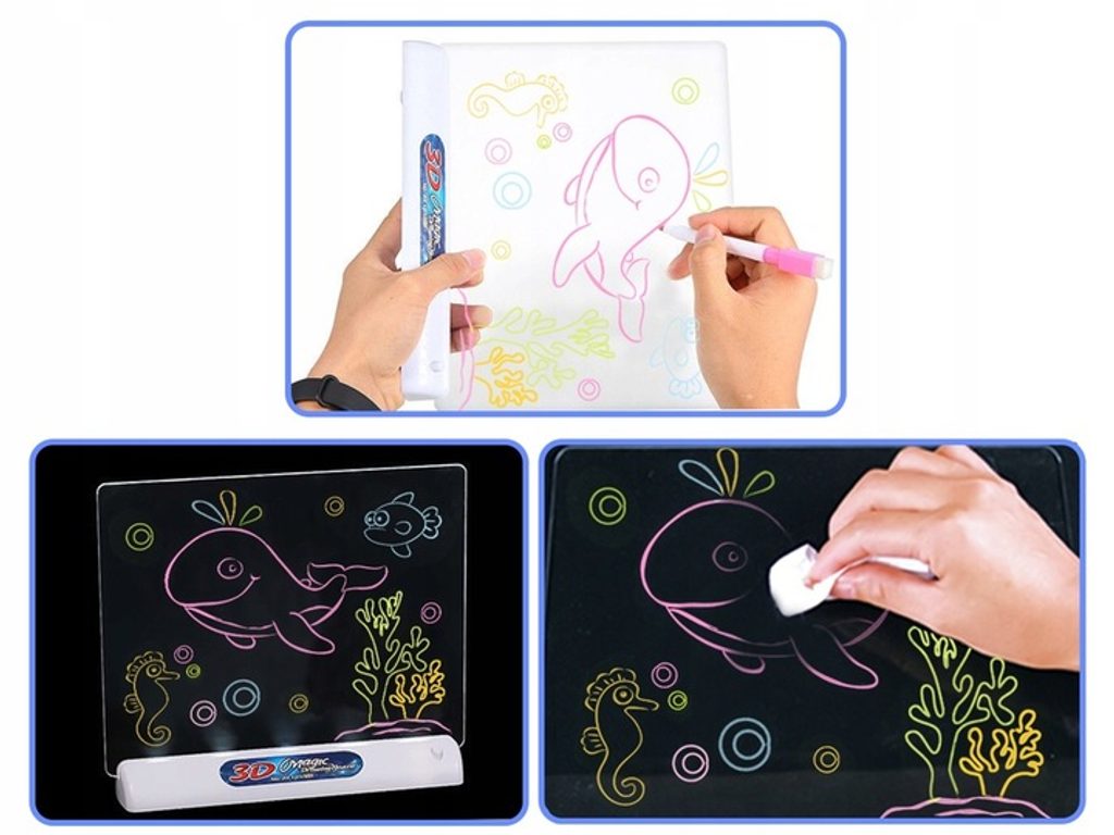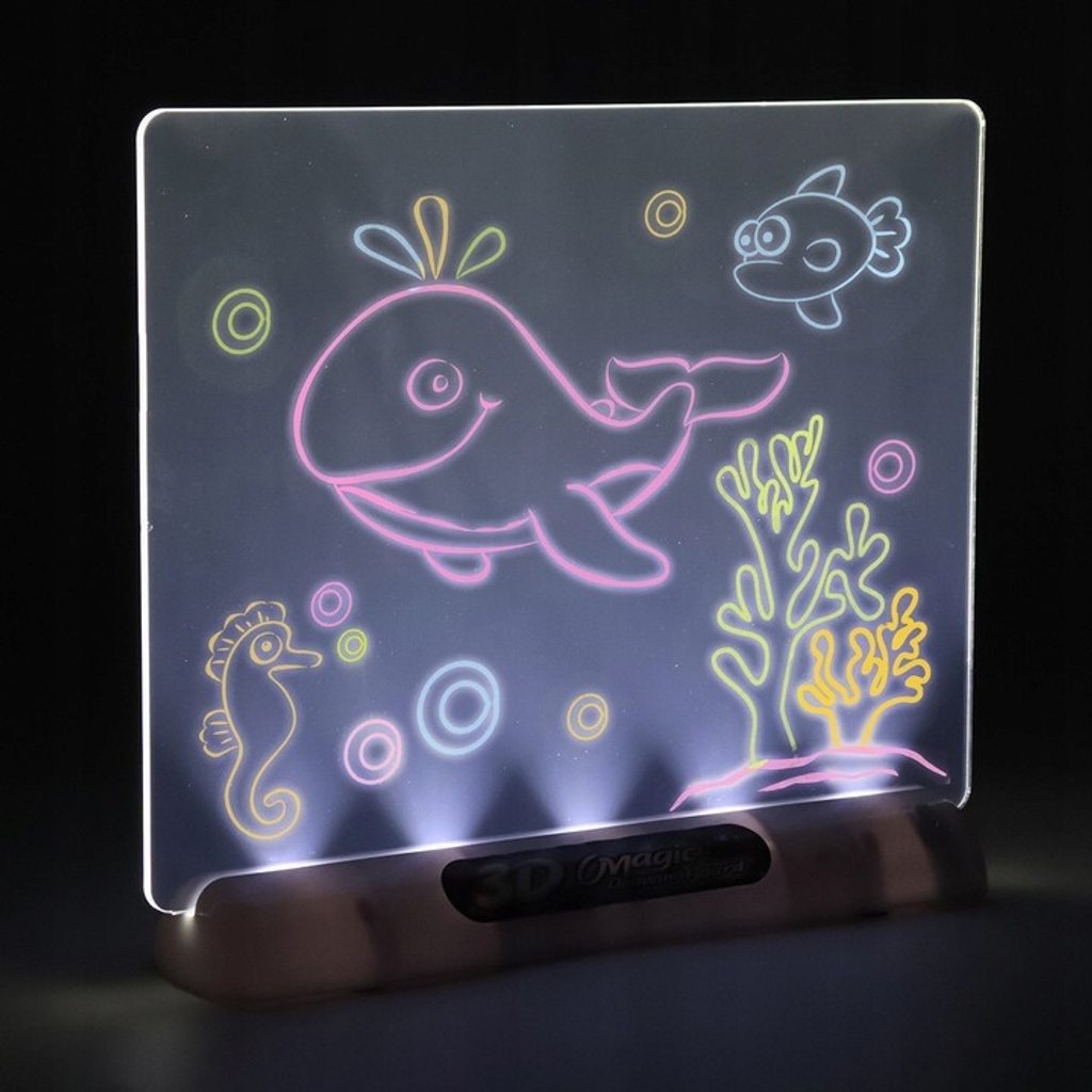 Tuto osvětlenou tabuli Drawing Board pro tvorbu neonových kreseb si oblíbí každý malý umělec. Kreativní tabulka má možnost osvětlení. Vše, co musí dítě udělat, je zapojit svou fantazii a použít přiložené neonové barevné fixy k vytvoření vlastních kreseb a obrázků. Sada obsahuje pomocné obrázky a nákresy, díky kterým bude snazší kreslit vlastní umělecká díla. Dítě bude moci pomocí přiložených 3D brýlí vidět své obrázky v trojrozměrných rozměrech, což přinese ještě více radosti. Součástí sady je i hadřík, díky kterému vytvoříme neomezené množství kreseb. Hračka je určena pro děti od 36 měsíců věku.