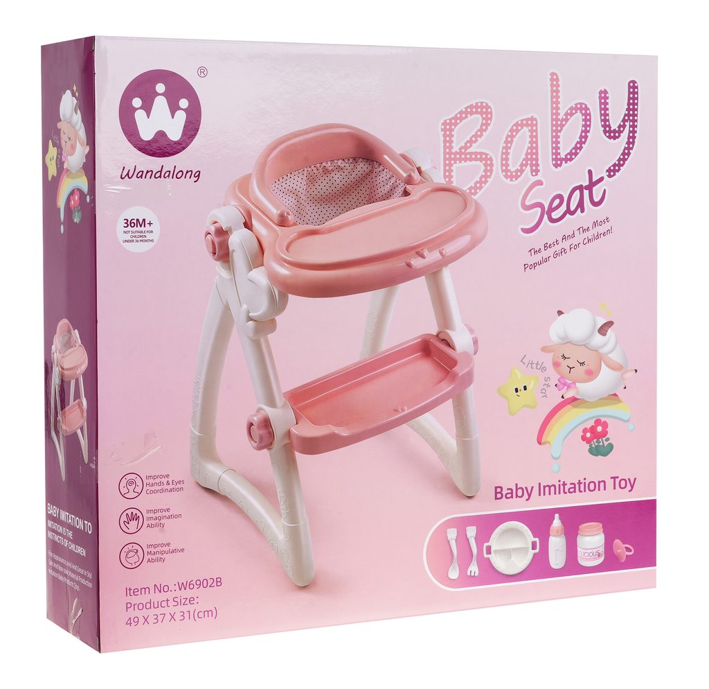 Krmící židlička pro panenky Baby Seat musí být součástí pokojíčku každé malé princezny. Sada je vybavena dalším příslušenstvím jako je miska, vidlička, lžička, pudr a dudlík. Vaše dítě lze nalezne vše pro péči o svou oblíbenou panenku. Hračka je určena pro děti od 36 měsíců věku.