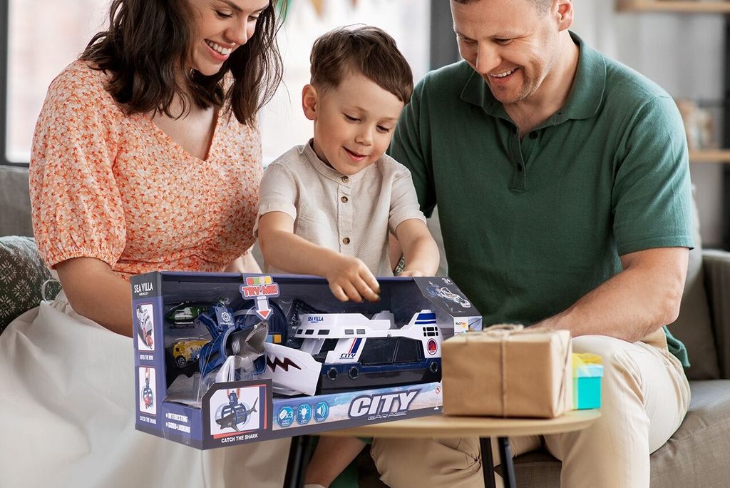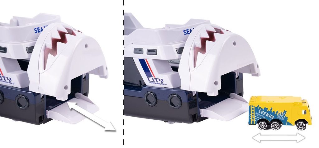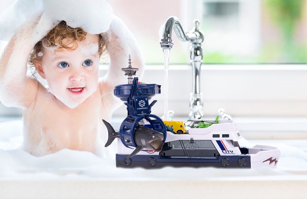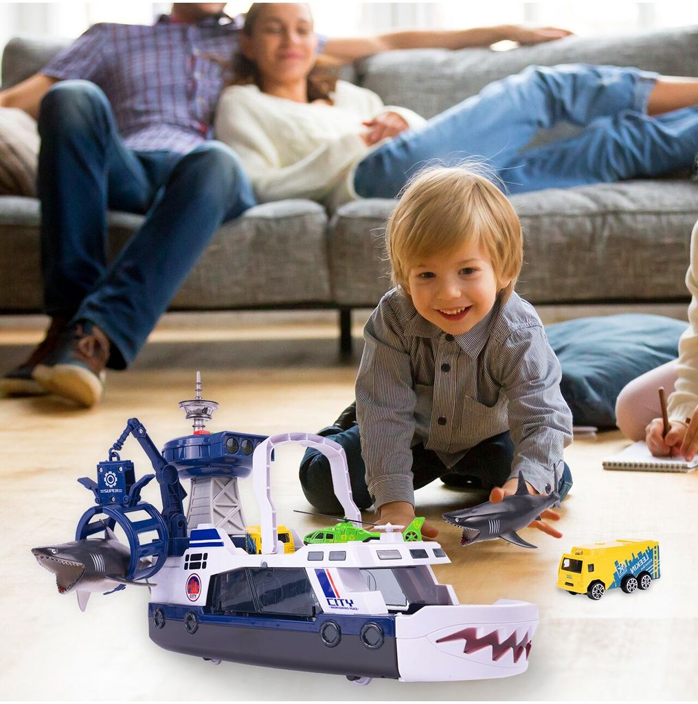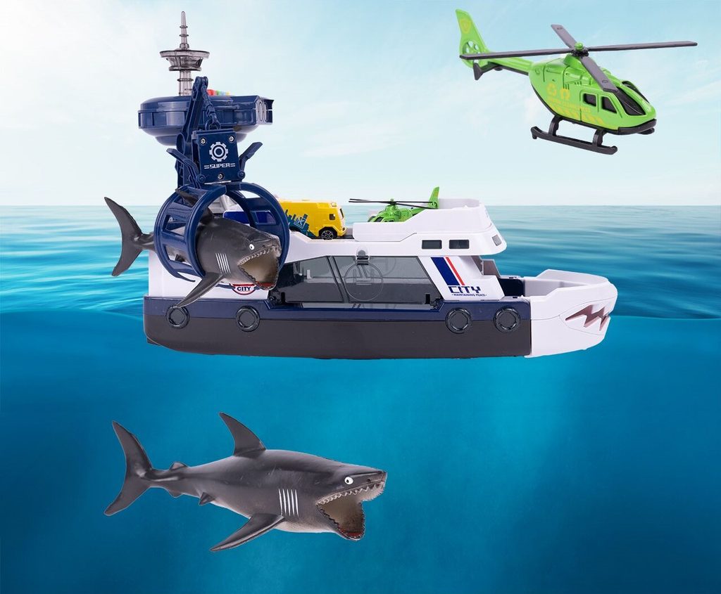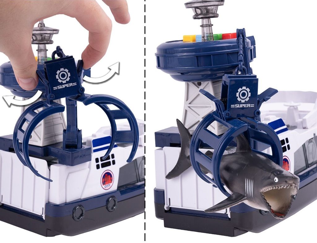 Loď na baterie Shark Boat je ideální hračkou každého malého námořníka. Napomáhá rozvoji manuální zručnosti, logického myšlení a představivosti. Je vybavena řídící věží s tlačítky, které vydávají různé zvuky a světelné efekty. V zadní části je umístěný odpalovač autíček. Součástí lodě je přistávací plocha vrtulníku, žralok, nákladní autíčko a helikoptéra. Hračka je určena pro děti od 36 měsíců věku.