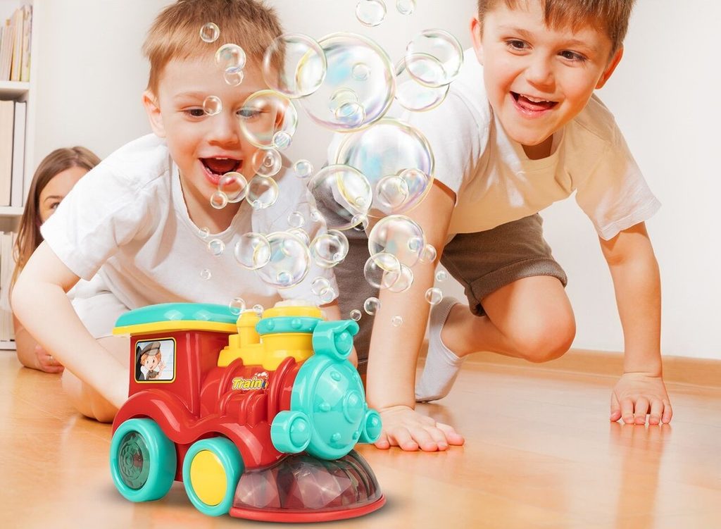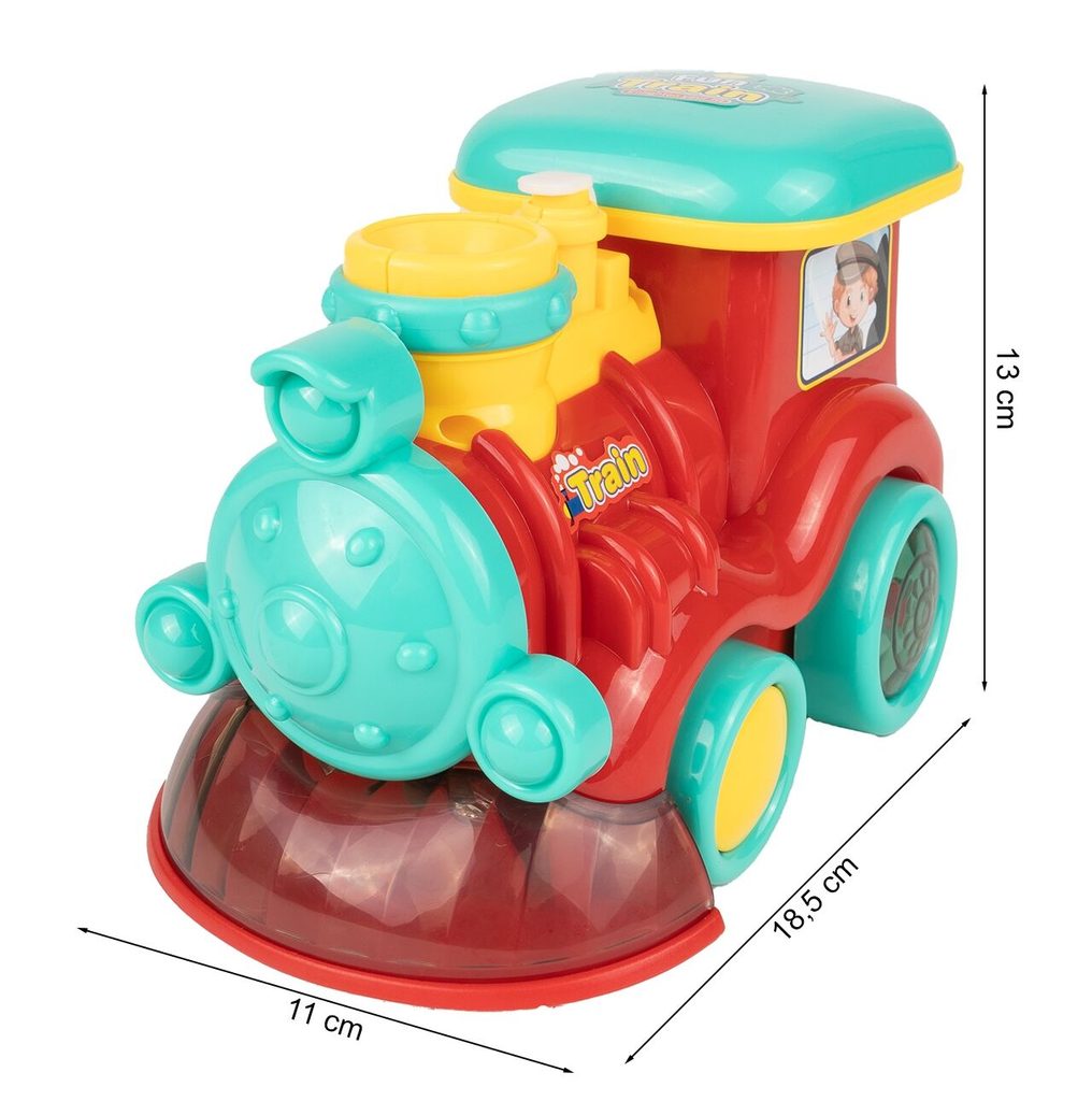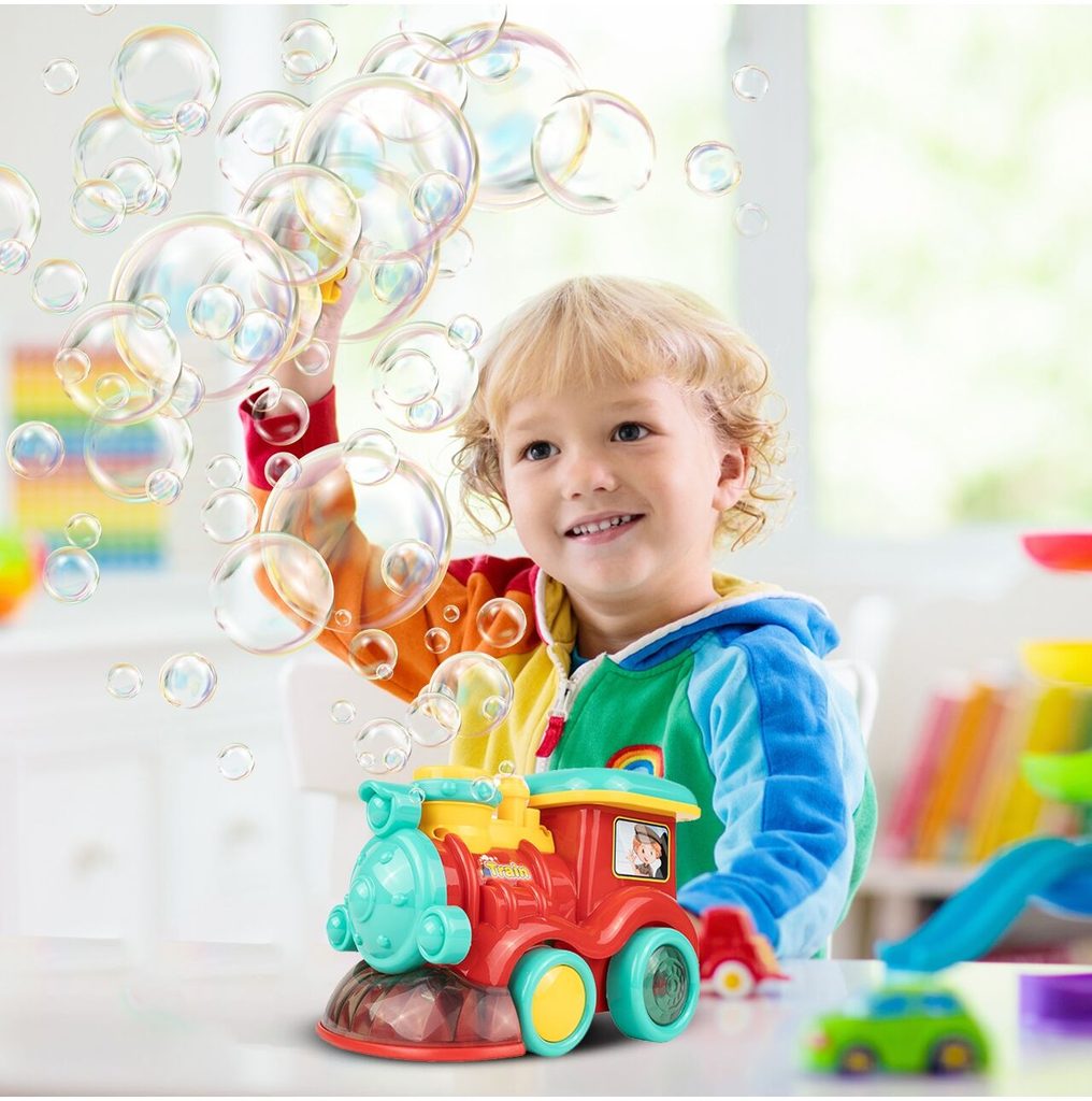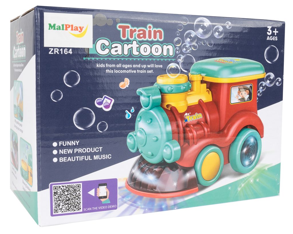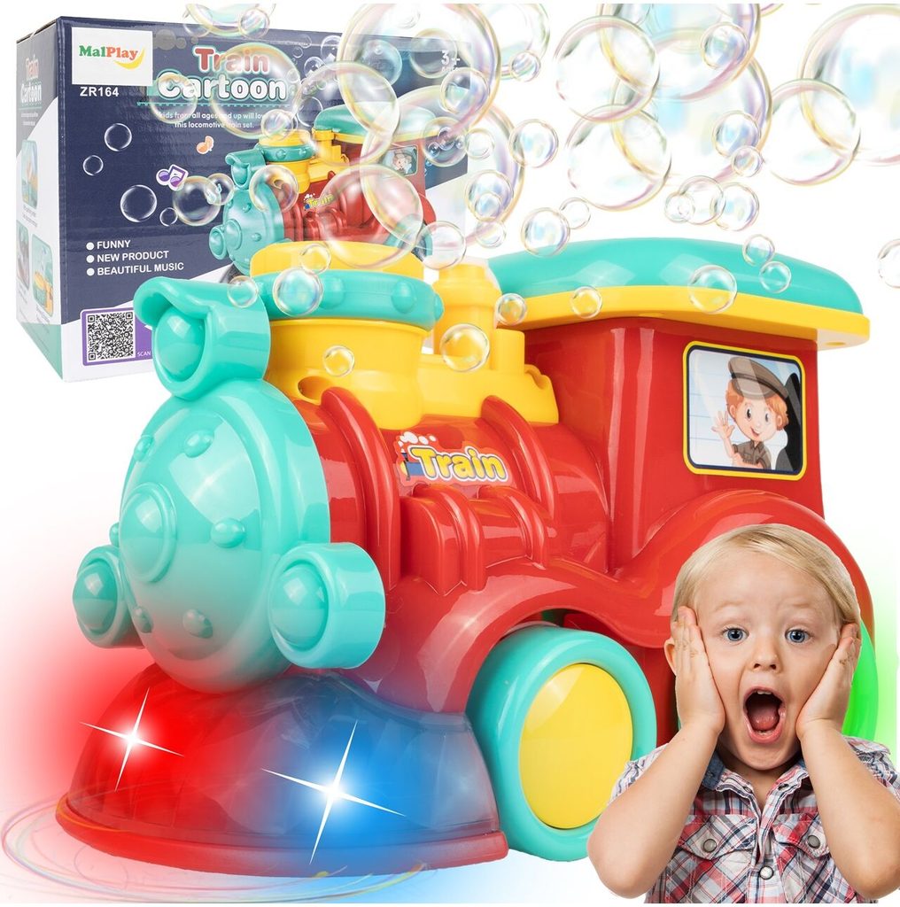 Dětská lokomotiva s bublifukem Happy Train dokáže vytvořit nekonečné množství bublin. Má nádrž umístěnou v motoru do které se nalévá mýdlový roztok. Bubliny vychází s komínu lokomotivy. Během jízdy se spustí melodie a rozsvítí zadní kola. Lokomotiva jezdí všemi směra. Hračka je vyrobena z plastu a je určena pro děti od 36 měsíců věku.
