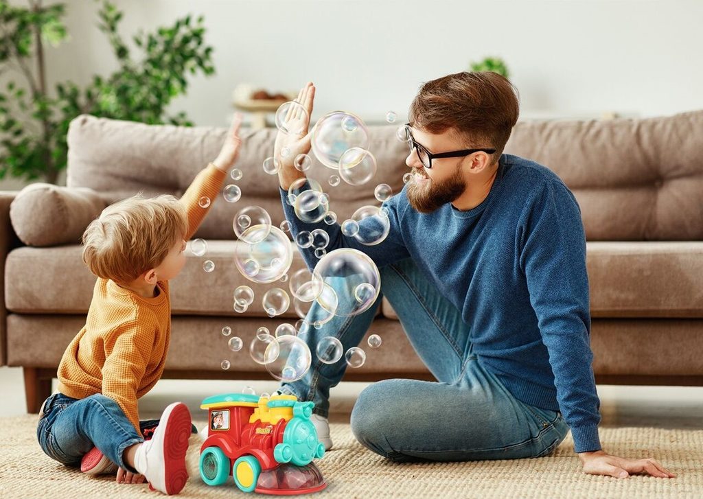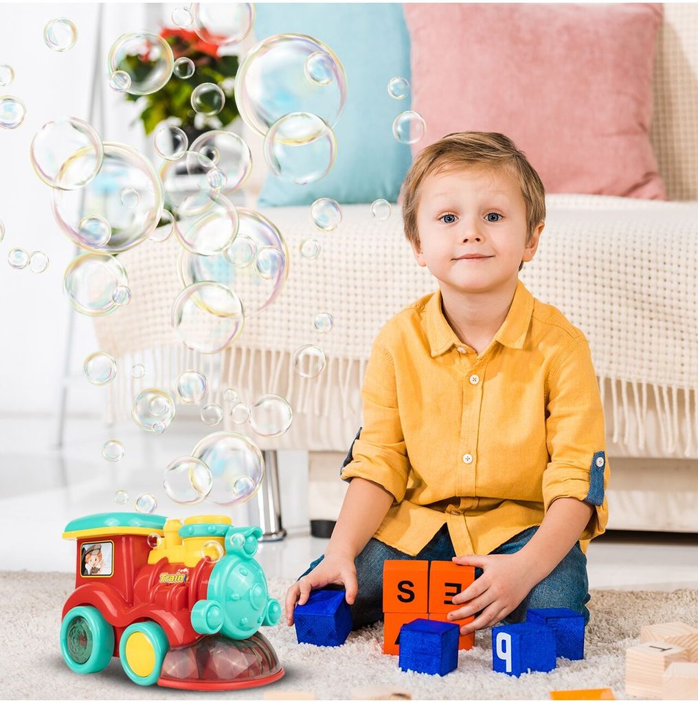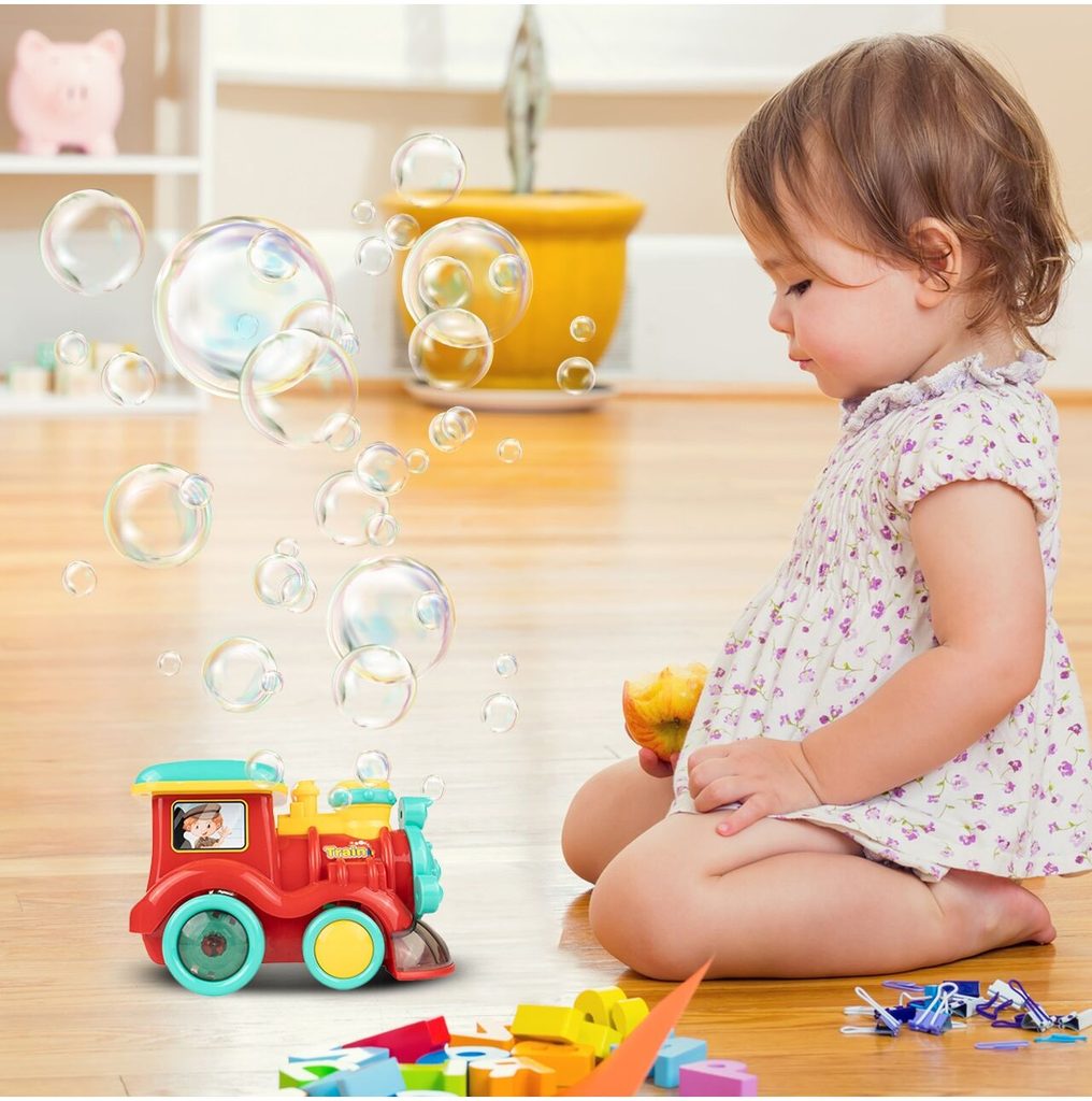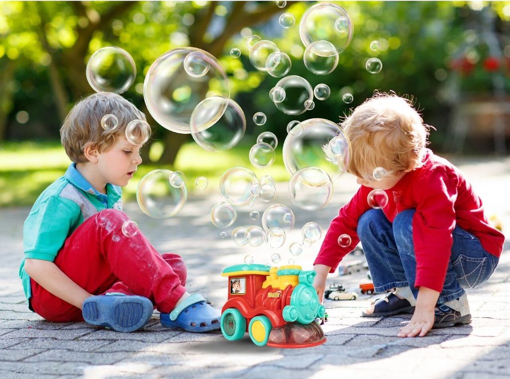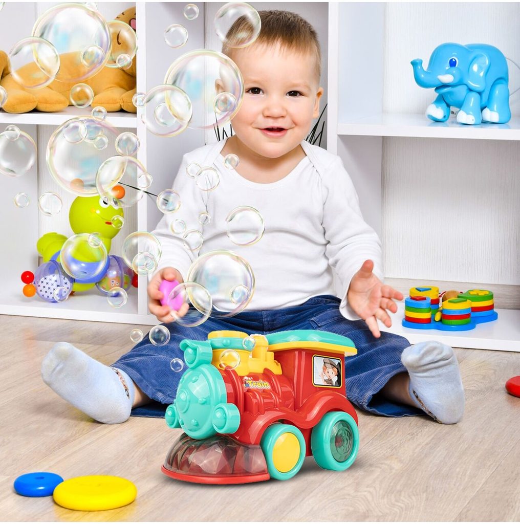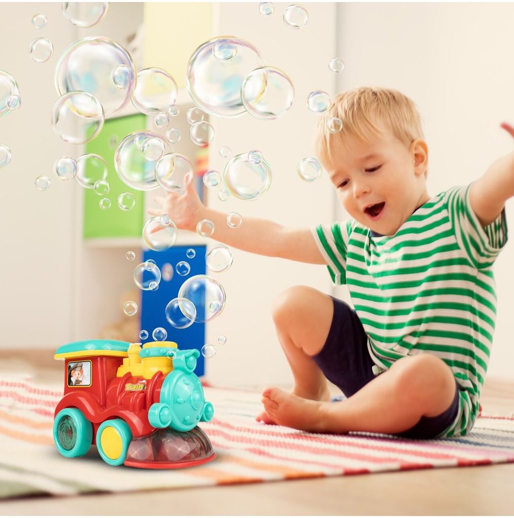 Dětská lokomotiva s bublifukem Happy Train dokáže vytvořit nekonečné množství bublin. Má nádrž umístěnou v motoru do které se nalévá mýdlový roztok. Bubliny vychází s komínu lokomotivy. Během jízdy se spustí melodie a rozsvítí zadní kola. Lokomotiva jezdí všemi směra. Hračka je vyrobena z plastu a je určena pro děti od 36 měsíců věku.
