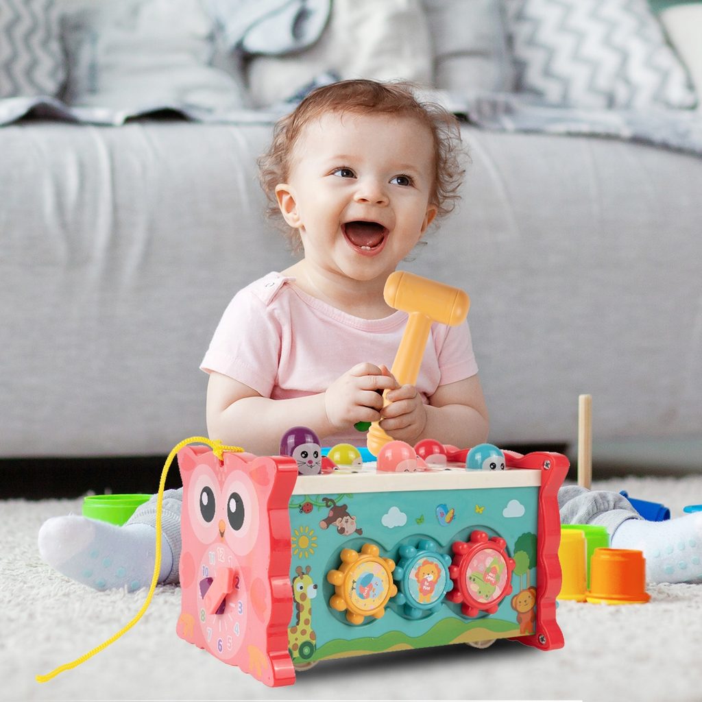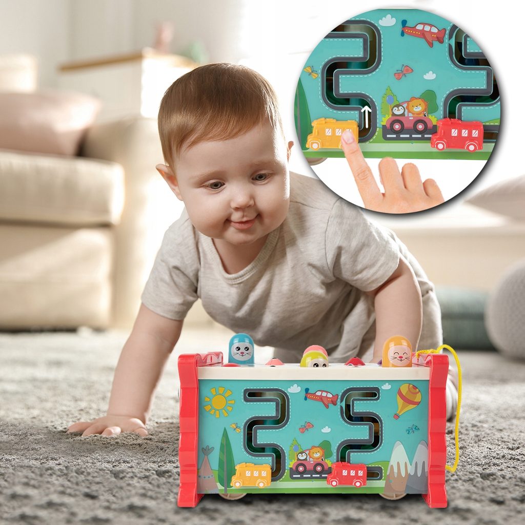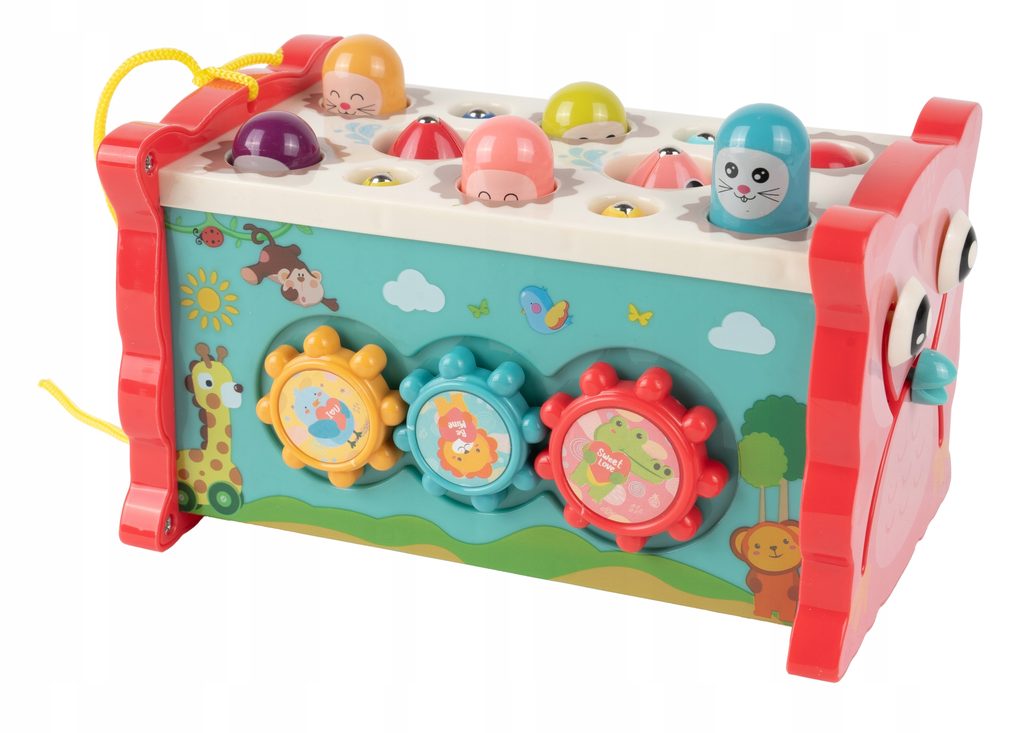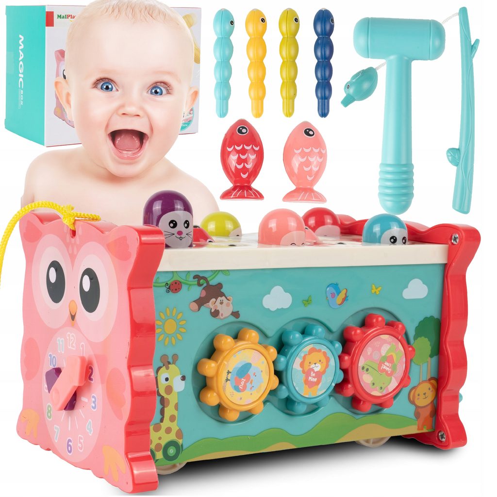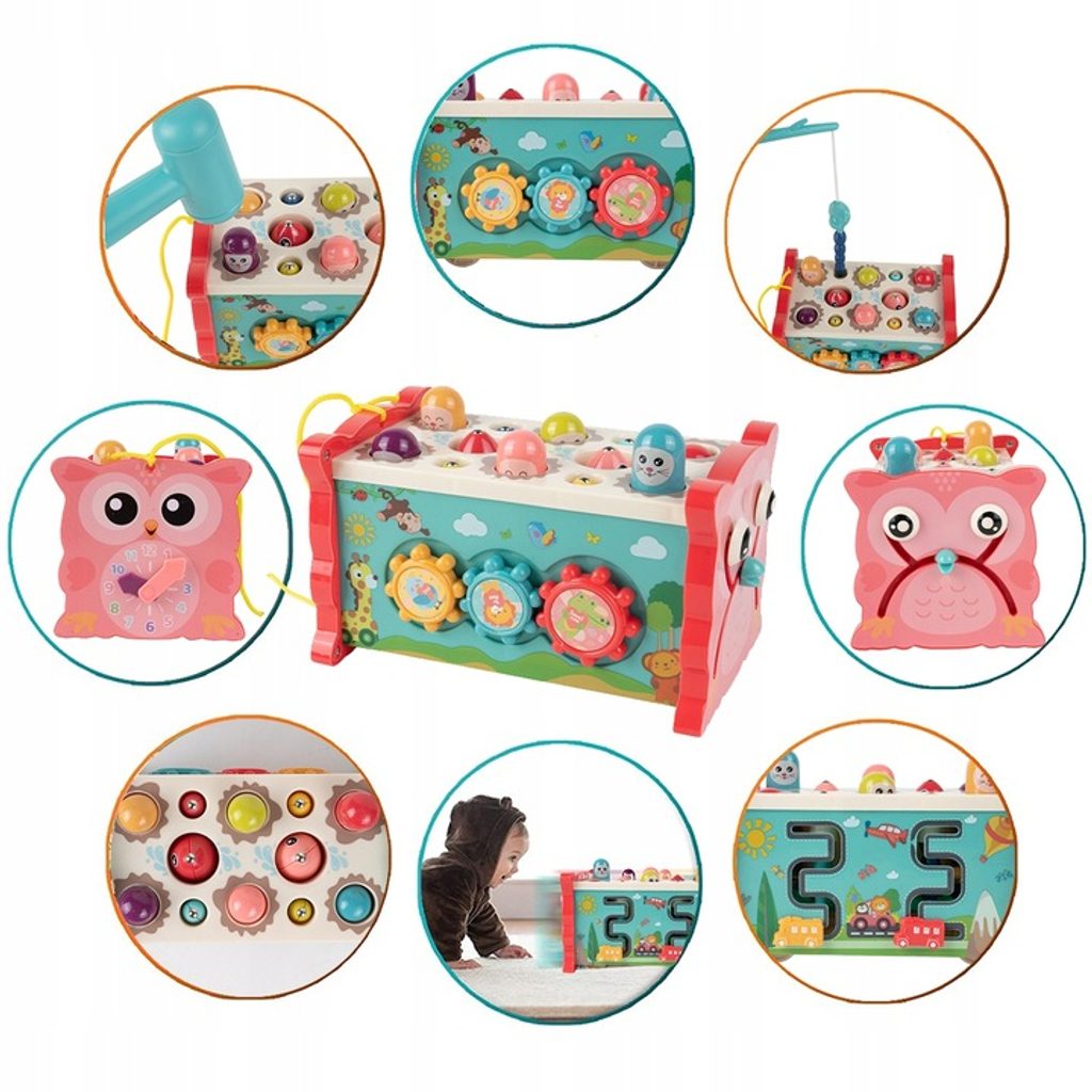 Magická edukační kostka 8v1 je ideální hračkou pro rozvoj koordinace oko-ruka, manuální zručnosti, motoriky a rozpoznávání barev. V horní části je umístěno zatloukání krtků, kdy zatlučením jednoho se další vysune, lovení rybiček a červíků. Na dalších stranách je bludiště, ozubená kolečka, hodiny a sovička s pohyblivými elementy. V předu je šňůrka pro tažení hračky. Hračka je určena pro děti od 18 měsíců věku.