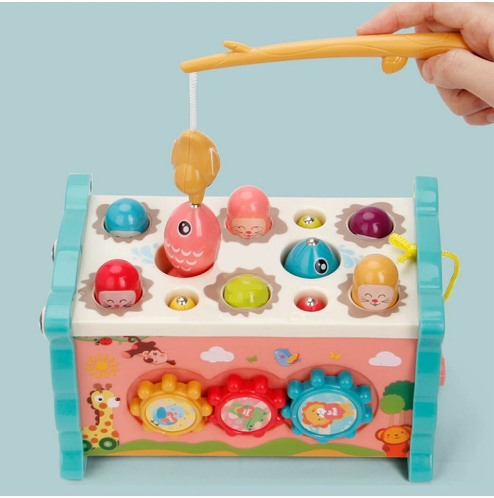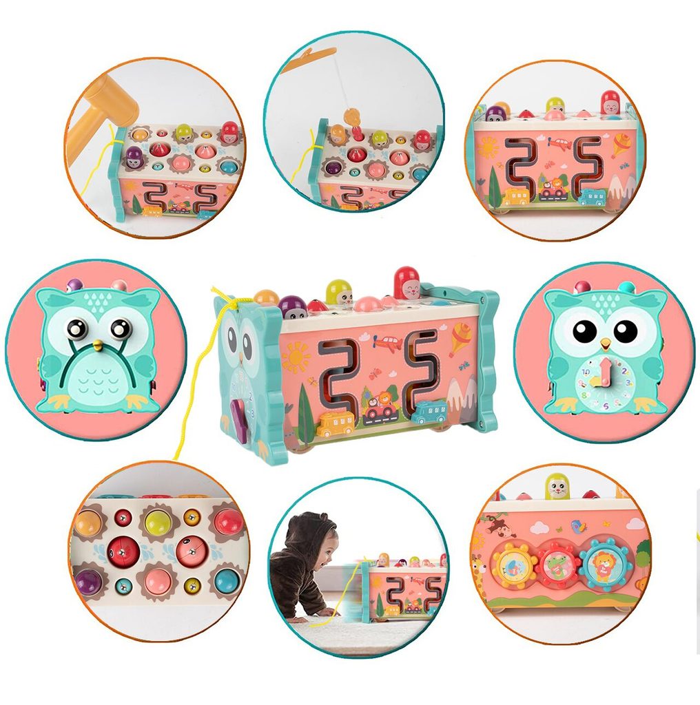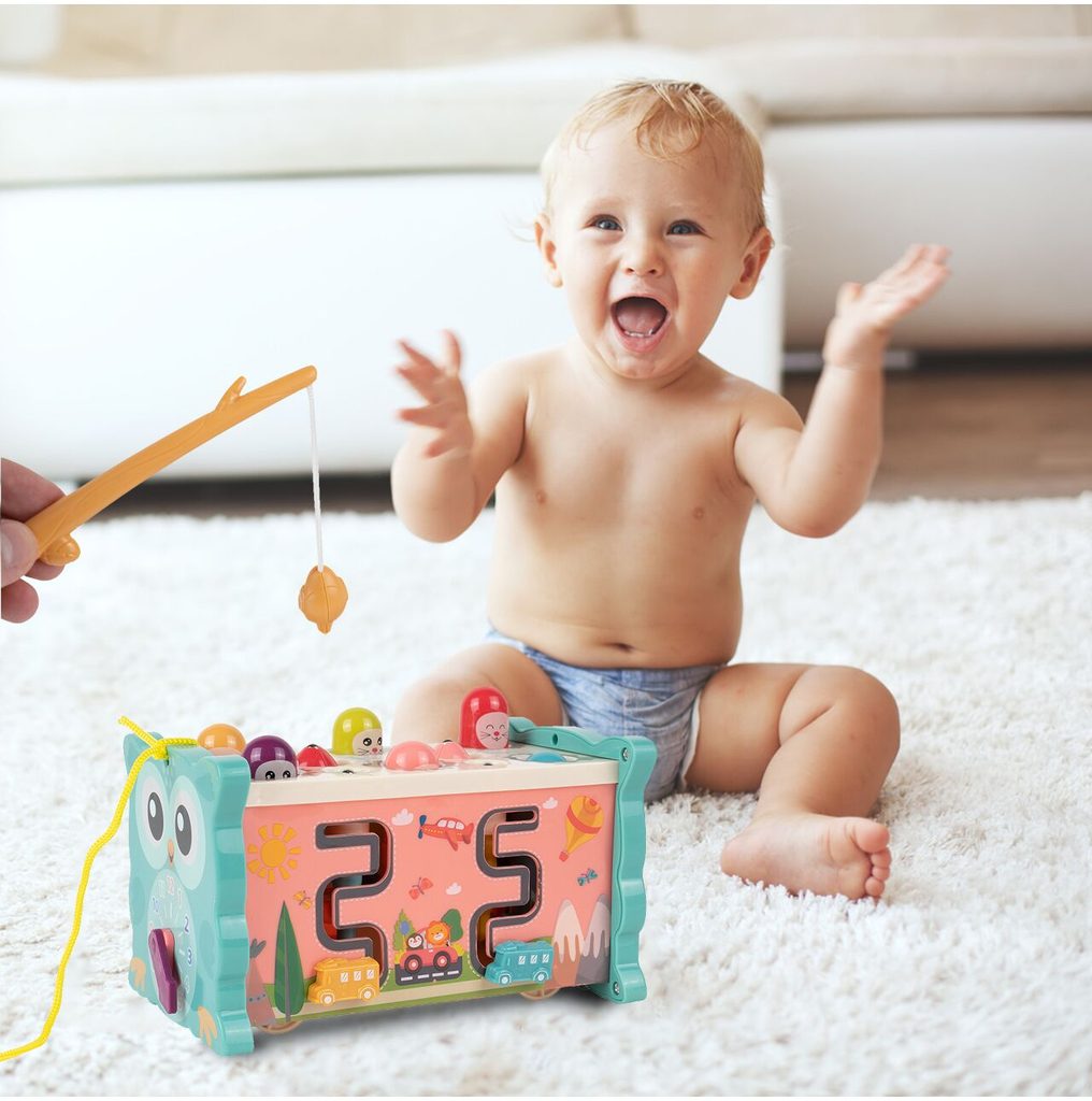 Magická edukační kostka 8v1 je ideální hračkou pro rozvoj koordinace oko-ruka, manuální zručnosti, motoriky a rozpoznávání barev. V horní části je umístěno zatloukání krtků, kdy zatlučením jednoho se další vysune, lovení rybiček a červíků. Na dalších stranách je bludiště, ozubená kolečka, hodiny a sovička s pohyblivými elementy. V předu je šňůrka pro tažení hračky. Hračka je určena pro děti od 18 měsíců věku.