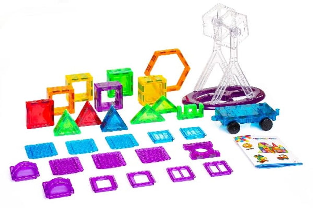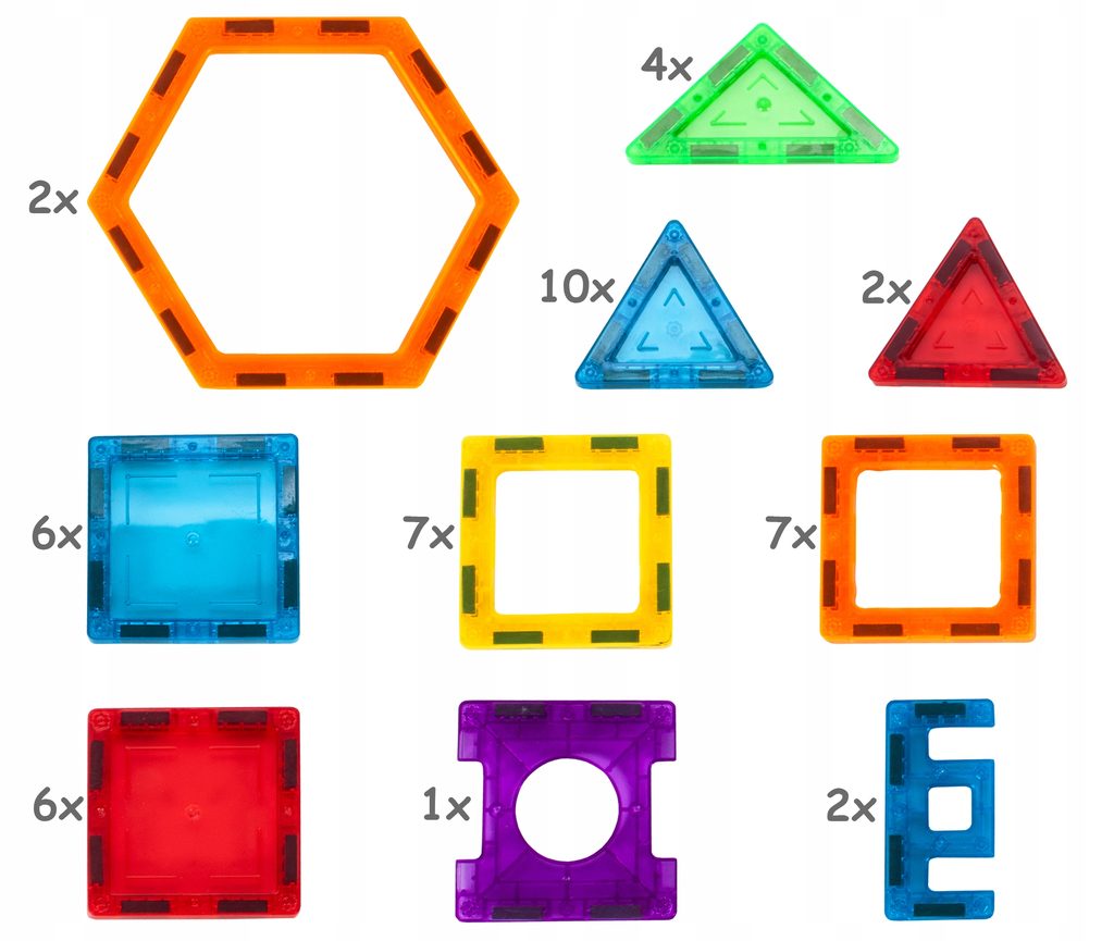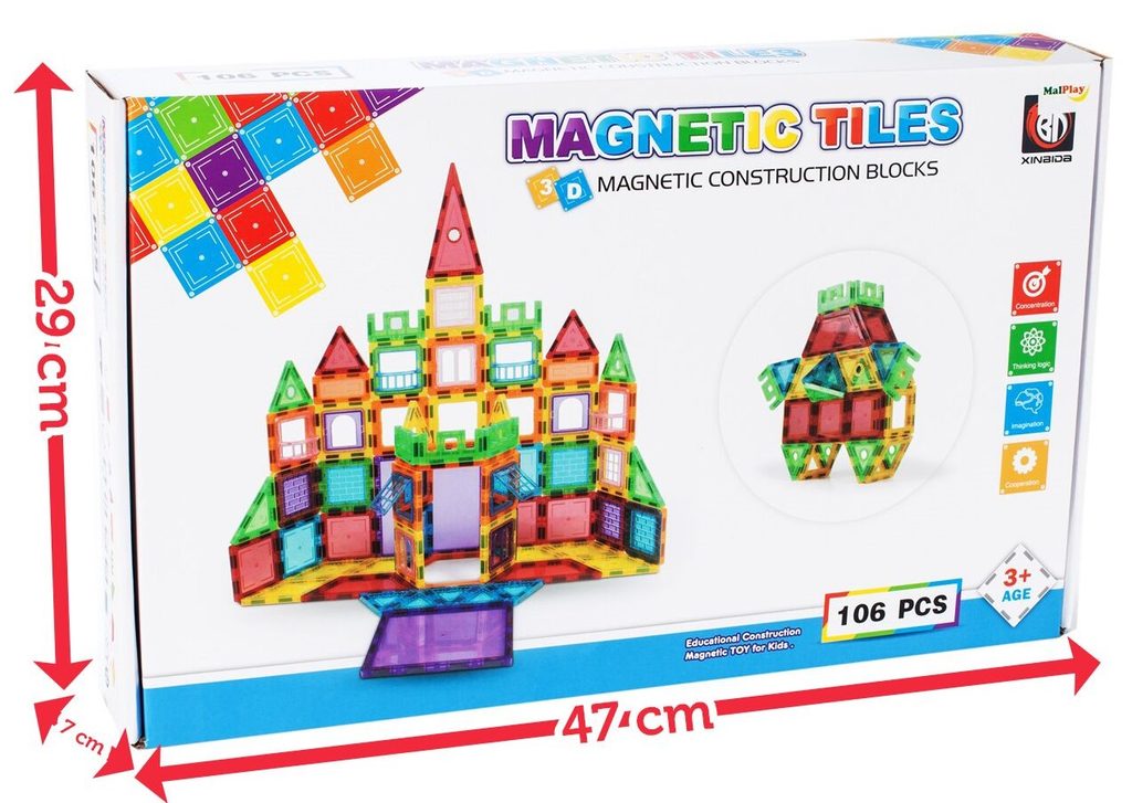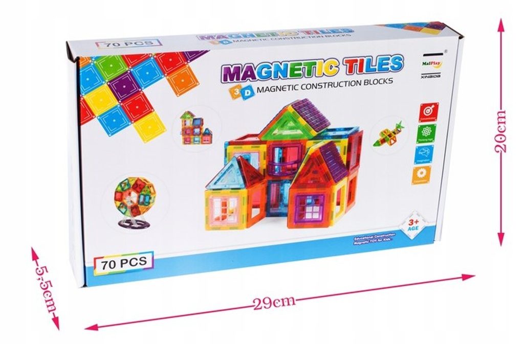 Barevná magnetická stavebnice Magnetic Tiles je ideální hračkou pro všechny malé konstruktéry. Skládá se z celkem 70 součástí jako jsou čtverce, trojúhelníky, obdélníky, šestiúhelníky a další prvky. Všechny součásti se velmi snadno propojují a vytváří z nich různé konstrukce. Hračka je určena pro děti od 3 let věku.