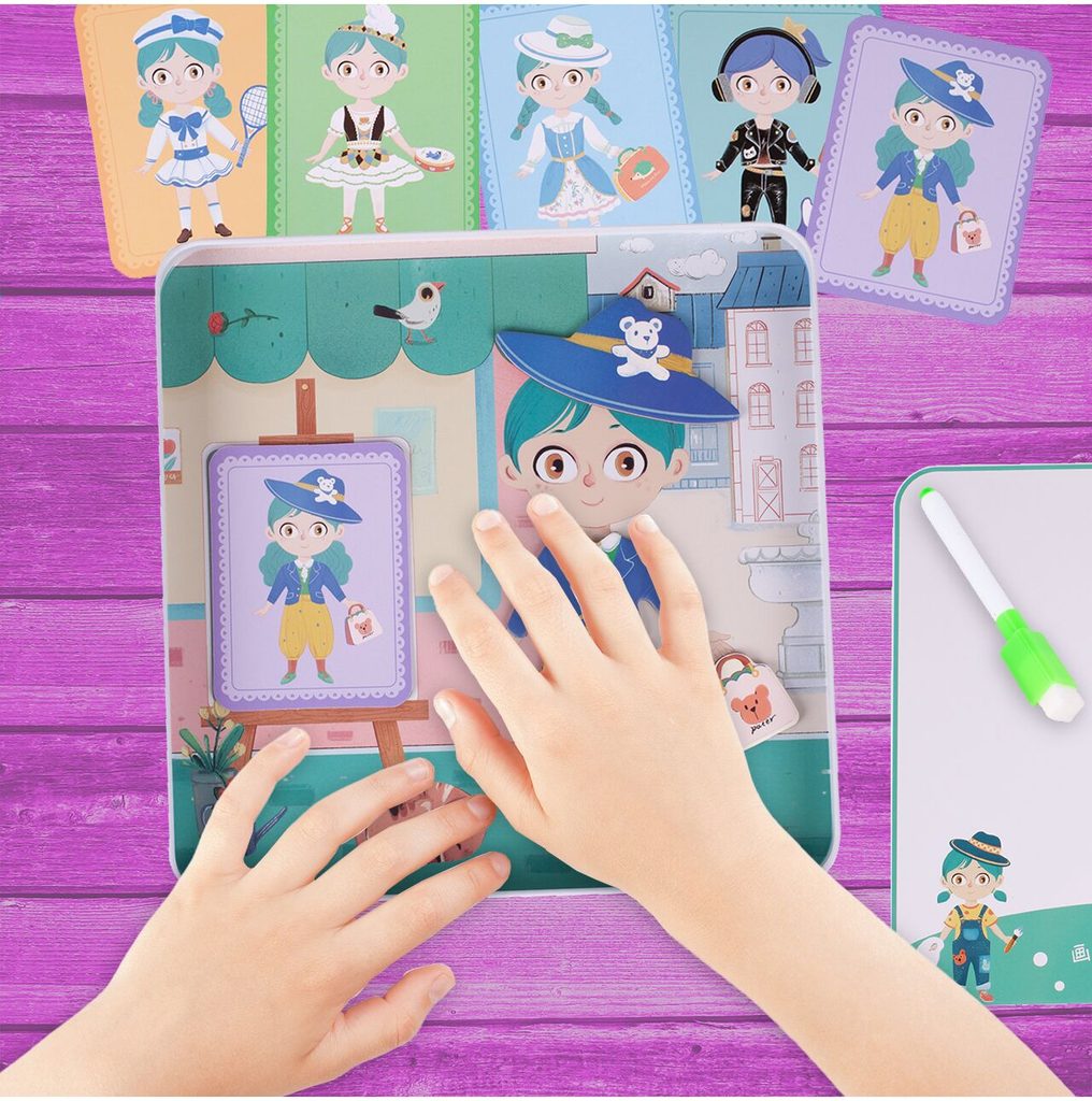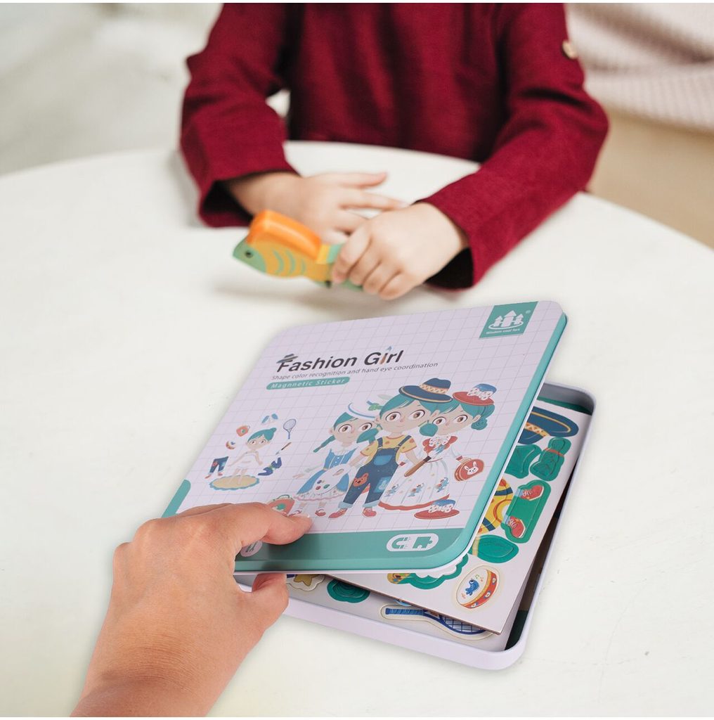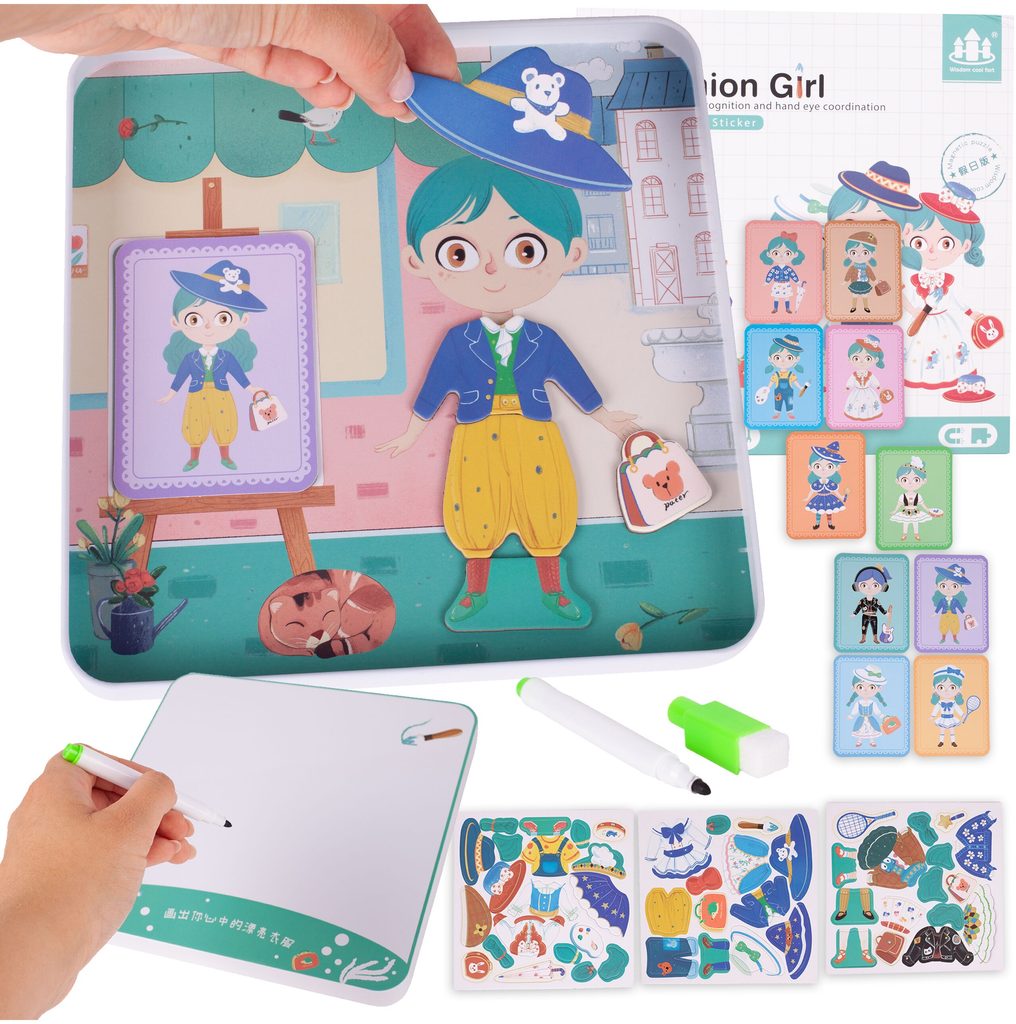 Tato sestava obsahuje různé prvky, které přinášejí zábavu a možnosti pro kreativní projev. Hlavním prvkem je kovová krabička, která slouží jako praktický a stylový obal pro všechny součásti sestavy. Krabička je dostatečně pevná a odolná, aby uchovávala veškeré prvky v bezpečí. Jedním z klíčových prvků této sestavy je suchem mazatelný popisovač. K dispozici je také 5 oboustranných karet, které slouží jako inspirace pro vaši kreativitu. Na každé kartě najdete ukázkový styling, který můžete použít při tvorbě scén a příběhů na magnetické tabulce. Tyto karty vám poskytnou nápady a podněty, které můžete dále rozvíjet a přizpůsobit podle svých představ. Celkem je k dispozici 62 kusů magnetek.