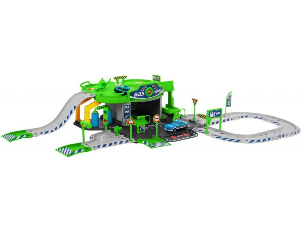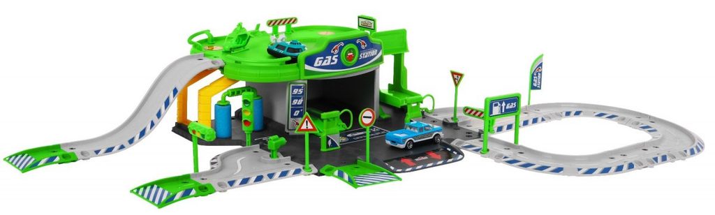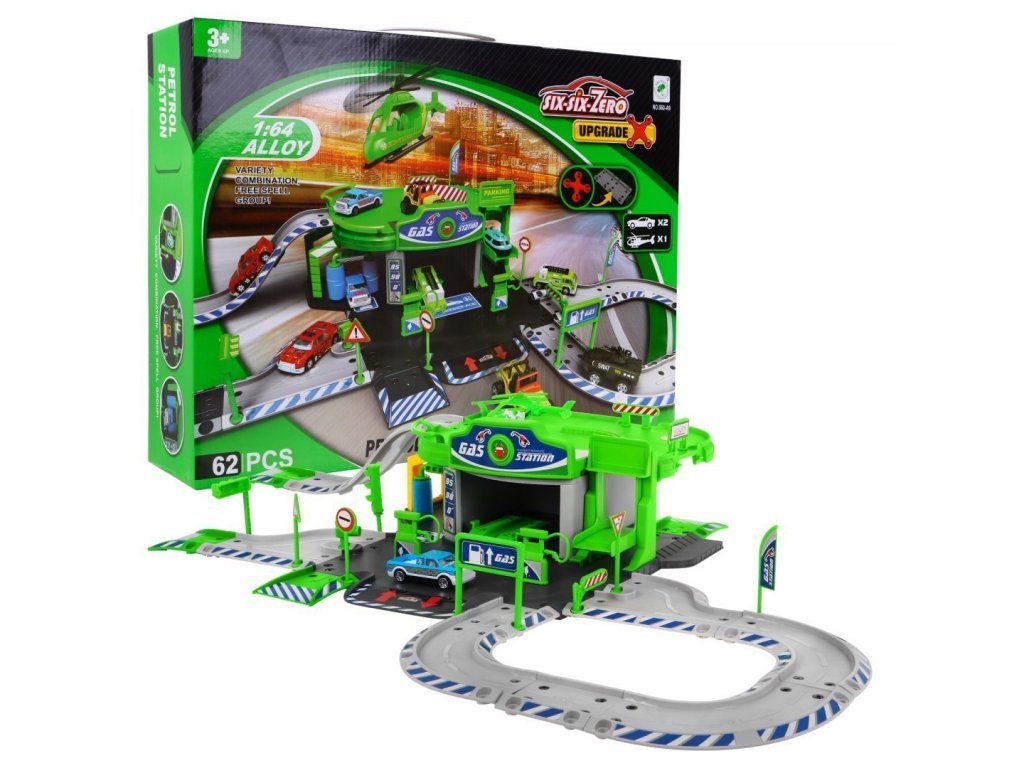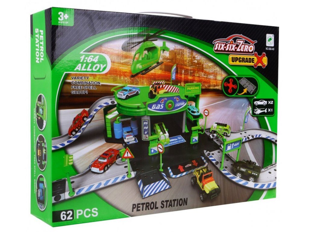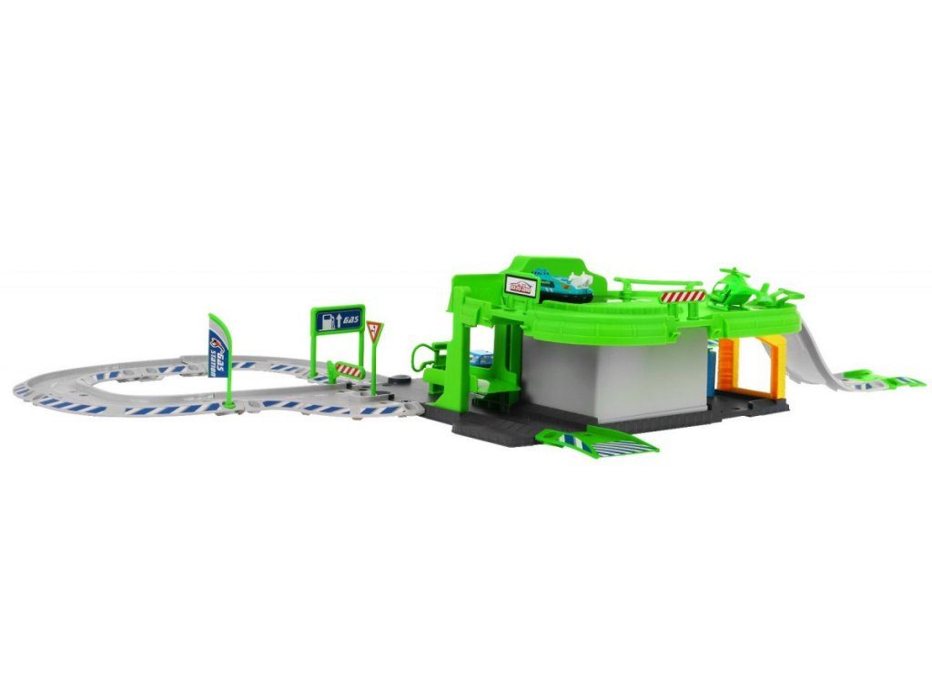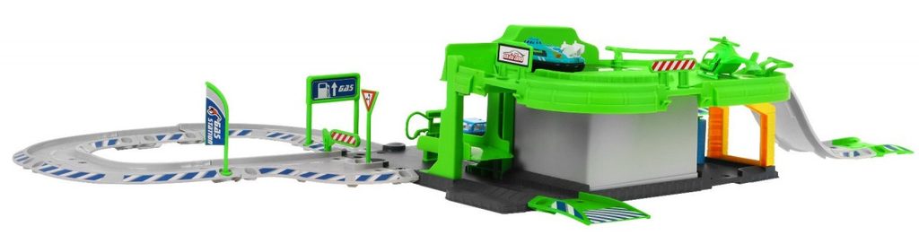 Kompletně vybavená benzínová pumpa s dráhou a přistávací plochou. Součástí balení jsou 2 autíčka, helikoptéra a barevné samolepky. Celkem se sada skládá ze 62 součástí. Dítě zde najde dopravní značky, benzínové stojany, montážní rampu, závoru, myčku a další. Hračka je určena pro děti od 3 let věku.