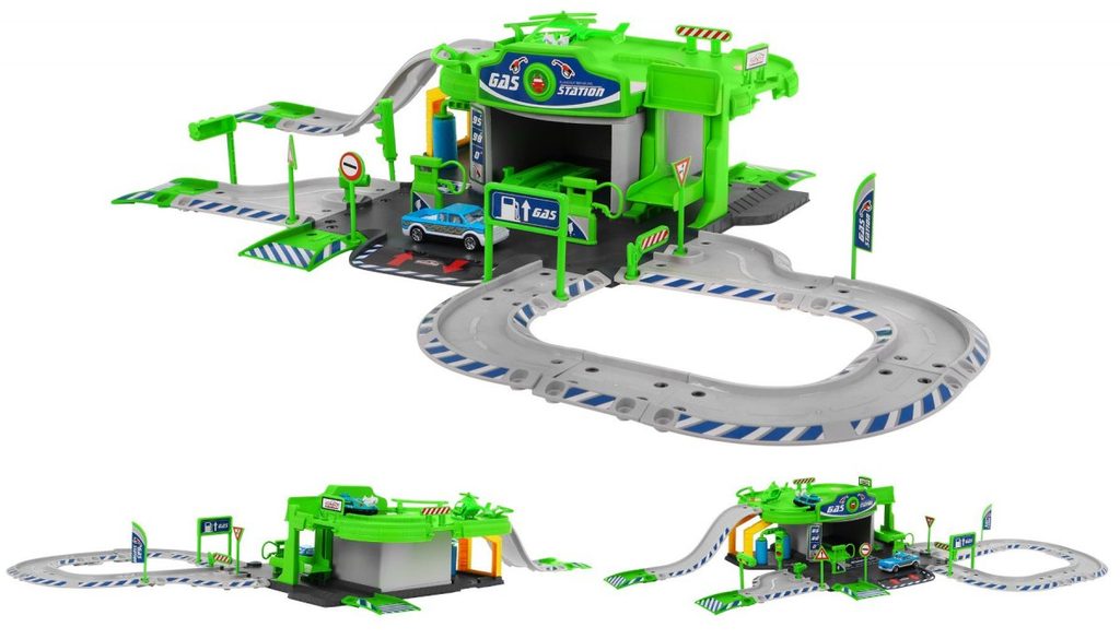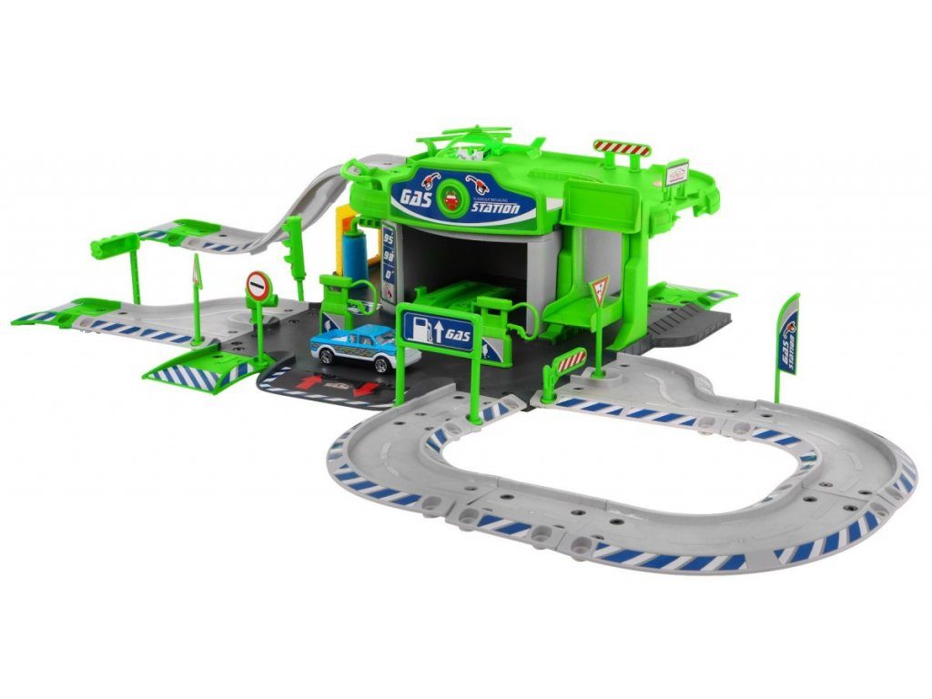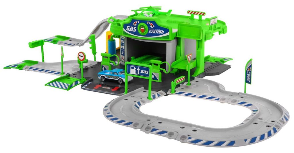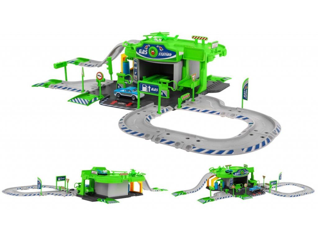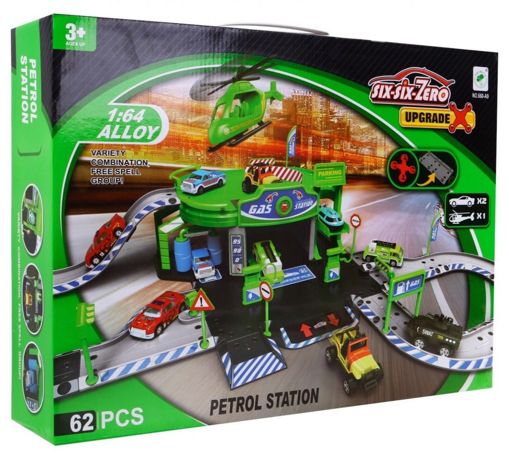 Kompletně vybavená benzínová pumpa s dráhou a přistávací plochou. Součástí balení jsou 2 autíčka, helikoptéra a barevné samolepky. Celkem se sada skládá ze 62 součástí. Dítě zde najde dopravní značky, benzínové stojany, montážní rampu, závoru, myčku a další. Hračka je určena pro děti od 3 let věku.