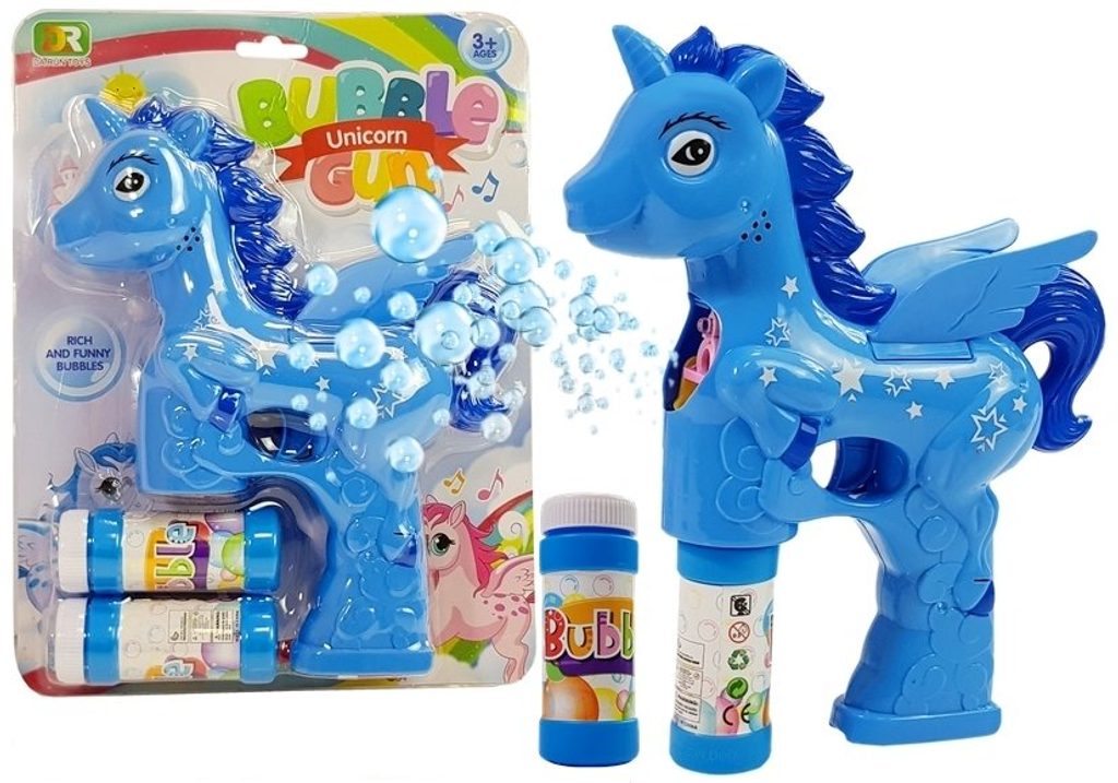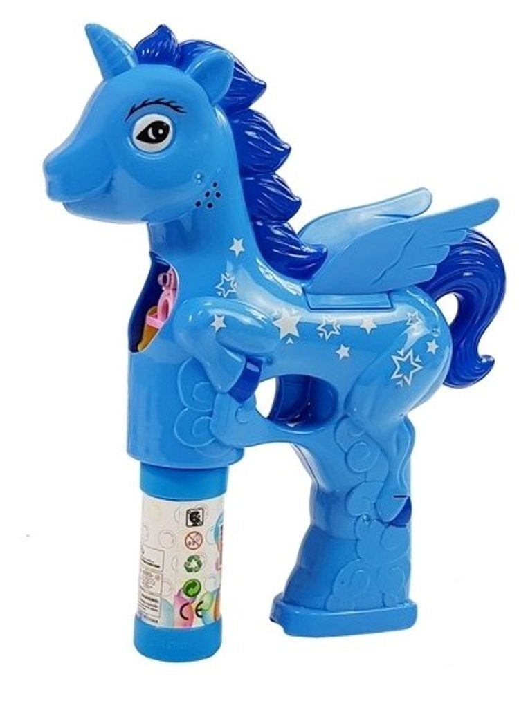 Dětský bublifuk ve tvaru modrého jednorožce dokáže vytvořit nekonečné množství bublin. Nejdříve je třeba nasadit lahvičku s mýdlovým roztokem přímo do bublifuku. Zmáčknutím spouště se spouští generátor bublin za současného zvuku řehtání. Po ukončení hry je třeba lahvičku z bublifuku demontovat a otřít ho suchým hadříkem. Hračka je vyrobena z plastu a je určena pro děti od 36 měsíců věku.