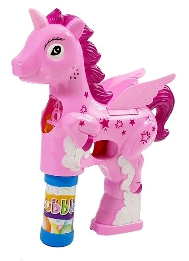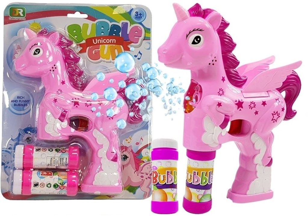 Dětský bublifuk ve tvaru růžového jednorožce dokáže vytvořit nekonečné množství bublin. Nejdříve je třeba nasadit lahvičku s mýdlovým roztokem přímo do bublifuku. Zmáčknutím spouště se spouští generátor bublin za současného zvuku řehtání. Po ukončení hry je třeba lahvičku z bublifuku demontovat a otřít ho suchým hadříkem. Hračka je vyrobena z plastu a je určena pro děti od 36 měsíců věku.